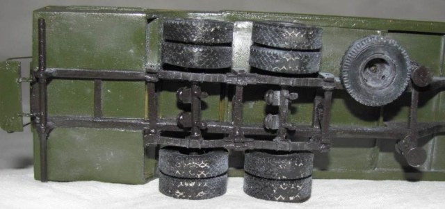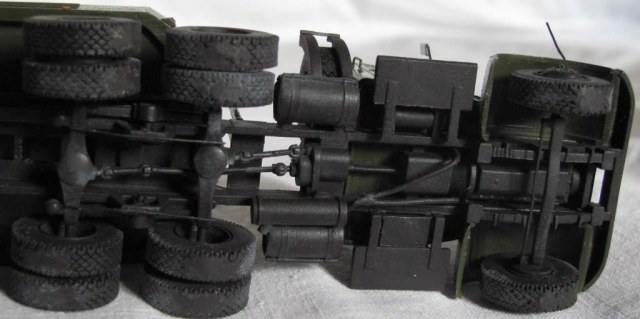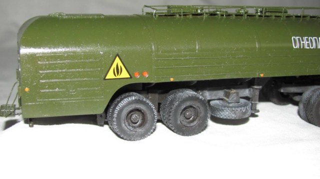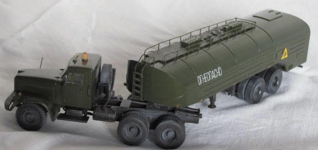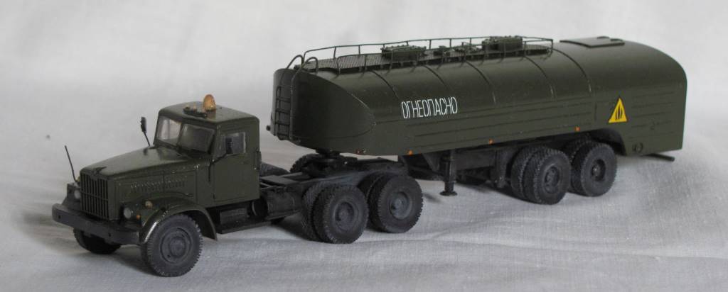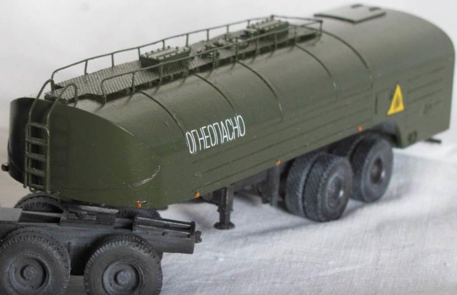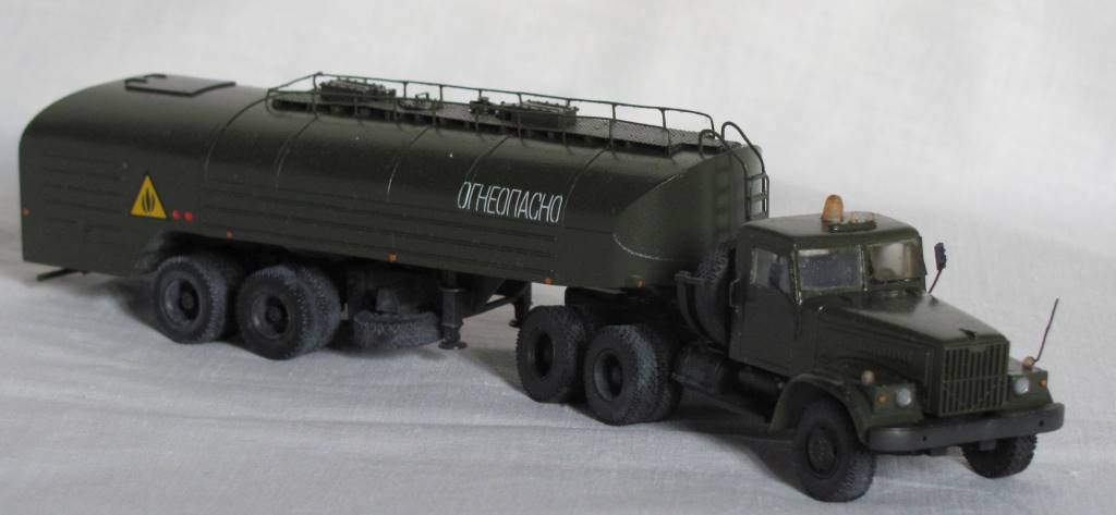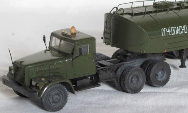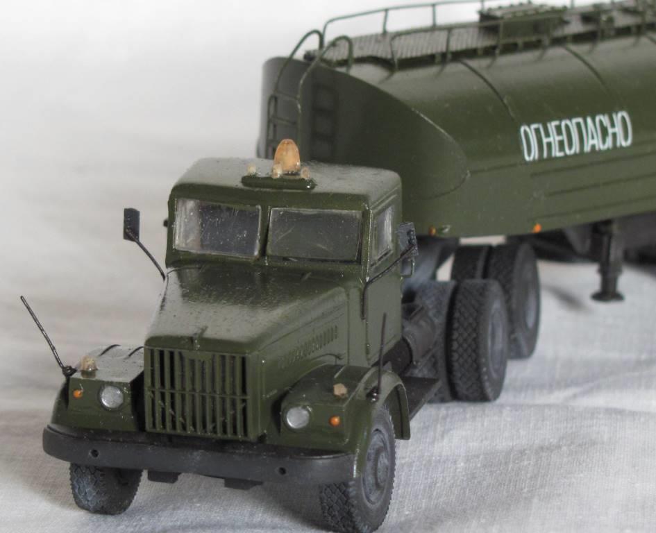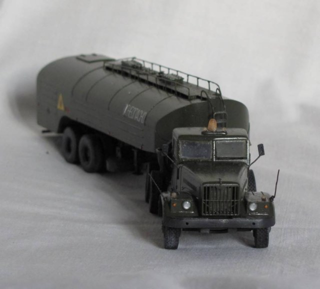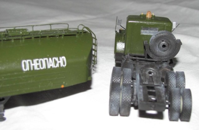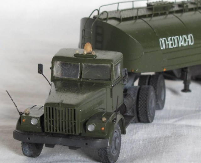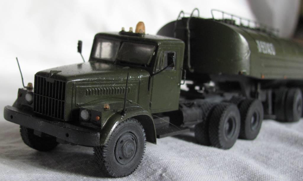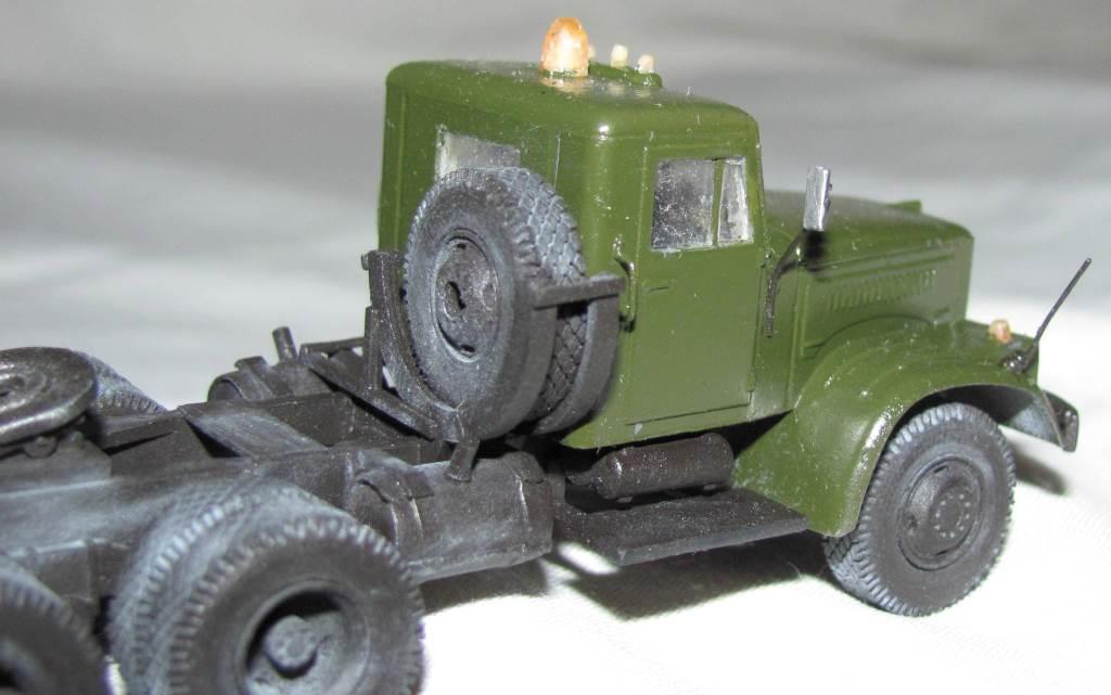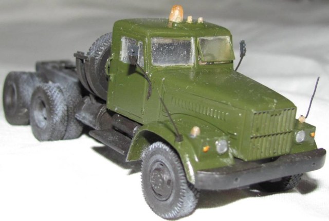 собирал из коробки. световую сделал из зажигалки, поручни и стойки зеркал из проволоки, тягач немного укорочен, добавил усы габаритов и заново изготовил топливные баки. модель окрашена акрилом Акан, запылена пастелью. окраска собирательный образ