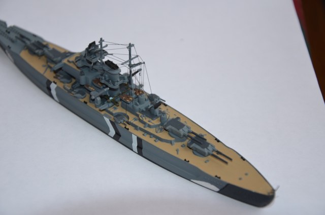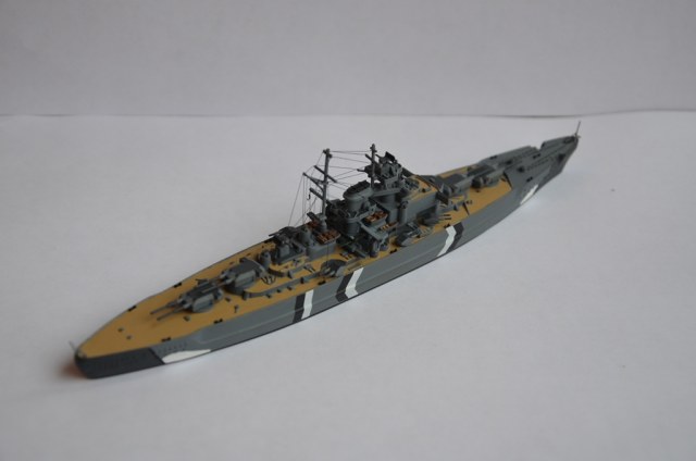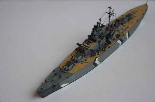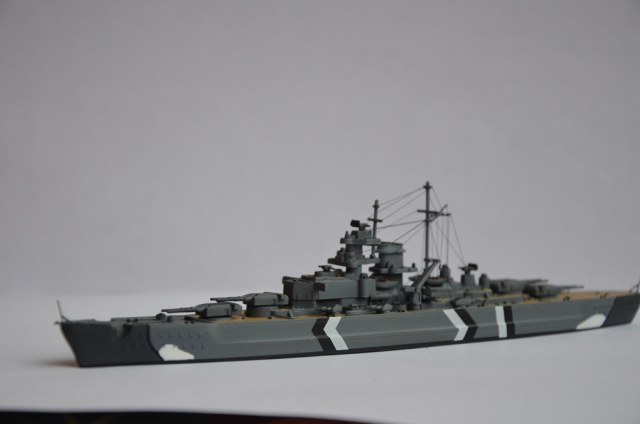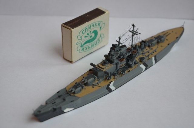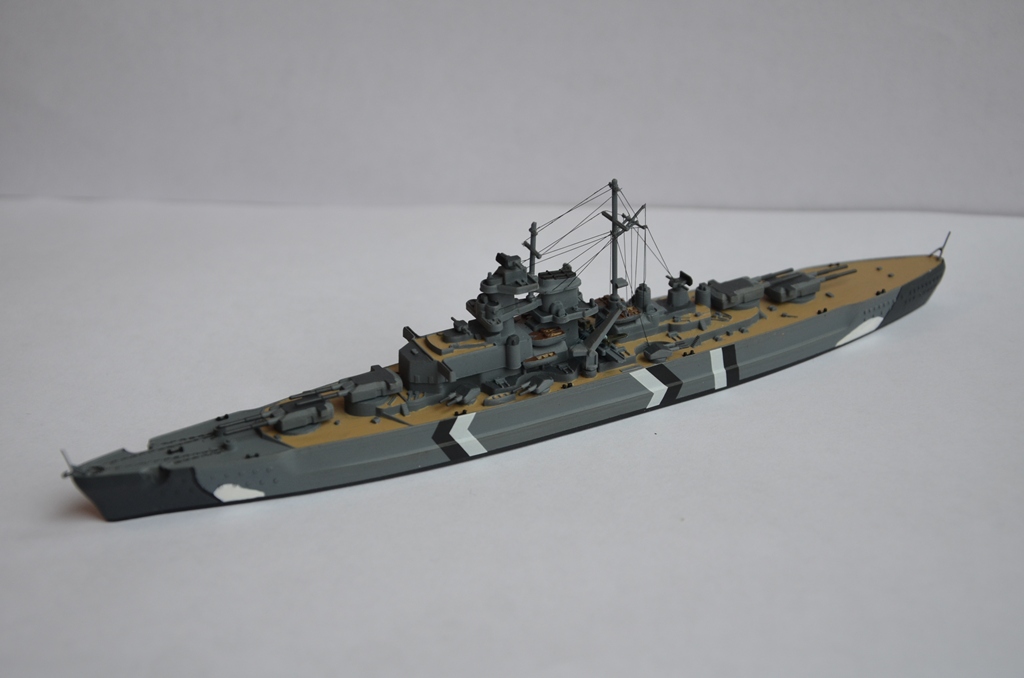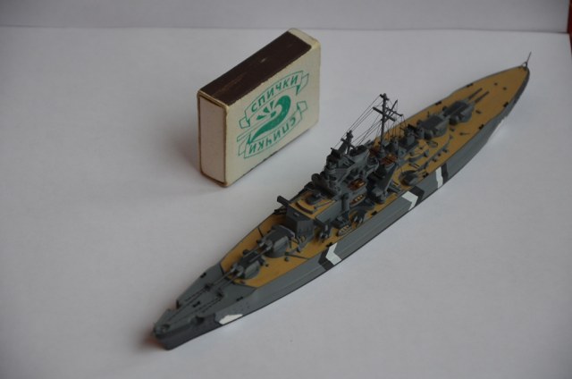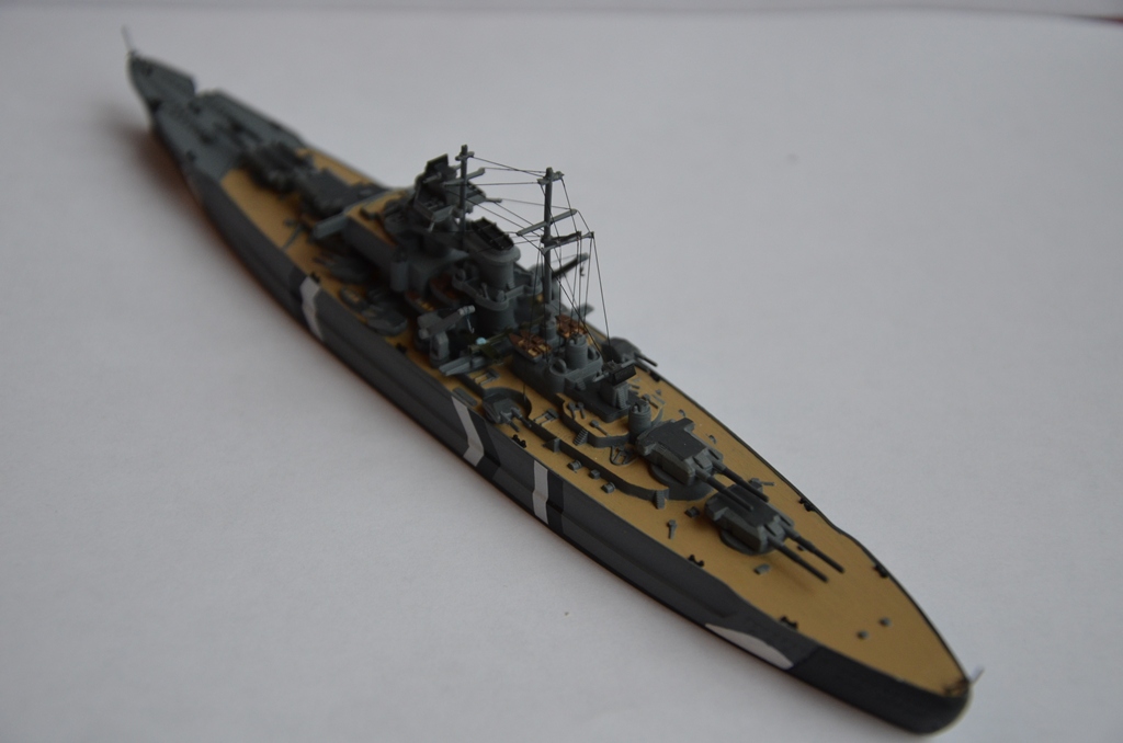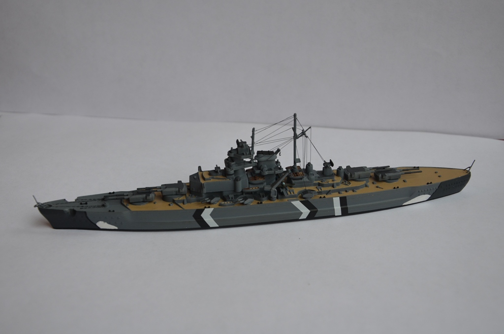 Я сам как-то в далекие времена баловался с таким масштабом. Собрал "Рому" и "Шарнхорст"... посмотрел на них... и отдал в выставочный зал "Хобби-центра", где их почти сразу кто-то купил. По-моему мнению делать такие модели "из коробки" нет смысла - они значительно менее зрелищны (деталировка слабая ,относительно грубая и немасштабная)и точны чем их собратья в 700-м масштабе, а места занимают не намного меньше... Хочу добавить еще то, что кормовые полосы камуфляжа даны в искаженном виде - угол наклона полос от палубы к ватерлинии должен быть более острым... С замечаниями коллег согласен. Можно еще немного "поколдовать" с моделью...