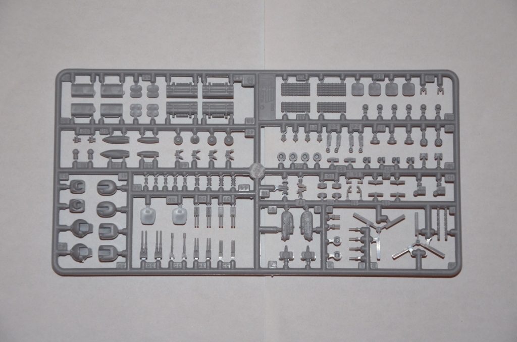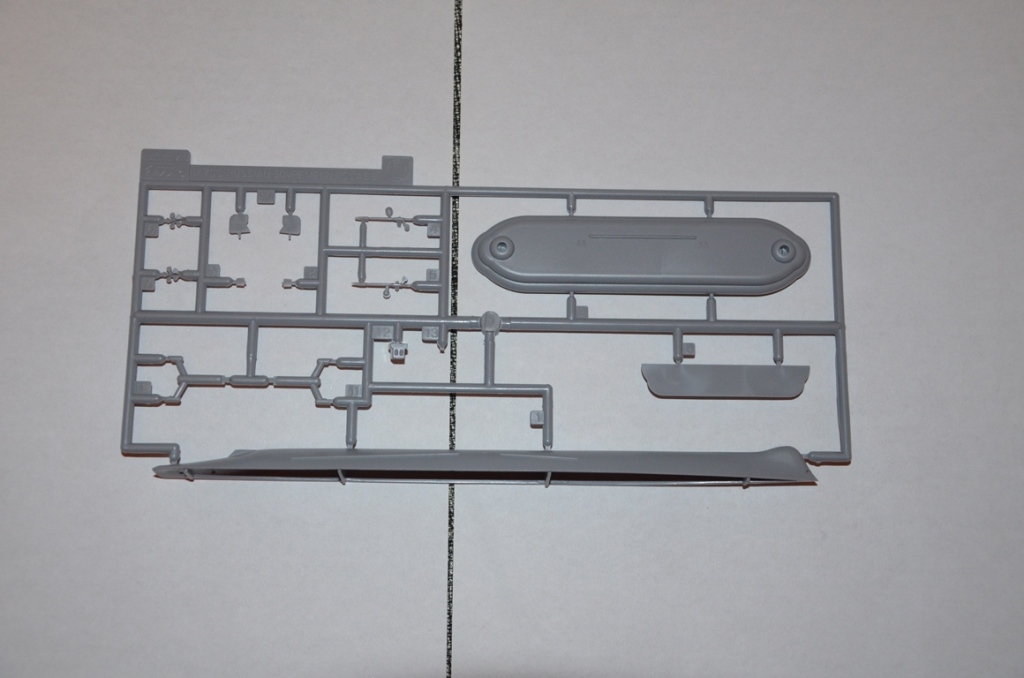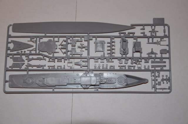 Видим те же три литника с деталями, 2 варианта сборки - waterline и полноразмерная. Описывать литники, надеюсь, не надо - все знакомы с Драгоновским эсминцем. Отличие только в том, что они не упакованы в пакеты, а просто лежат в коробке. Скорее всего Звезда выкупила пресс-формы. На литниках уже стоит штамп Звезды. Облоя на деталях нет, качество отливки хорошее, что опять же говорит о новых пресс-формах. Попробовал литник на зуб - пластмасса мягкая, хорошо поддается обработке.