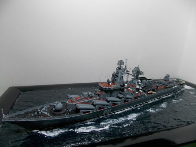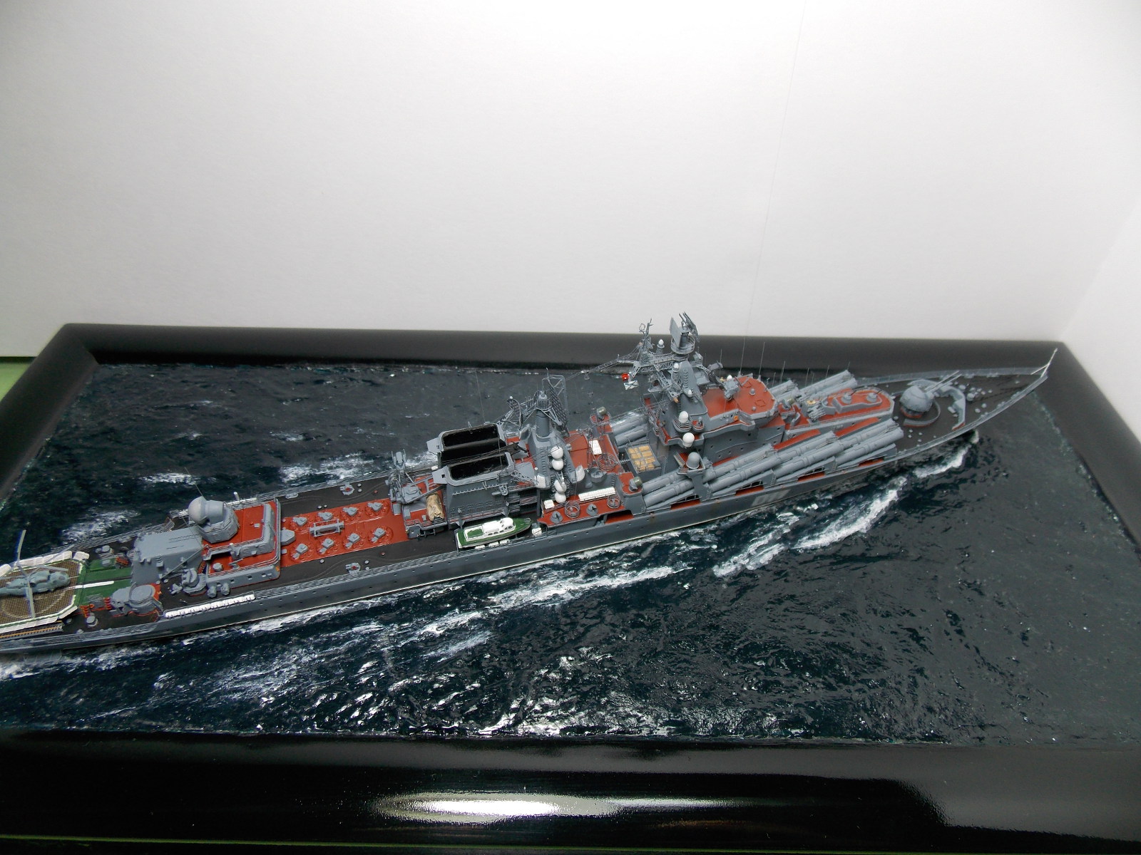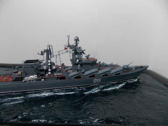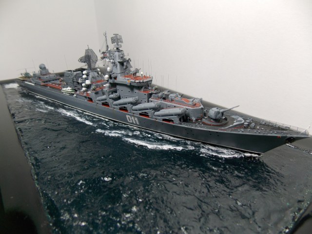 В работе использовал набор фототравления фирмы FLYHAWK MODEL (FH 700108) ,WEM rassian slava class missile cruiser 1/700 scale, наборы лестниц, трапов и скоб-трапов от North Star Models (NSA 700060), якорные цепи (NSA700064), иллюминаторы (NSA 700022), фигурки моряков от FH и вертолет от Trumpeter. Окраска кистью эмалями Tamiya. Из доработок: заменены АУ АК-630, РЛС МР-123 на АУи РЛС фирмы "Комбриг", точеные стволы на АУ АК-130. Флаги и брезент -фольга, доработал вертолет, антенны - проволока, белые антенны над ГКП сделал сам, в наборе не имелись, РБУ-6000 - по методу Алексея Никитина, доработок много, перечислять все не буду.... Море - акриловая шпатлевка, художественные краски, акриловый гель, лак на водной основе. Стыкуемость набора хорошая.