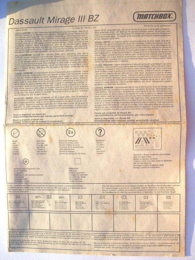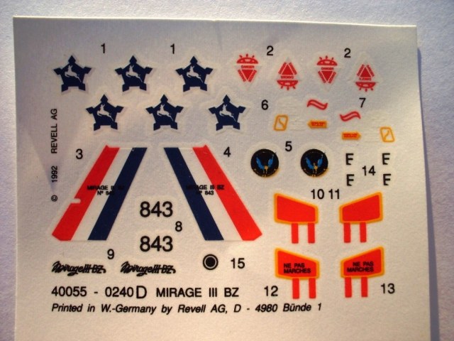 Как следует из штампа на литнике модель датирована 1973 годом (старше меня на 11 лет). Но несмотря на это модель имеет сравнительно неплохую детализацию. Во всяком случае в отличии от также "винтажной" модели НОВО "многоцелевой истребитель Mirage IIIE/O" в ней даётся имитация двигателя ATAR. Кроме того стойки шасси выполнены более копийно, фонарь радует своей прозрачностью, облоя практически нет. Декаль неплоха, практически все заметные на фотографиях реального самолета элементы воспроизведены.