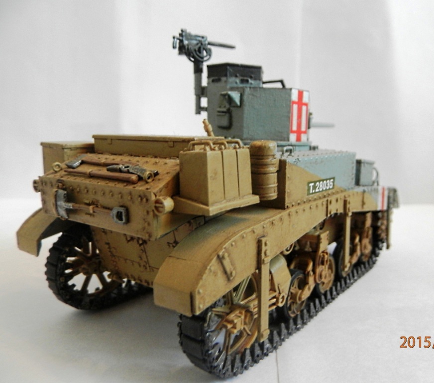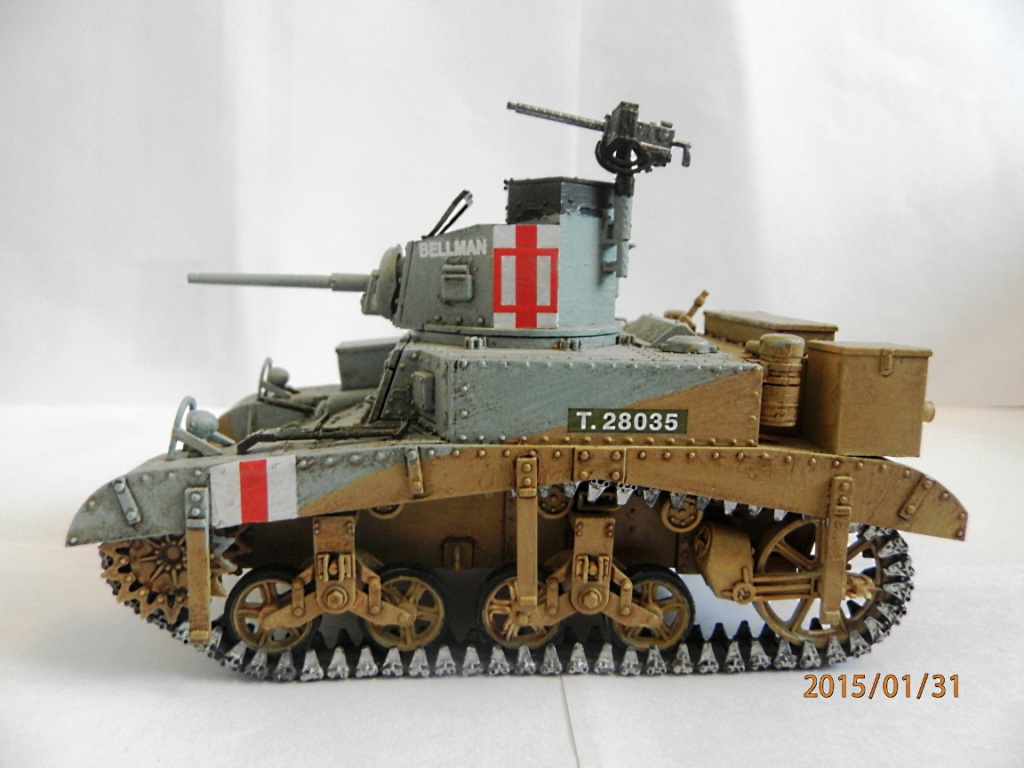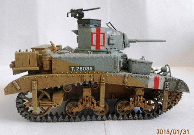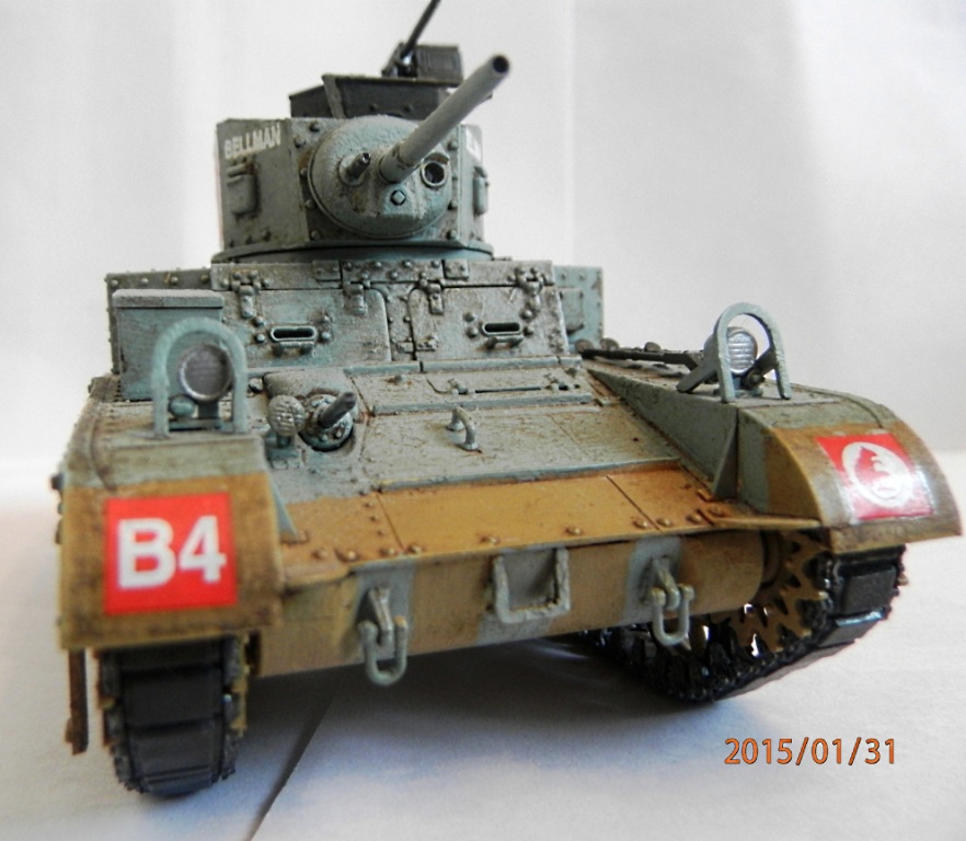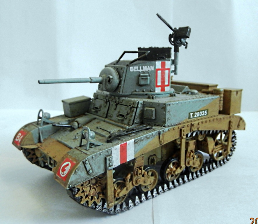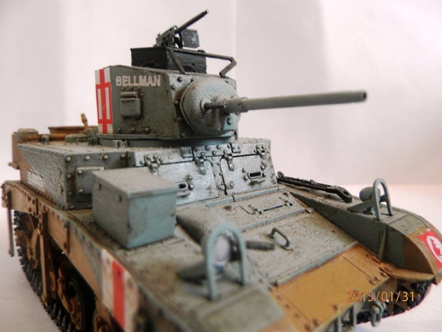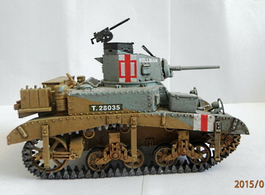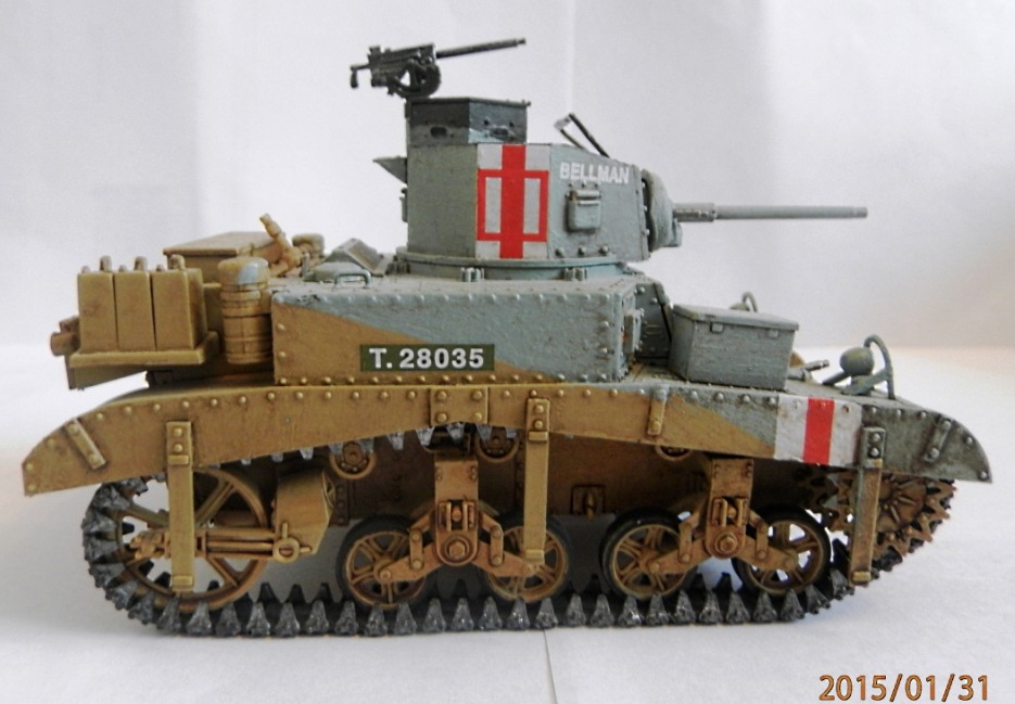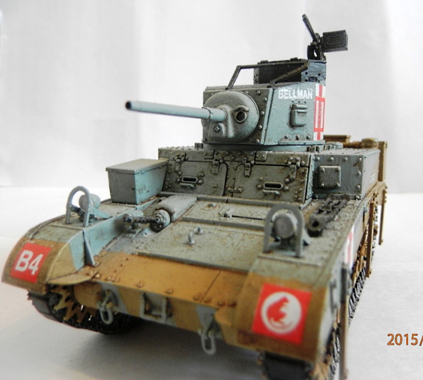 уважаемый,если вы беретесь делать конкретную,таки сказать "именную модель" типа BELLMAN то просто ориентируйтесь на фото а не руководство от солидной АКАДЕМИ. ну типа номерок Т28037 и к примеру расположение "заглушек" курсовых пулеметов.Так же если мне не изменяет память-на крыше МТО производитель дает не верное расположение камуфляжа.На ранних стадиях Африканской компании англичане применяли весьма своеобразный камуфляж, состоящий из тройной комбинации полей темно-земляного, сине-серого (Light Blue-gray) и песочного (Dеsert Yellow) цветов сходящихся в одну точку в кормовой части машины. Поля имели чёткие границы и наносились в строго установленном порядке по отношению к продольной оси машины вниз от точки схождения.Не подумайте что это попытка поумничать. просто дружеская подсказка.С уваж. О.