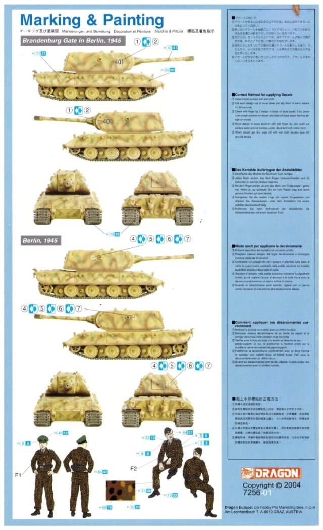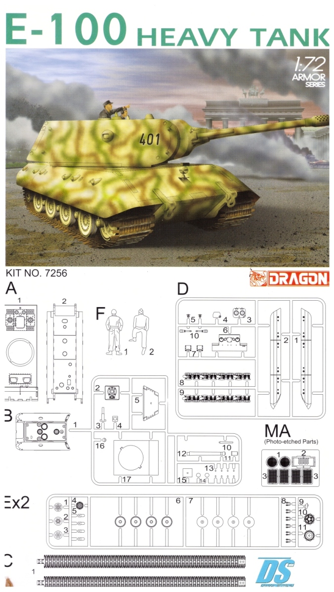 Предлагаю обзор бумажного танка Е-100. Обычная картонная коробка ни чем не отличающаяся от любых других коробок от Dragon, типография хорошая. Внутри находятся шесть пакетиков с литниками, гусеницами, фото травлением, декалью и двумя фигурами танкистов. Инструкция в фирменном стиле Dragon с качественной полиграфией и четкими изображениями процесса сборки на четырёх страницах. Качество литников качественное, на первый взгляд брака не обнаружил. Фигуры танкистов отлиты как будто из очень мягкого пластмасса, на ощупь мягкие и тянутся как резиновые.