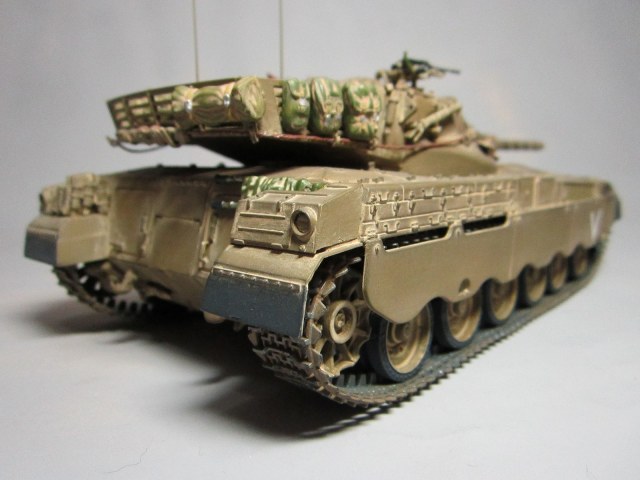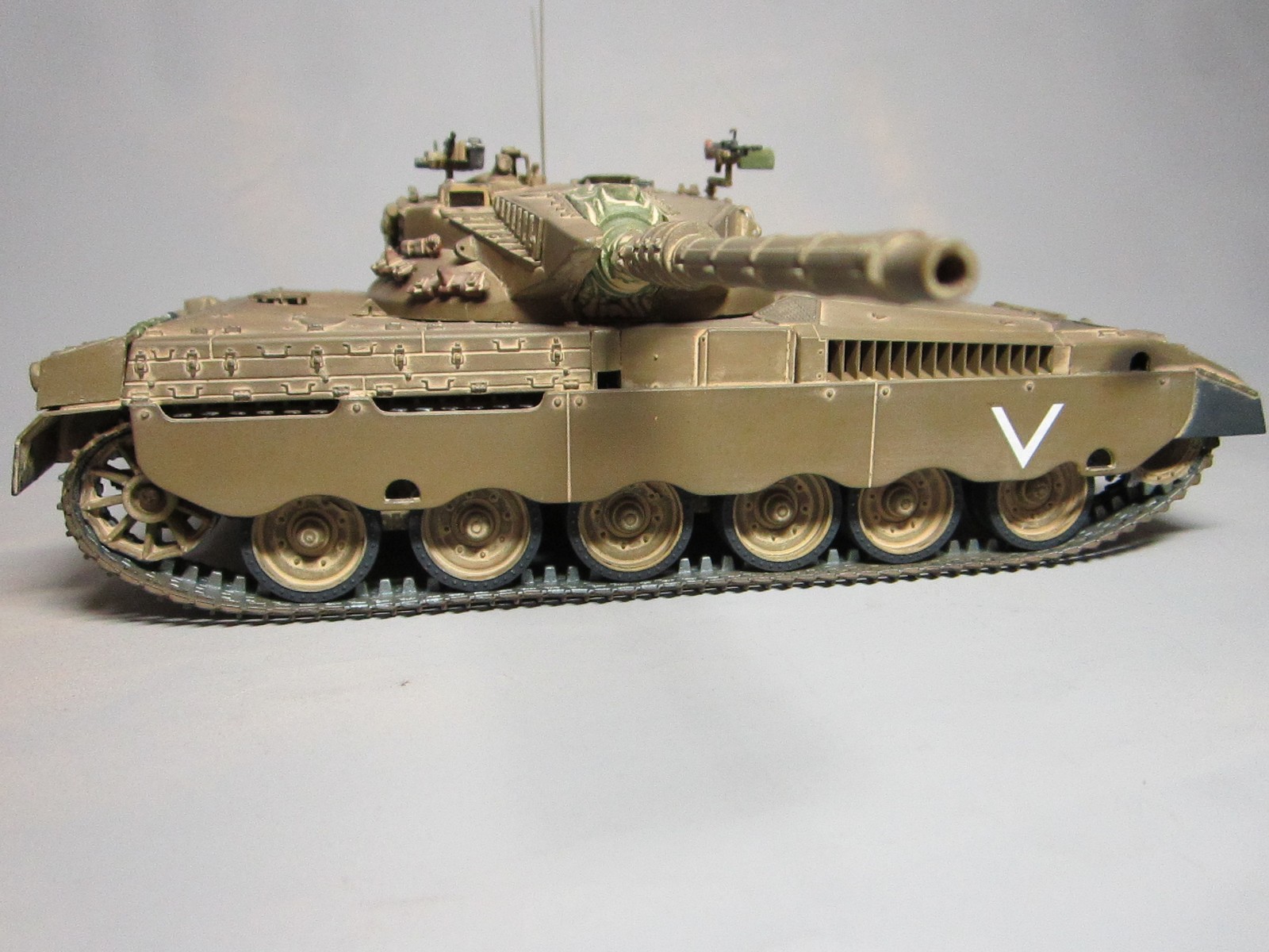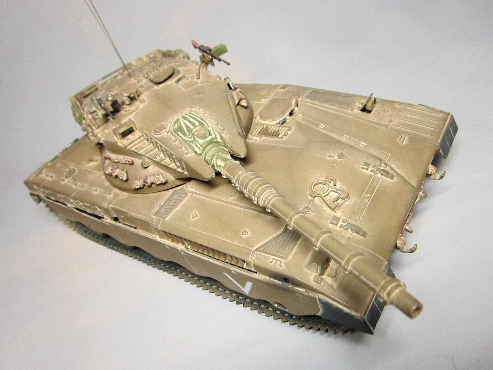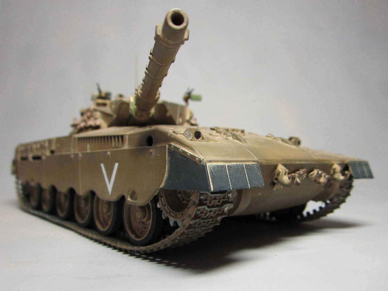 Модель малоизвестной китайской фирмы, которая, вероятно уже канула в лету... Собрана очень давно. Помню, что опорные катки крепились маленькими саморезами, которые были заменены на самодельные, отлитые из смолы крышки ступиц. Трос заменен на проволочный. В комплект еще входил минный трал, литники с деталями которого до сих пор хранятся в "закромах". Окраска - нитра, пыль - GIOTTO.