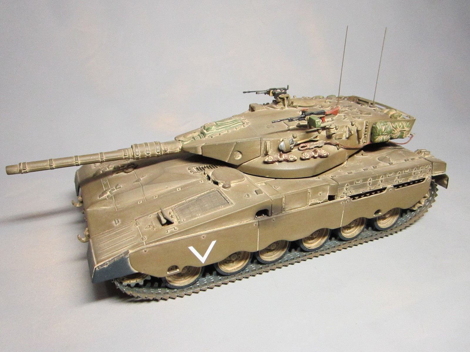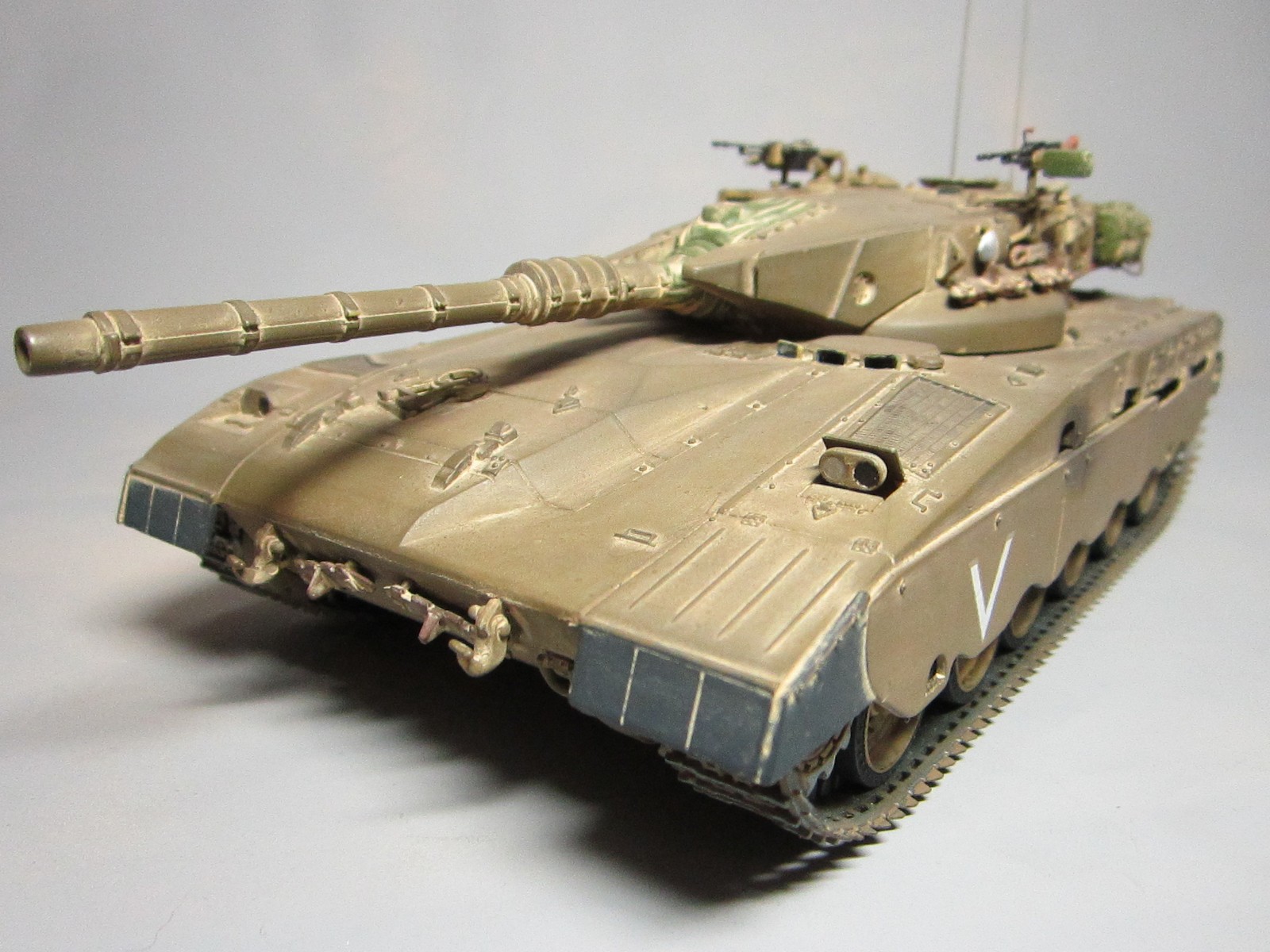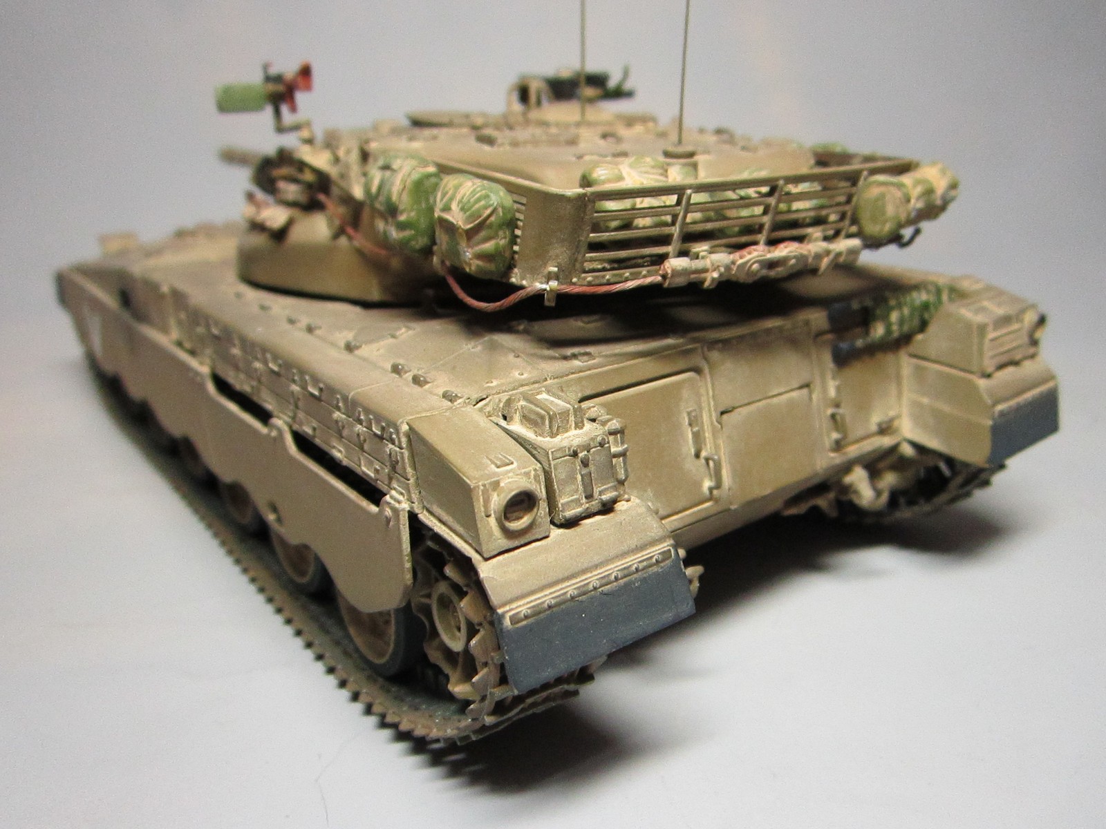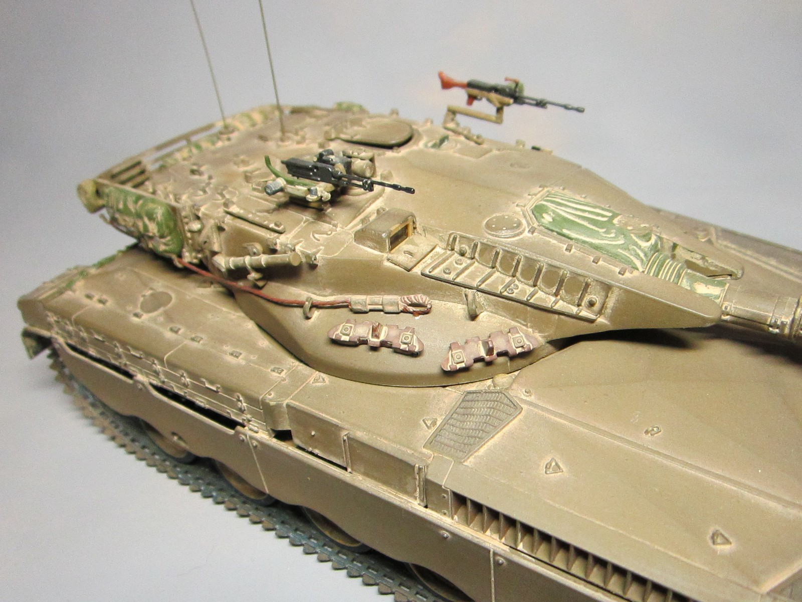 Модель малоизвестной китайской фирмы, которая, вероятно уже канула в лету... Собрана очень давно. Помню, что опорные катки крепились маленькими саморезами, которые были заменены на самодельные, отлитые из смолы крышки ступиц. Трос заменен на проволочный. В комплект еще входил минный трал, литники с деталями которого до сих пор хранятся в "закромах". Окраска - нитра, пыль - GIOTTO.