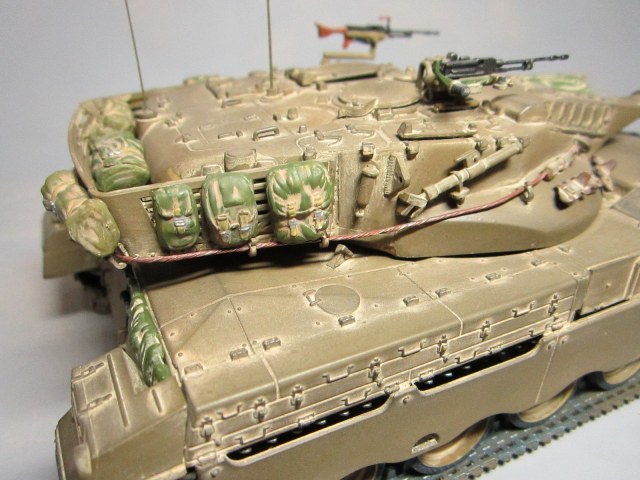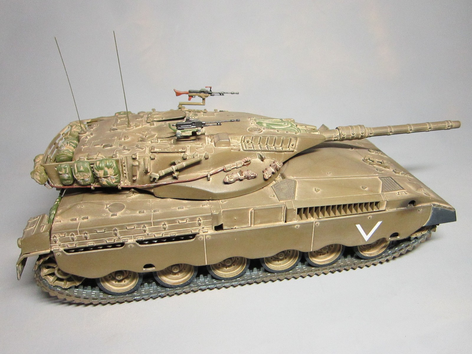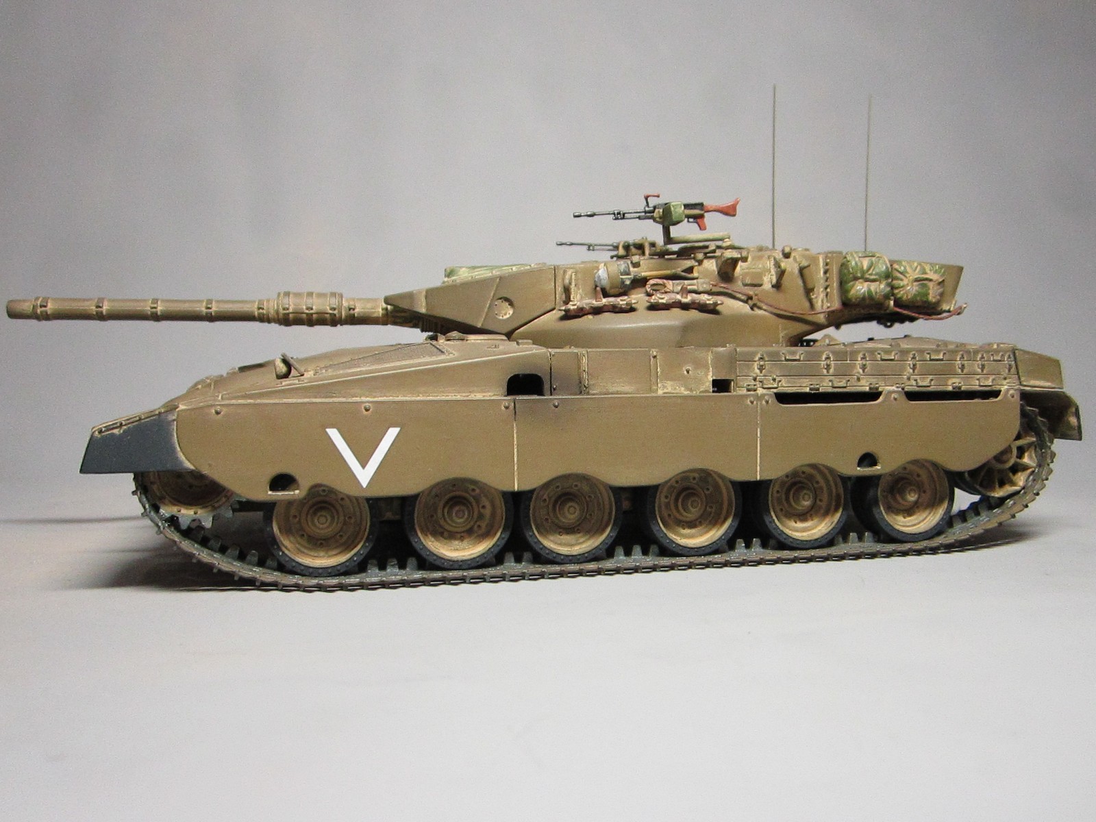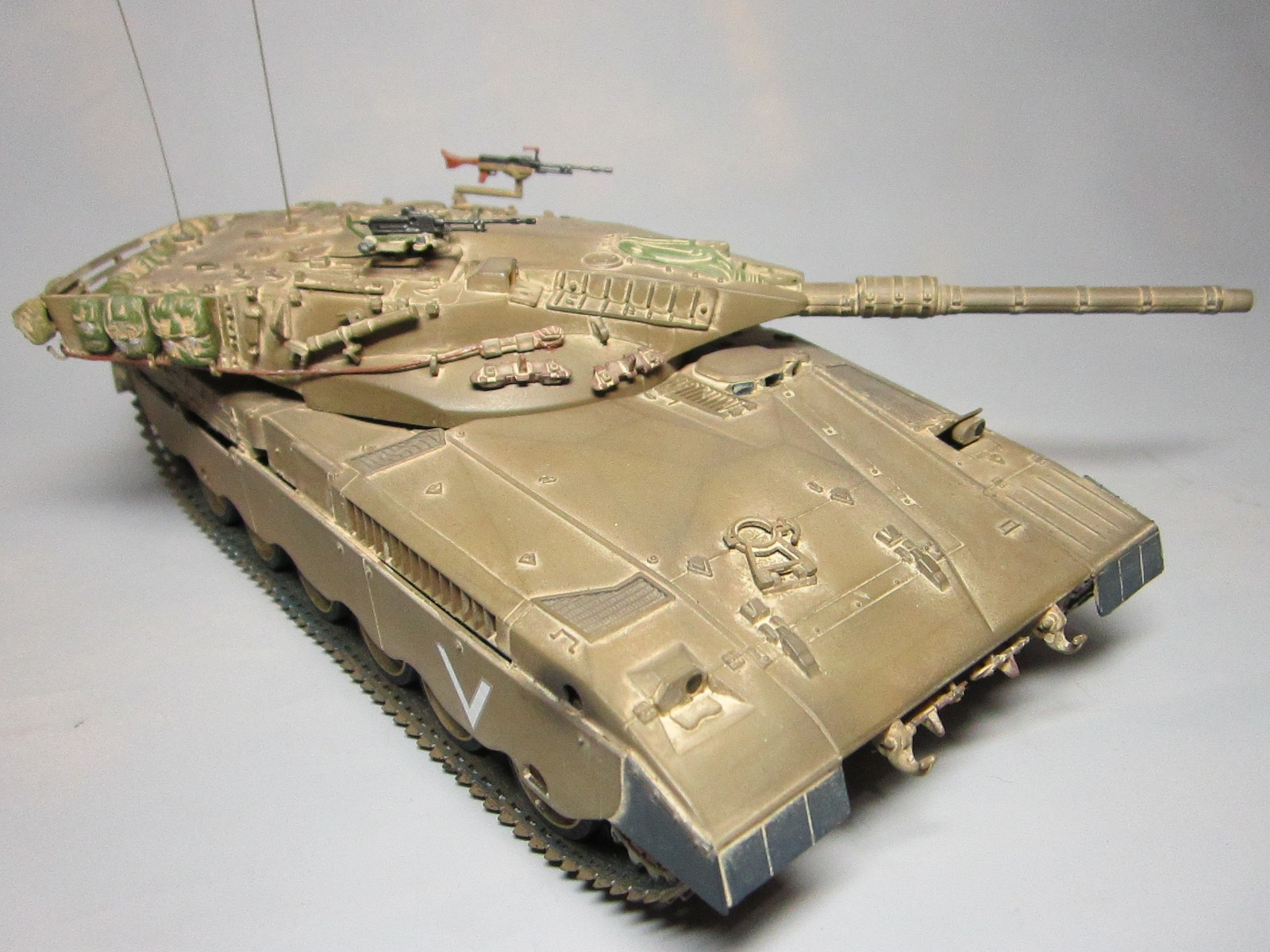 Модель малоизвестной китайской фирмы, которая, вероятно уже канула в лету... Собрана очень давно. Помню, что опорные катки крепились маленькими саморезами, которые были заменены на самодельные, отлитые из смолы крышки ступиц. Трос заменен на проволочный. В комплект еще входил минный трал, литники с деталями которого до сих пор хранятся в "закромах". Окраска - нитра, пыль - GIOTTO.