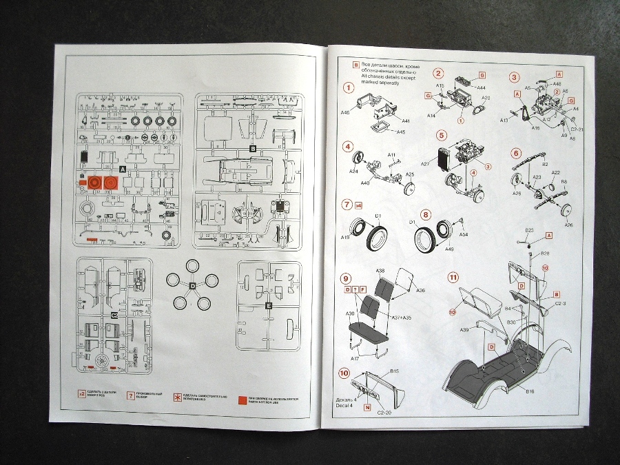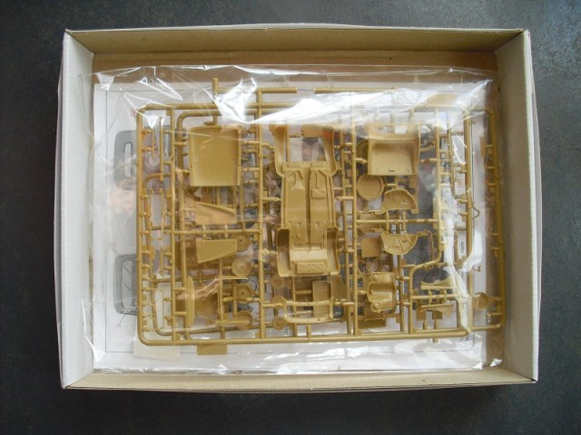 В стандартной для ICMа коробке из тонкого картона (размером 31см на 24см) но с красочной фоткой на переднем плане лежат 3 пакета, декаль и инструкция по сборке. В большом пакете находятся 3 литника с деталями кузова, двигателя и ходовой. Остекление и колеса находятся в отдельных пакетиках, а вот для декаль осталась без упаковки!