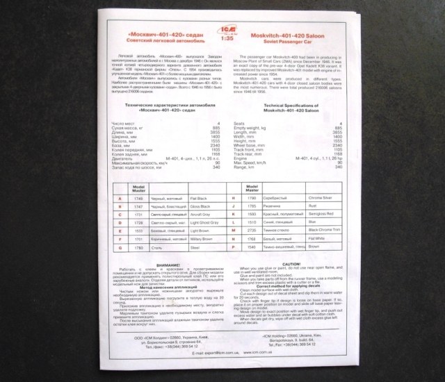 Качество набора современного ICM очень даже ничего! Из данной каропки можно собрать массу модификаций Москвича, а также возможен запил красавца с открытым верхом!