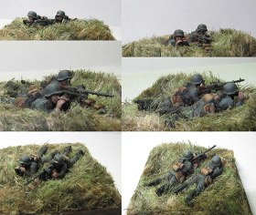 Маленькая виньетка с пулеметчиками от Звезды. Трава - сантехнический лен. Подставка - оргстекло, орех. Краски - "Валеджо". Особо рассказывать тут нечего - делалось лично для себя как фишка под игру "Великая отечественная". За Фотошоп (с танком) прошу особо не ругать, ибо в нем (в Фотошопе) я не силен)))