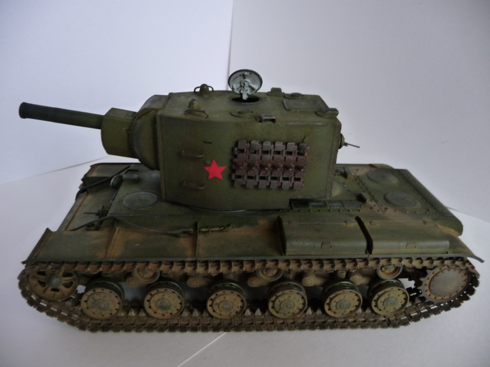 Гусеницы на башне на чем висят? Да и не видел я фотографий кв-2, на которых запасные траки транспортировали таким образом. Дверца в затылке башни, которую вы оставили открытой - технический люк, через который загружалось орудие, после чего люк закрывался считай что намертво. Третья ошибка платиновая - на кв-2 не было никаких номеров, звезд, "за-Сталиных!" и прочего. 2 ящика должно быть на правом крыле, а не на левом, в инструкции ошибка.