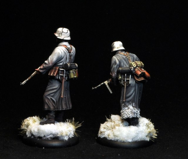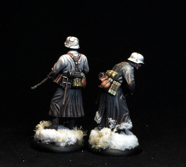 Invisus, на фигурке нужно перекрашивать не только воротник ( шинель, ксати, не серая, а фельдграу). На стволе К98 сверху деревянная накладка между затвором и ложевым кольцом; накладка на тыльной части приклада - металл; поддерживающие ремни, ремень, магазины, сумка для принадлежностей к пулемету - черненая кожа, а не коричневая; ремешок от противогазного бачка - брезентовый, сам бачок либо оливковый либо фельдграу - не черный; сухарная сумка - серая, фельдграу, оливковая - но не коричневая, котелок тоже никак не коричневый; скатка - скорее всего Цельтбан либо ССовский камуфляж; лопатки в чехле, черном кожаном - он, насколько позволяет судить фото, покрашен под метал, что не верно.