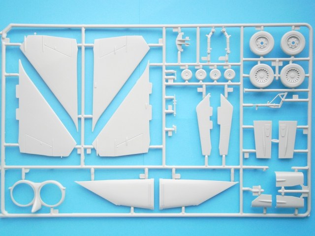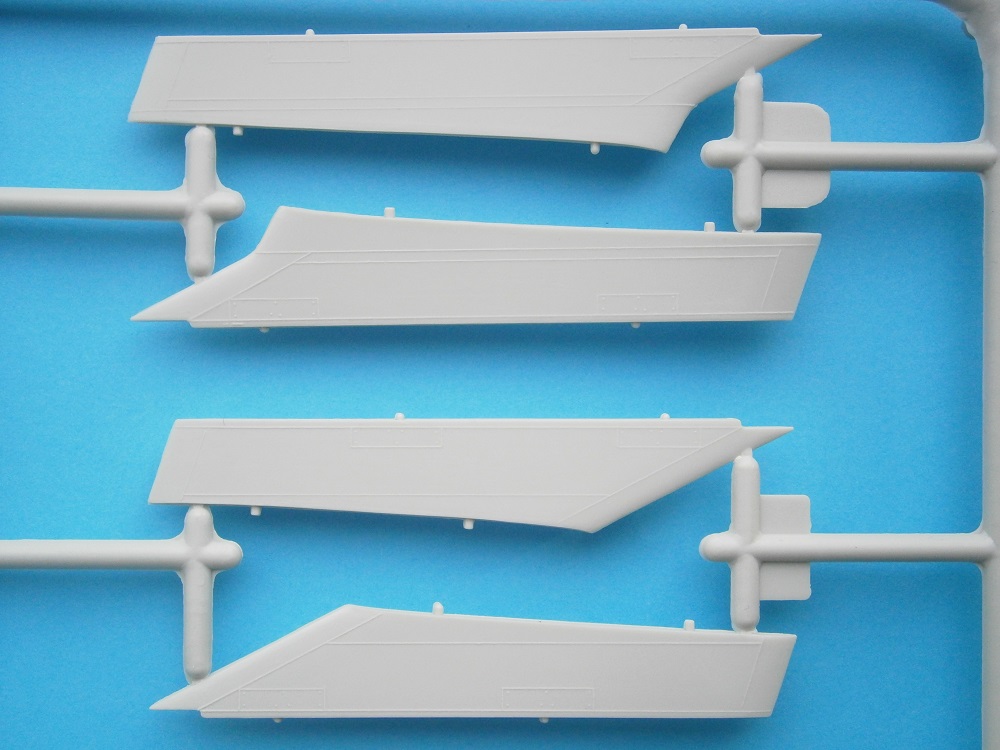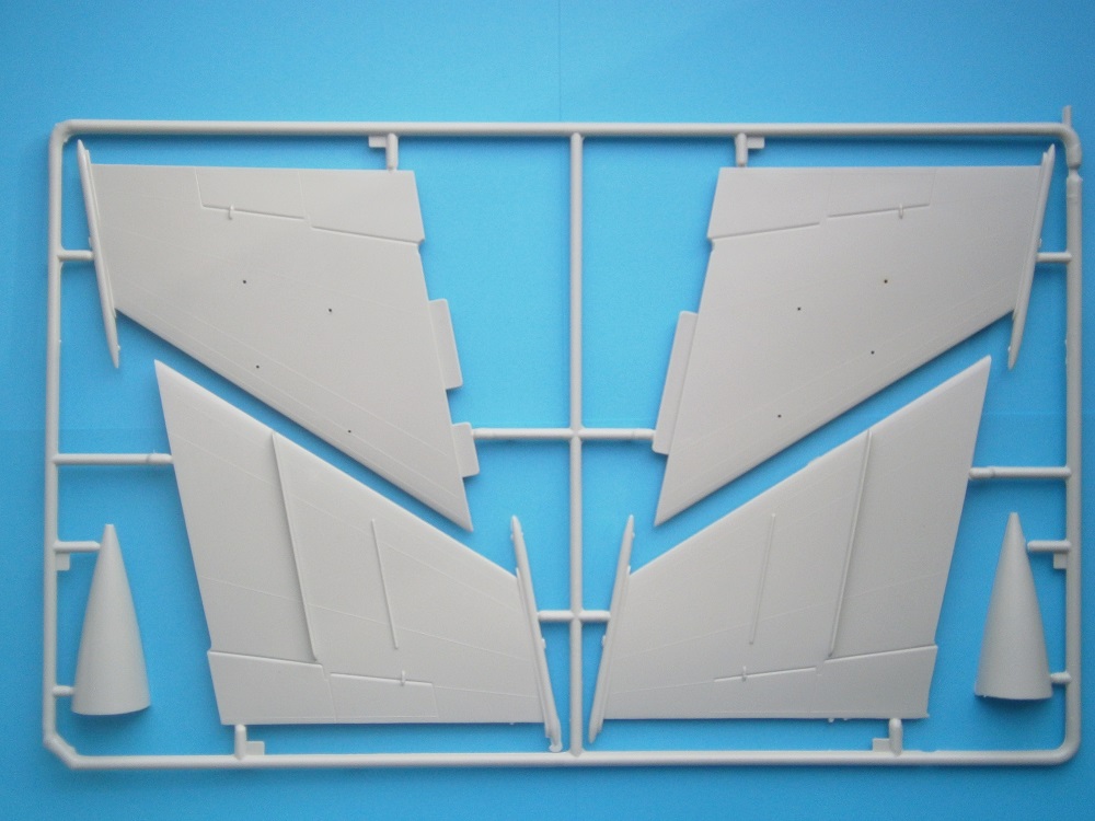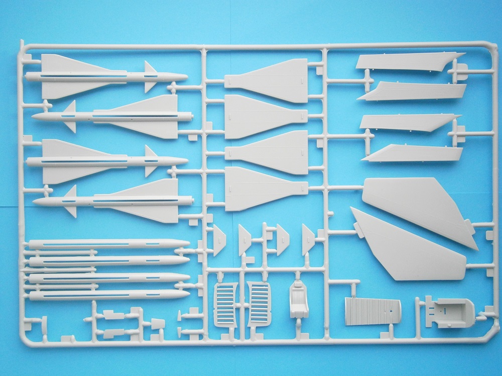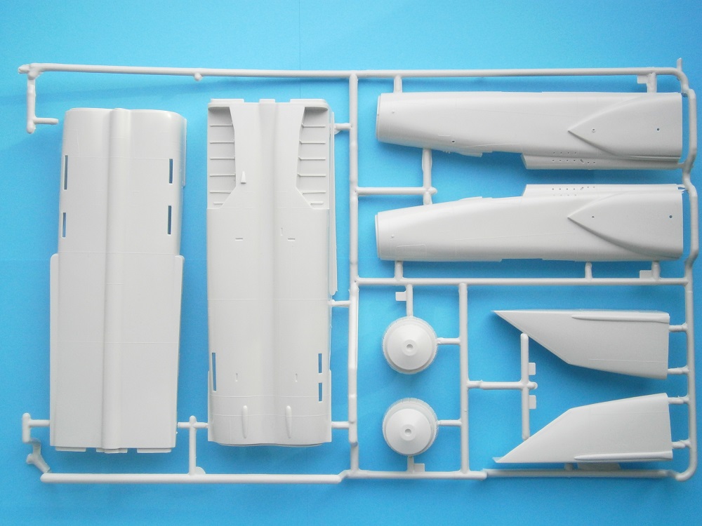 В красочной каробке из тонкого картона,находится четыре литника с деталями модели самолета из светло-серого пластика. И один литник из прозрачного пластика, это остекление фонаря кабины пилота. Сразу же хочу отметить что все детали имеют не правильную и внешнюю расшивку,и полное отсутствие технологических люков,все придется перерасшивать в соответствии с чертежами. Все литники с деталями упакованы в один большой полиэтиленовый пакет.