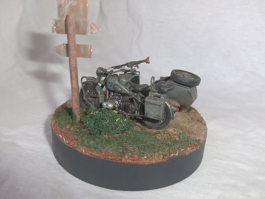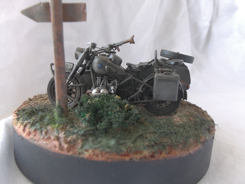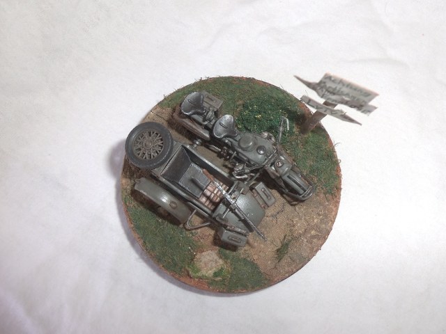 Хочу представить вашему вниманию данную модель, приятная в сборке и второй мой опыт в постройке БТТ так сказать. Добавил троссы на руль, фары, спидометр, высверлил дуло пулемета. Красил кистью, краска от худ. до Вальехо все что было, смывка Миг, пигменты пастэль. Указатель литник и жестянка, нарисованно кастью типа от руки на скорую писали. Основание виньетки крышка от крема, трава сантез лен + флок, кустик паролон.