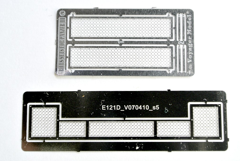 Приветствую всех коллеги. Традиционная небольшая упаковочная коробка с фотографией модели на лицевой стороне StugIII. Ausf. F8,(забегая вперёд нужно отметить отсутствие в наборе деталей изображённых на фото(надгусеничные полки, смоляная маска и металлический ствол орудия)), скорее всего это рекламный ход фирмы своей продукции. Набор включает в себя: семь плат фототравления, одна деталь банника отлитая из смолы, а четыре детали выточены из латуни, отрезок проволоки диаметром 0,3mm, отрезок литника(круглого в сечения) диаметром 0,5 mm, трос, как пишут на обратной стороне коробки диаметром 0,5 mm, но на самом деле он толще по крайней мере в два раза, инструкция на двух листах по применению набора на модели. Отдельно порадовала проработка сетки моторного отделения. Так же в наборе имеются фототравлёные детали для члена экипажа самоходки. После работы с набором, осталось много мелких неиспользованных деталей ушедших в запасник.
