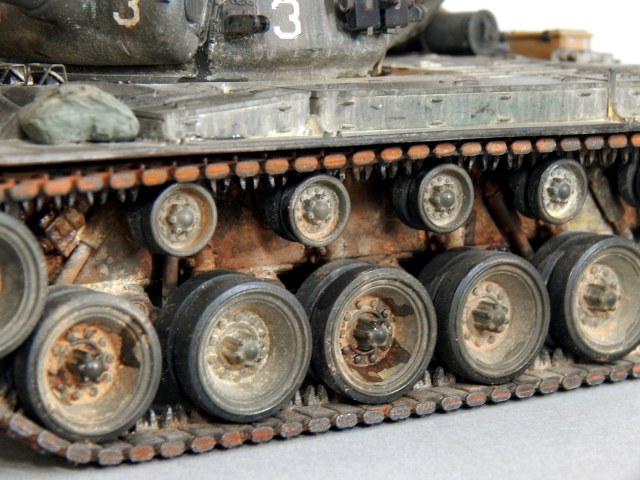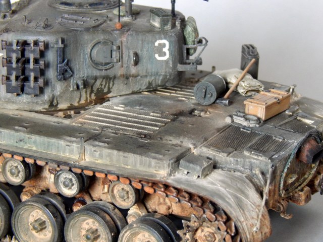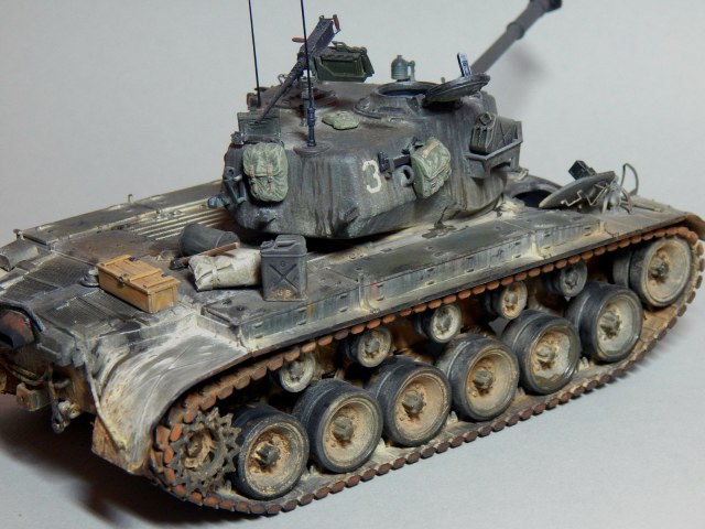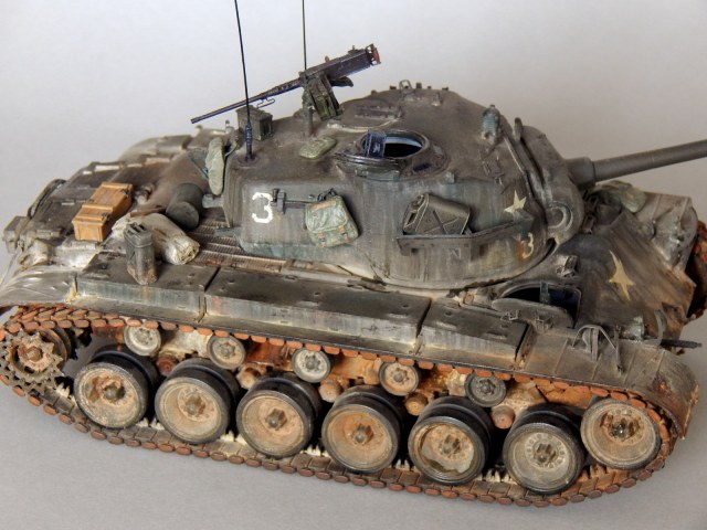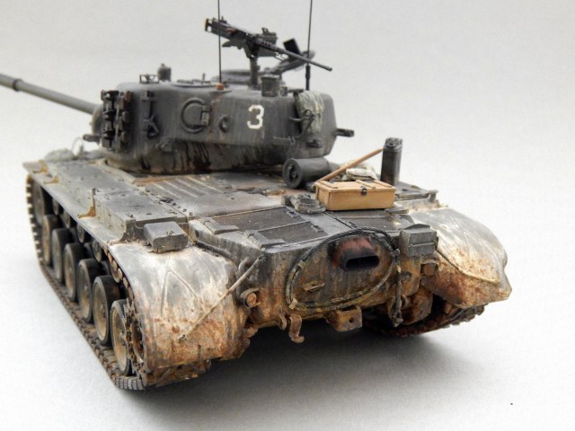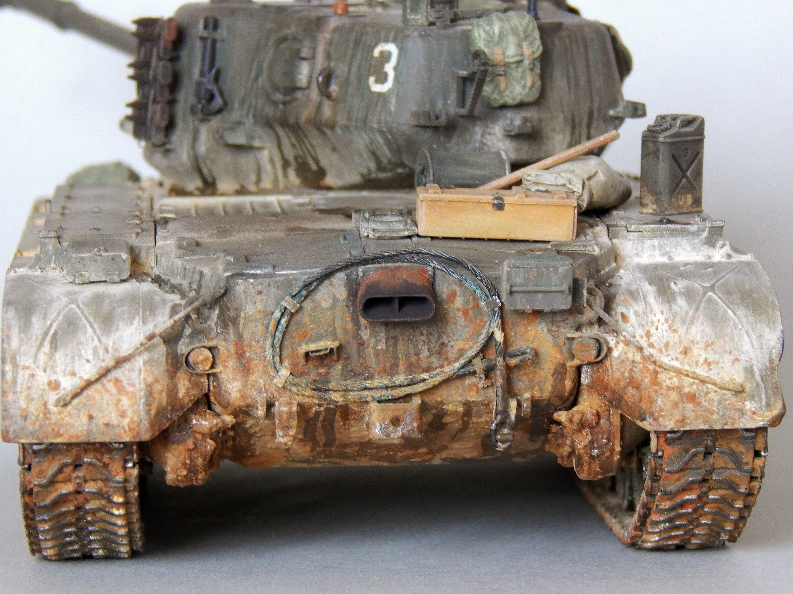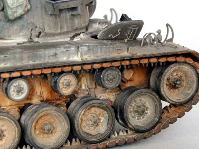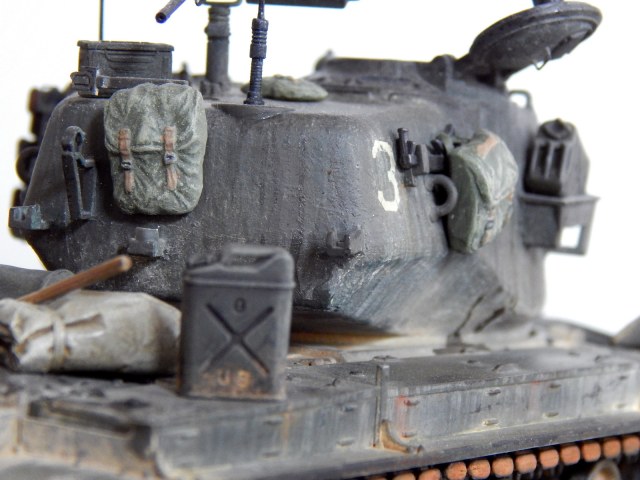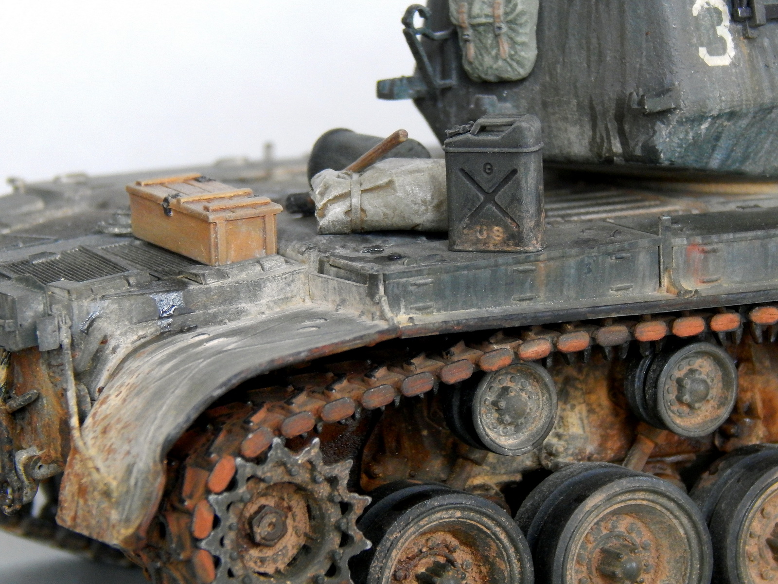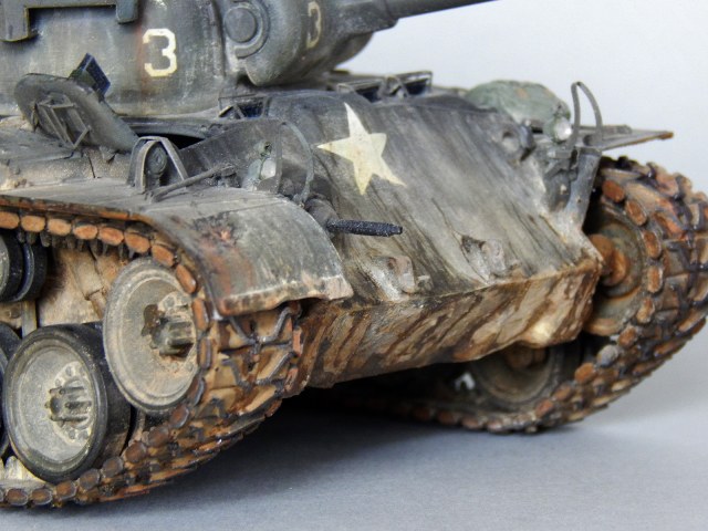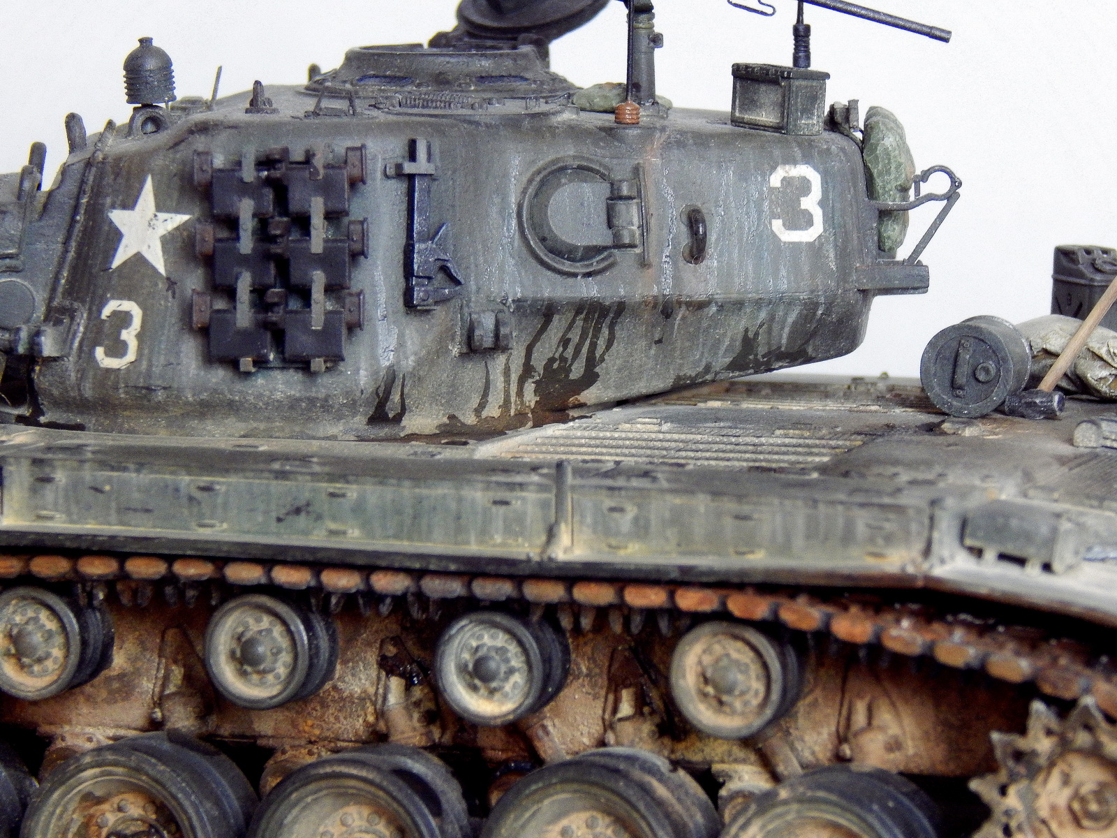 Танк средней "поношенности", пыль, грязь, дождевые подтеки. Немного солдатского барахла, что в общем присуще американской технике того времени.