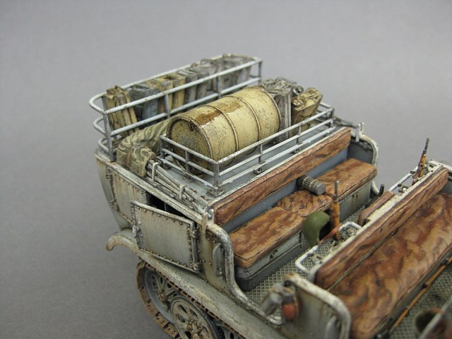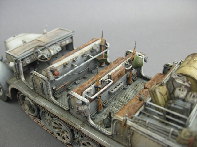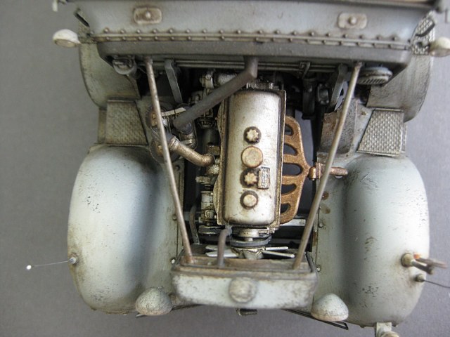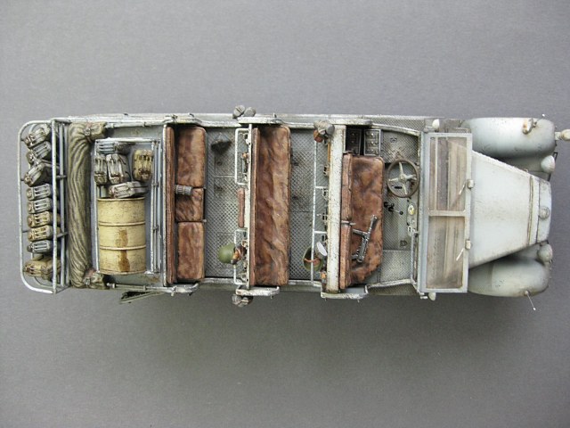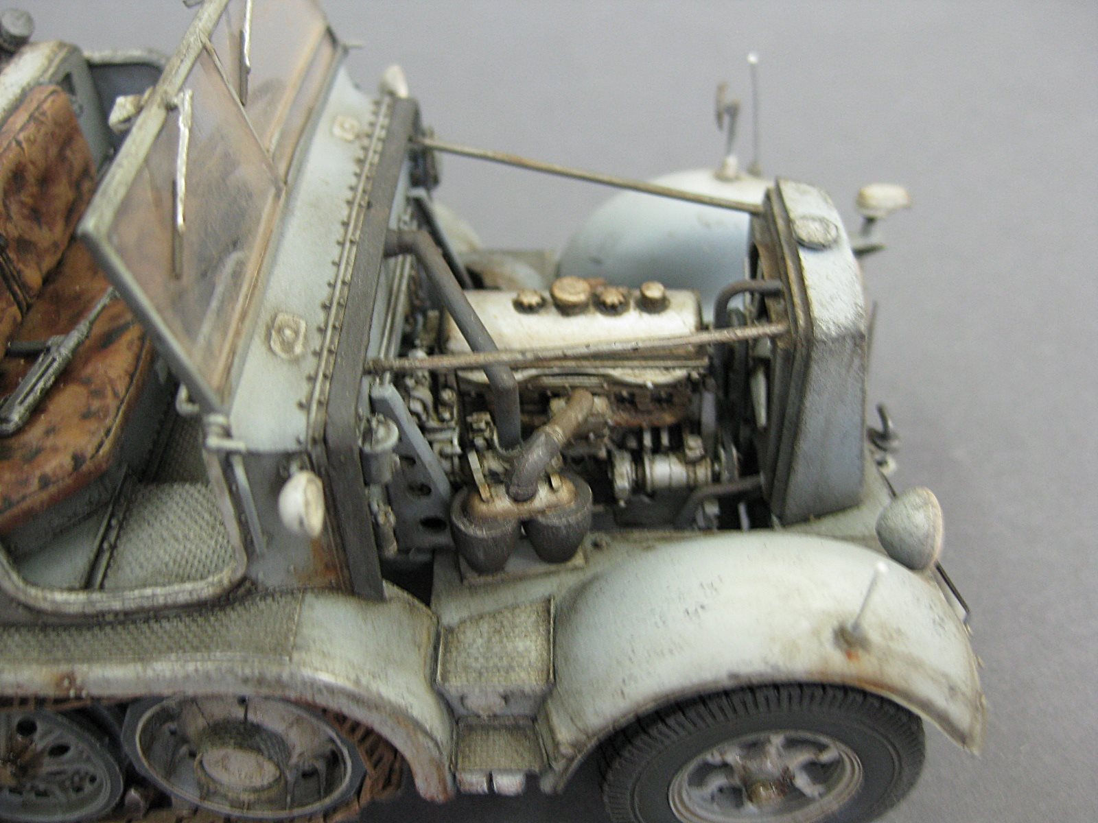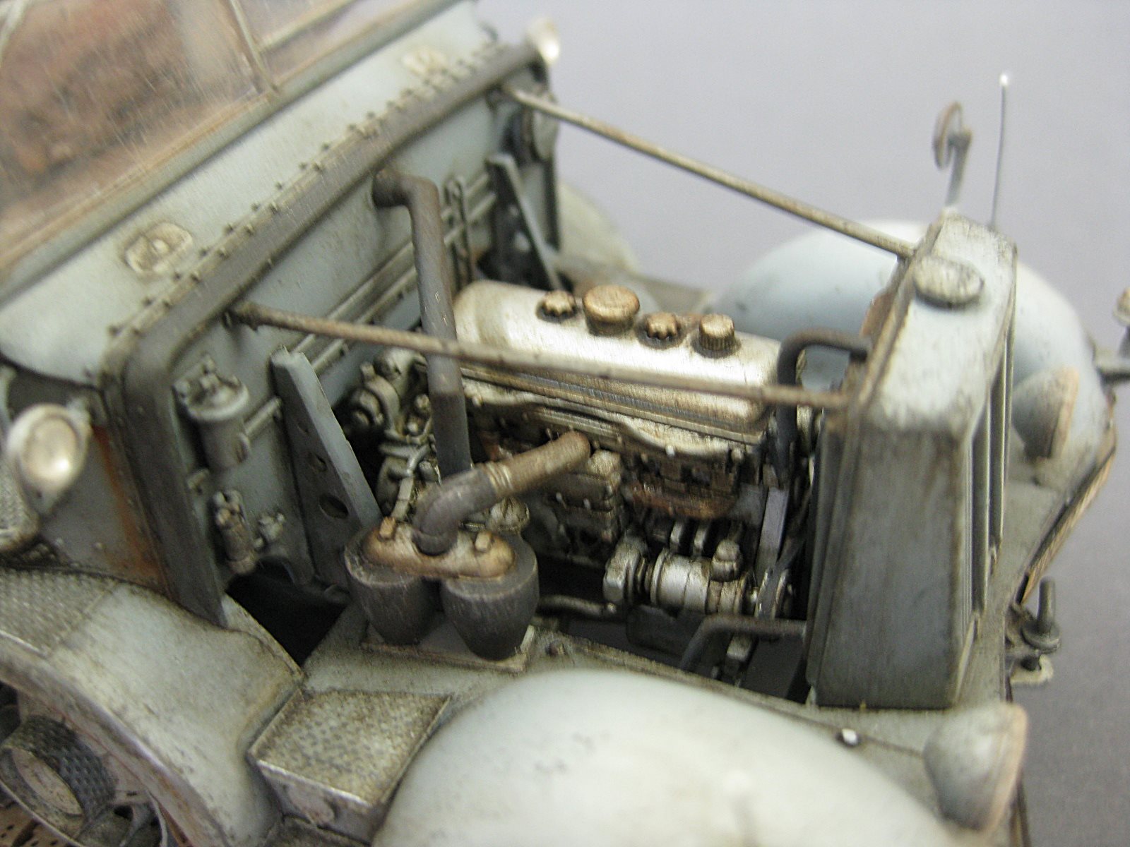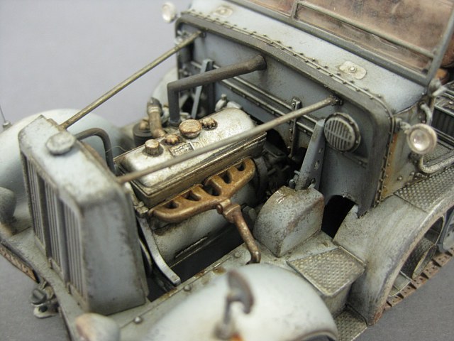 Модель собиралась почти без переделок.Единственное что сделал-это изготовил опорные штанги под капотом и ремни вентилятора.Канистры и бочки от "Тамии",оружие и амуниция от "Звезды".