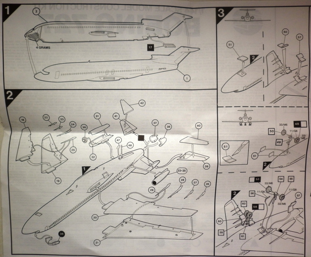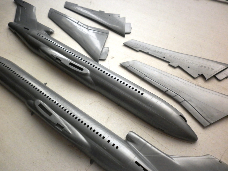 Пластик - типичный фиксовский пластик 80х . Серебристый , без брака литья. К сожалению , не предусмотрено остекление иллюминаторов салона - либо остаются "дыры" , либо их нужно заделывать жидким стеклом. Иначе декаль ляжет неравномерно. Крой белный , наружный. Ниши шасси пустые, деталировка двигателей примитивная.