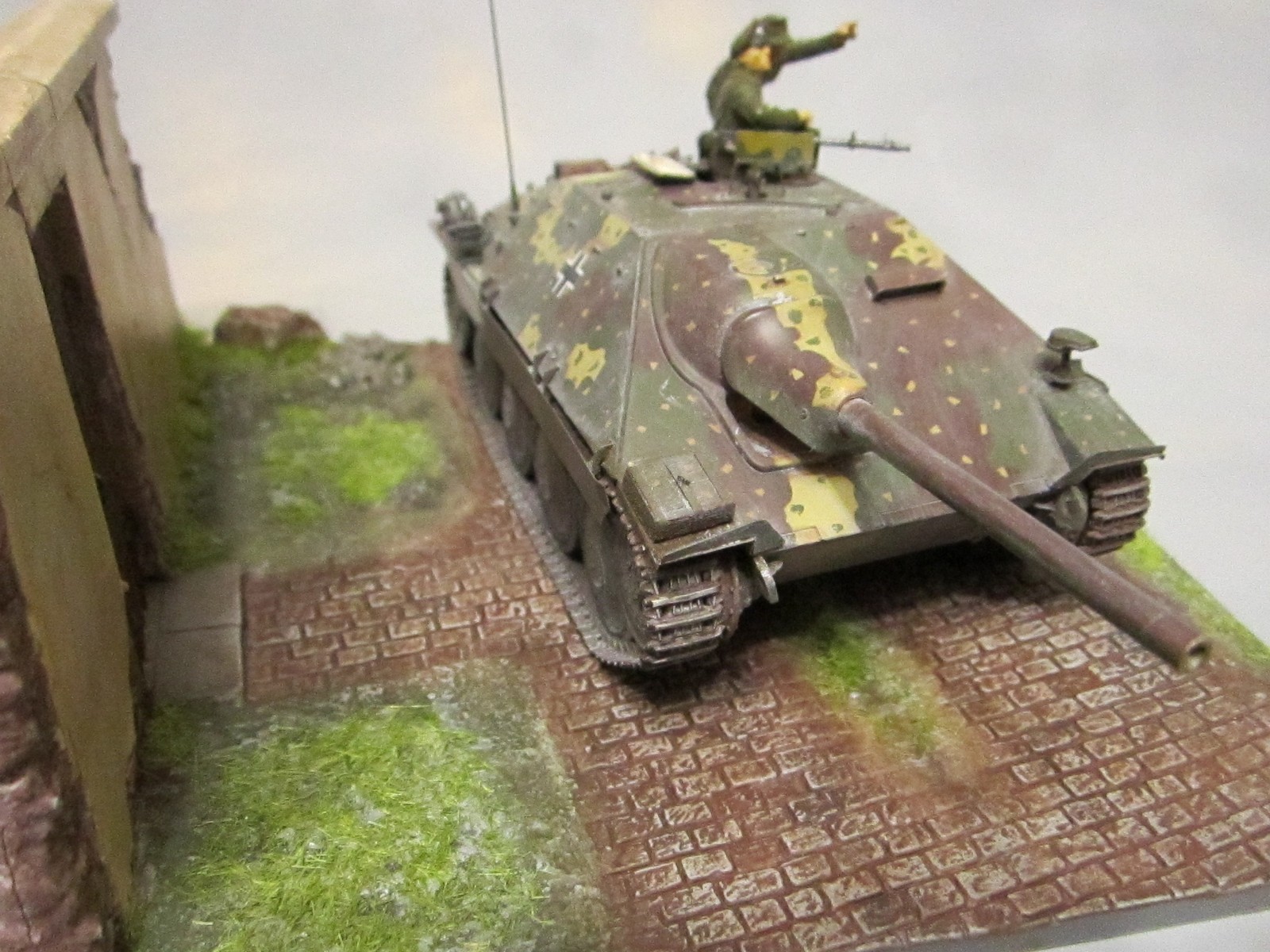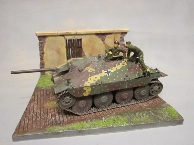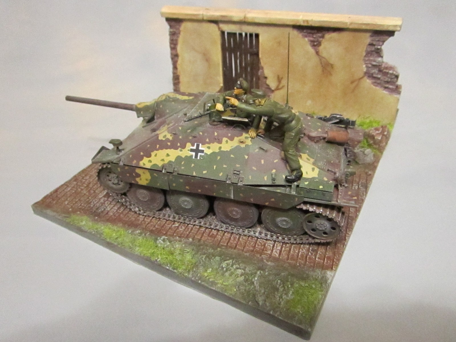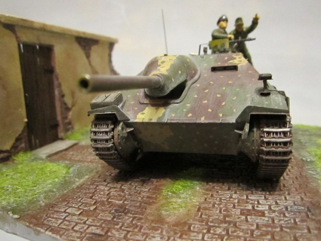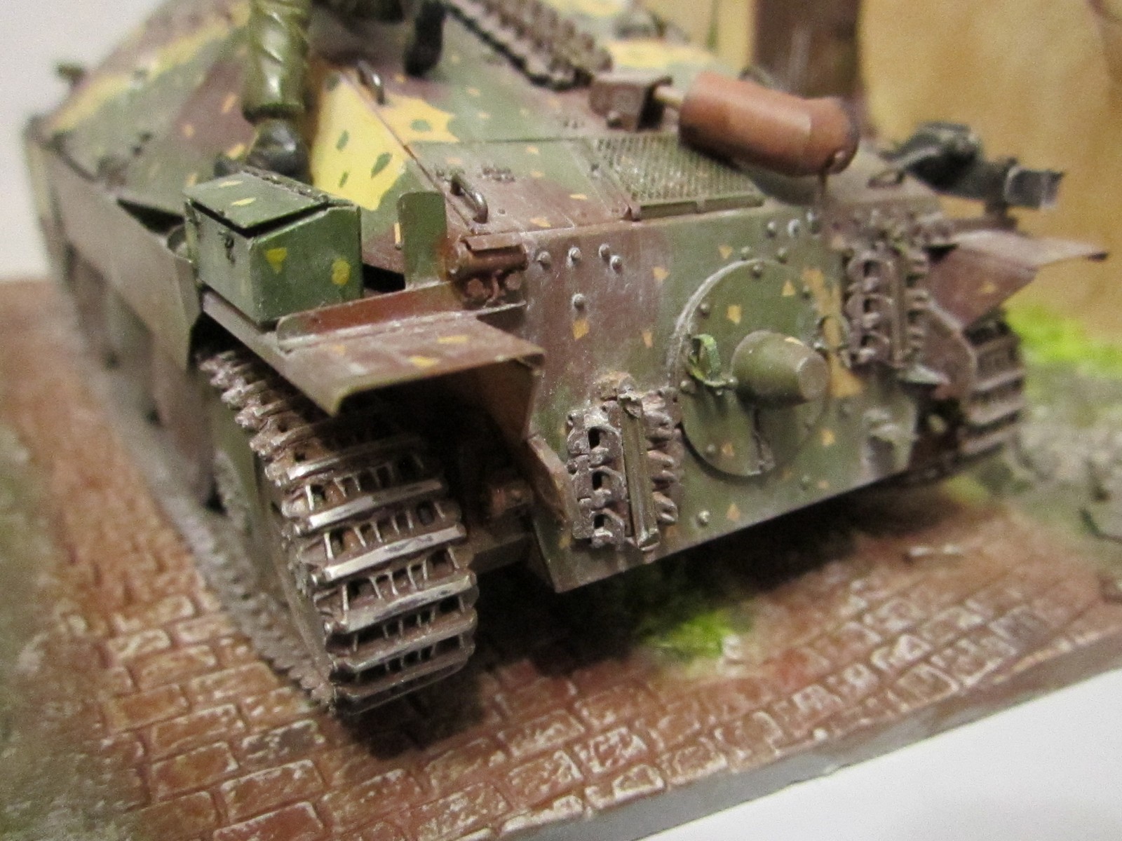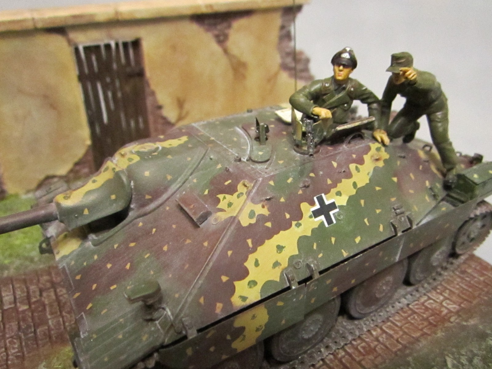 Сначала была собрана сама самоходка. Использовался набор Academy, набор фототравления Aber, наборные траки Friul model. Травление предназначено для модели "Хетцера" от "тамии" и включает элементы для ранней, средней и поздней версий, поэтому использовался не в полном объеме. Для окраски модели использовались маски, входящие в комплект модели. Очень замечательная вещь! Красилась модель акрилом Vallejo. Для тонировки (старения) траков пытался использовать различные методы, описанные в сети. На мой взгляд, эффективней медног купороса нет ничего (фирменных жидкостей опробовать не довелось). Но в любом случае, результат мне не понравился. Поэтому, собраные гусеницы были загрунтованы "тамией", выкрашены акрилом и тонированы различными доступными способами. Результатом, т.е. моделью, остался доволен.