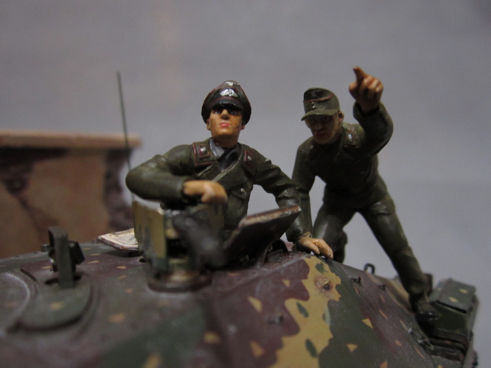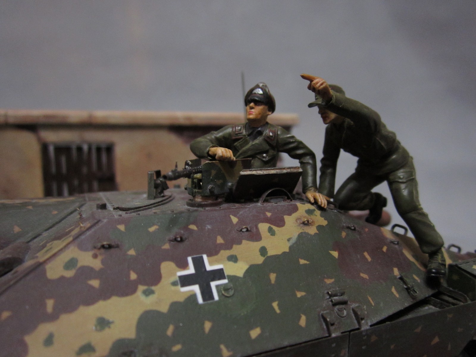 И тут что-то подвигло меня поставить модель на какое-то основание. Пробовал просто поставить на гипсовую подставку в виде мостовой. Как то не так... По случаю, приобрел набор (булыжная мостовая+забор) от MiniArm и "траву" Dasmodel. Раскрасил фигуры танкистов из базового набора и собрал все "до кучи". В получившийся сюжет "попросились" две фигурки из звездовского набора "Штурмовая группа". Калитку слелал из шпона, петли калитки жесть и 4 заклепки от MasterClab. В самоходке так же использована продукция этой фирмы. У фигур вырисовывал глаза, губы, сверлил ноздри, уши, рукава... Ничего этого на фото не видно...