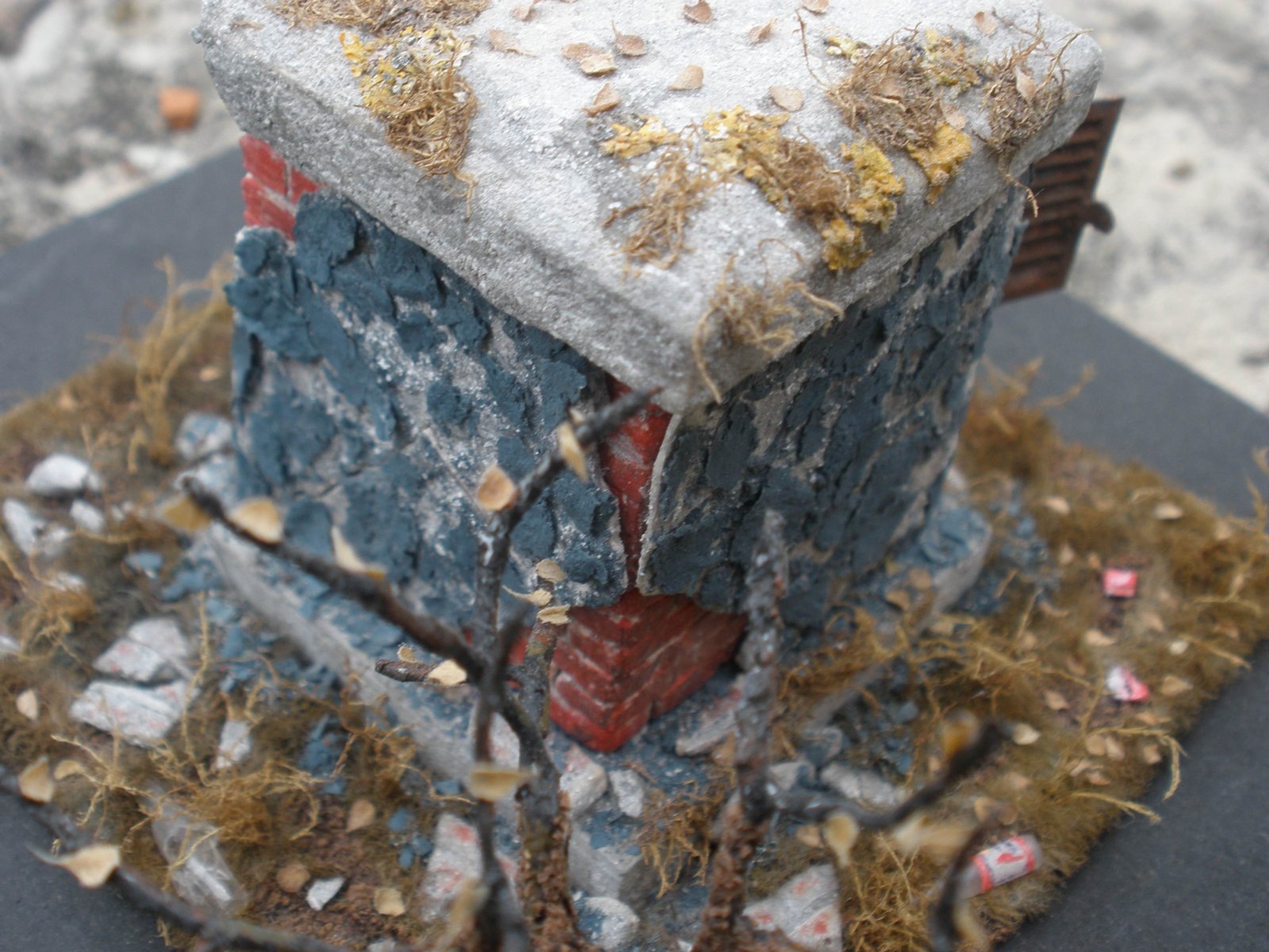 Всем здрасте! Вобщем решил наконец выставить свой небольшой долгострой на диггерскую тему. Делать начал ещё до армии в далёком 2011г., а закончил в мае 2013, но чё-то раньше выложить было лень=) ...к тому же специально ждал осени. Всё началось с экспериментальной пробы создать имитацию кладки из гипса, а дальше понеслась идея с вентшахтой, потом захотелось сэмитировать отпавшую штукатурку, облезлую краску и конечно же окружающую атмосферу вокруг. Была также смоделирована северная сторона. Работу долго забрасывал, и делал по настроению. Основной упор сводился к деталям и мелочам. Что ж, люблю я себе сам всё усложнять, да и идеи приходят только по ходу дела. Думаю, диорамка больше придётся по душе коллегам с urban3p.ru=)