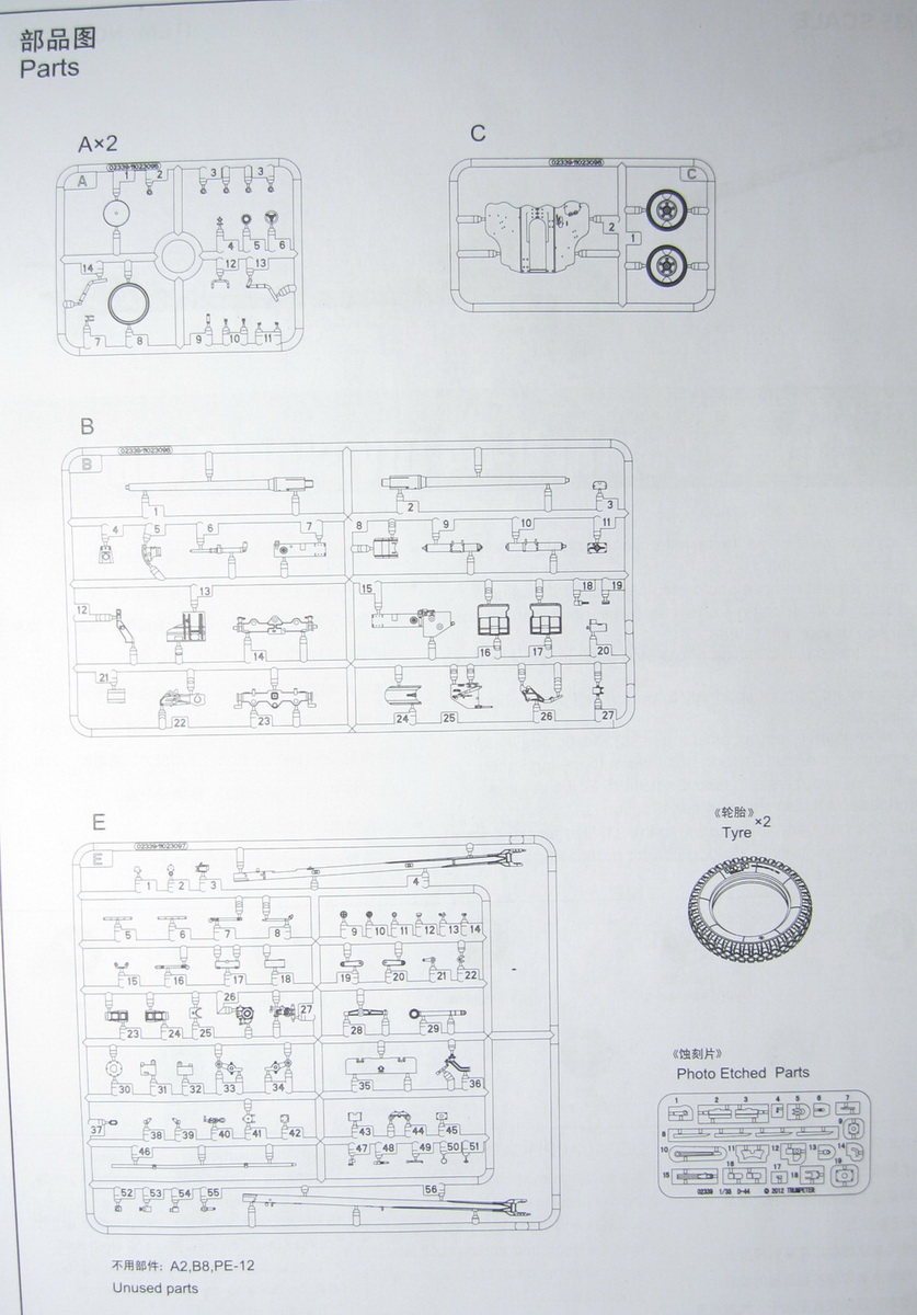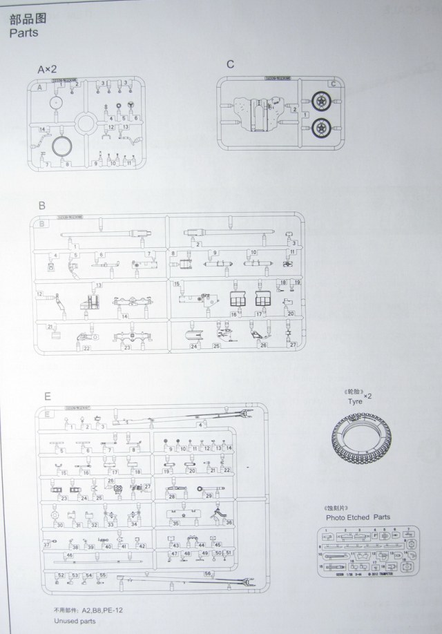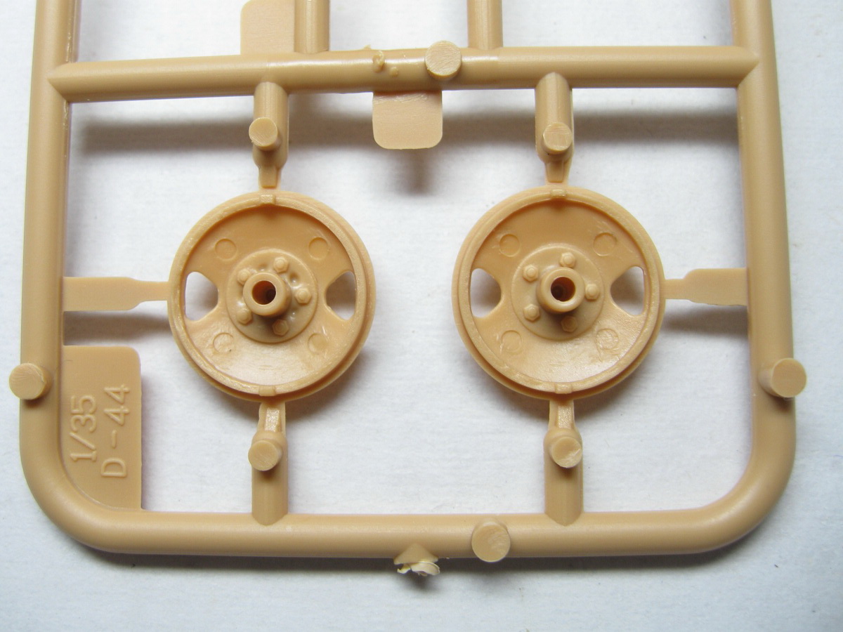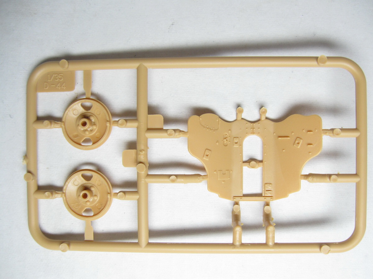Небольшая коробка. В коробке пять литников песочного цвета, из них два одинаковых, небольшая платка фототравления в прозрачной плёнке и резиновые колёса с неплохим протектором. Декали нет. Брака литья не обнаружено. Толкатели.. ну куда же трамп без толкателей. Толкатели обнаружены с внутренней стороны дисков колёс и внутри казённика. В общем думаю сборка не будет сложной в итоге должна получится маленькая симпатичная пушечка.