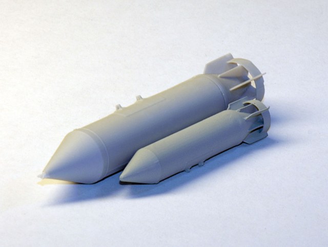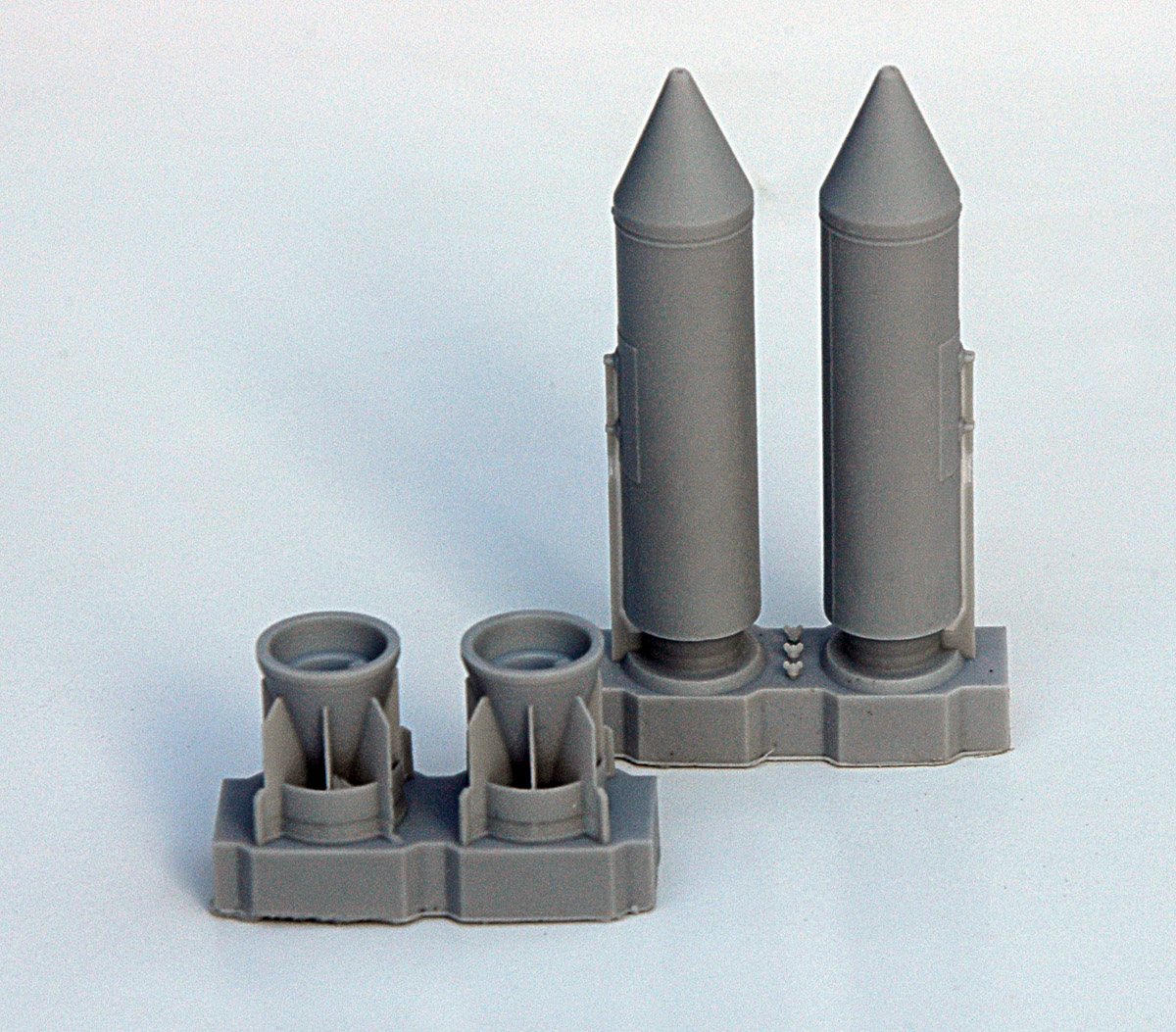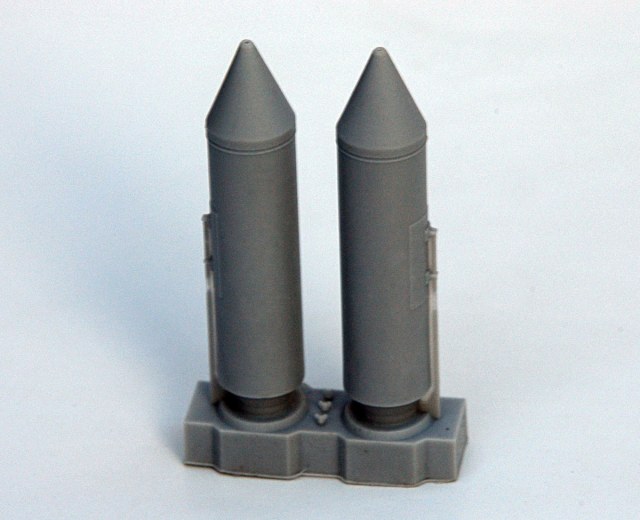 В наборе дается две бомбовые кассеты, отлитые из светло-серой полиуретановой смолы. Выбранное технологическое членение – цилиндрическая часть корпуса с носовым обтекателем и хвостовой конус с перьями стабилизатора повторяет конструктивные особенности реального изделия. Носовой обтекатель - конический, хотя на реальном изделии мог быть и оживальной формы. Считаю необходимым отметить, что обтекатели транспортируется в специальной таре вместе с комплектами механизмов расцепления и взаимозаменяемы для разных типов РБК. Возможно, фирма АМ выпустит тару, то что, они ее промерили, известно достоверно.