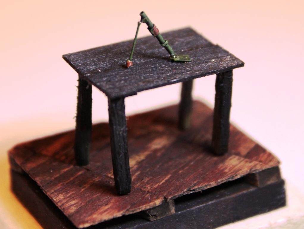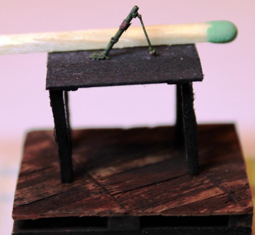 Подставка - пвх как основа ( грунт ) + бруски деревянные, пол - шпон корабельный крашенный, и потом тонированный, стол из спичек.