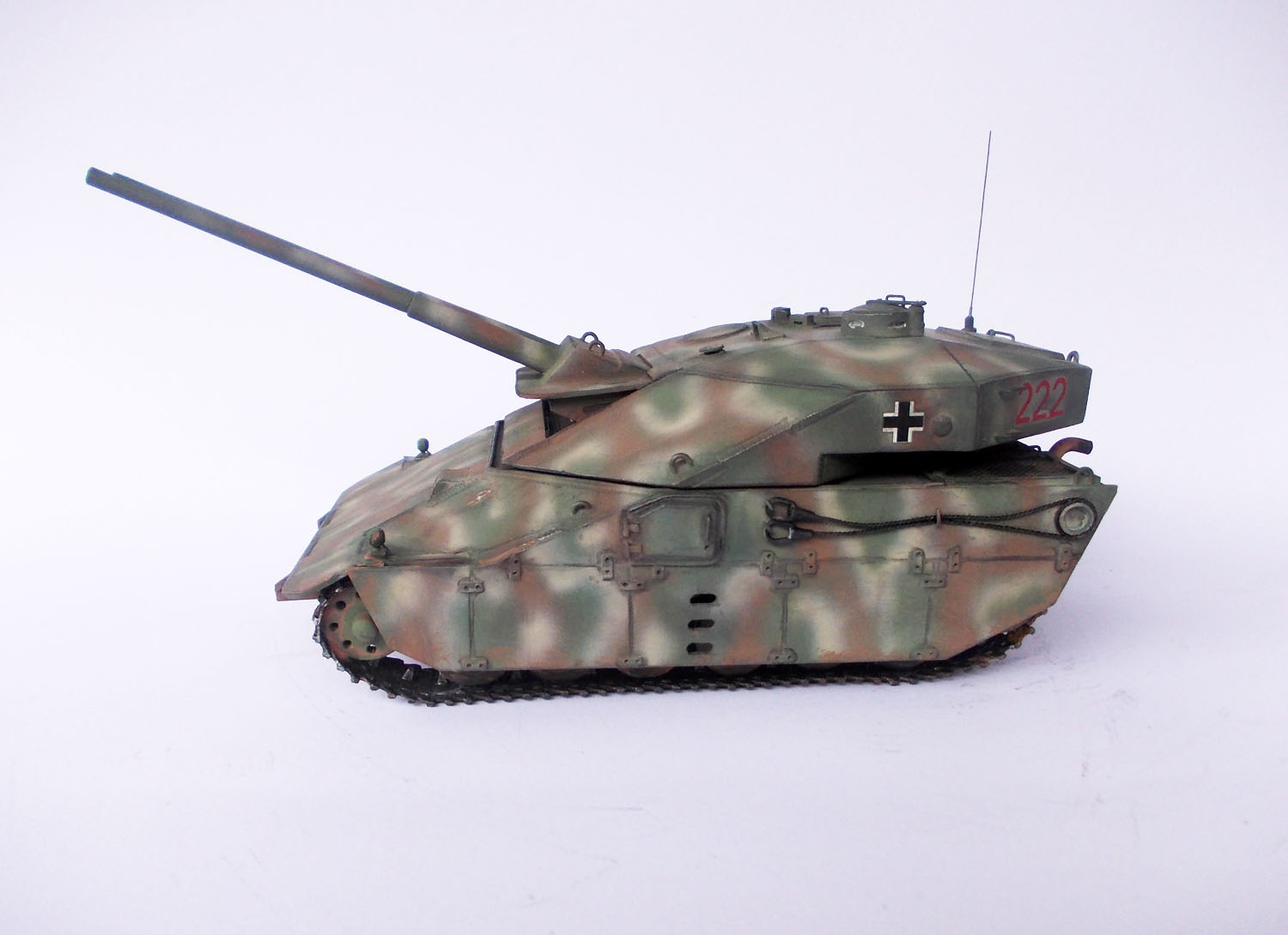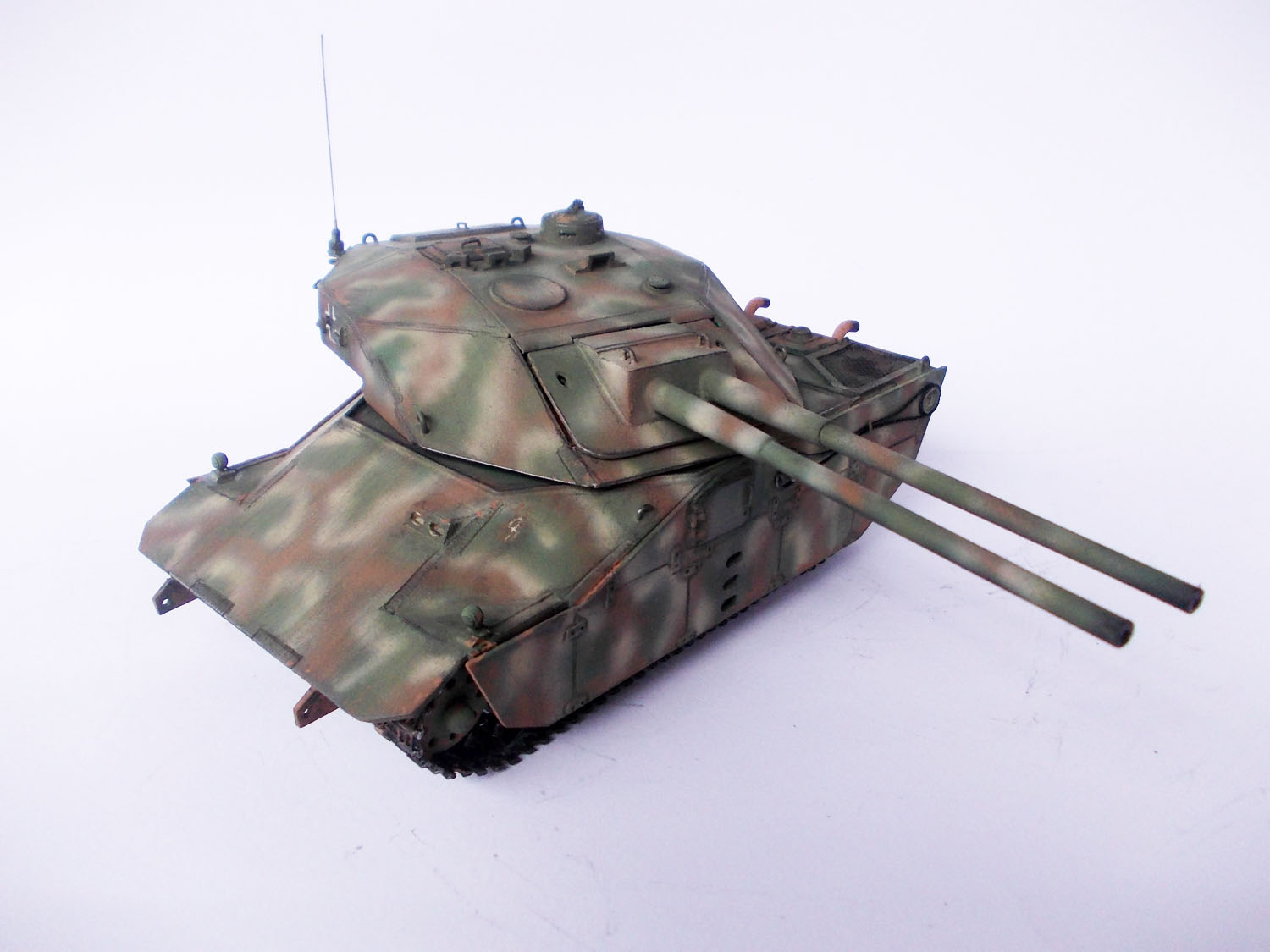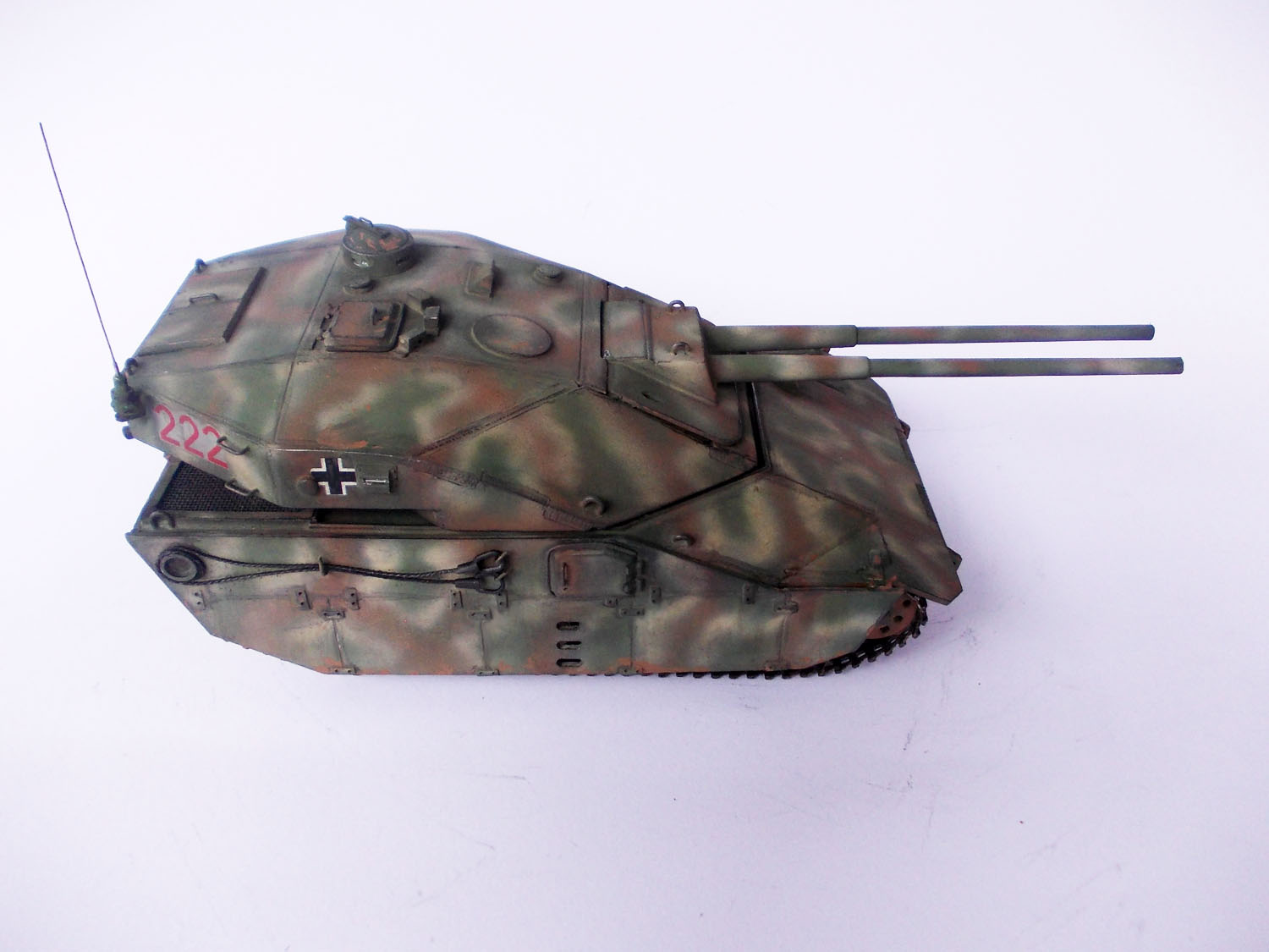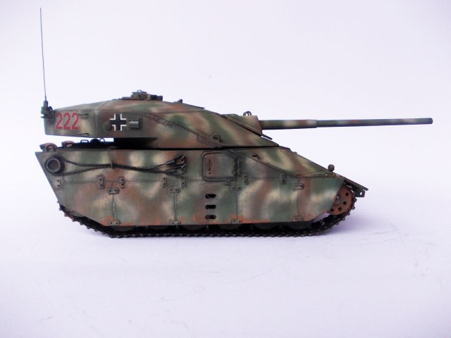 Выглядит очень интересно! Напоминает увеличенное что-то вроде E-50m старых, угловатых.вполне сошел бы за средний танк какого-то альтернативного будущего! стволы правда подкачали, если на "Pz Teufel" они удались, то тут к сожалению нет(и оверстие не по центру и не ровное, лучше бы с каких-то пластиковых трубок сделали) и гусеницы бы от пантер или тиров...