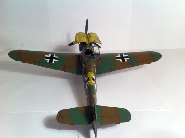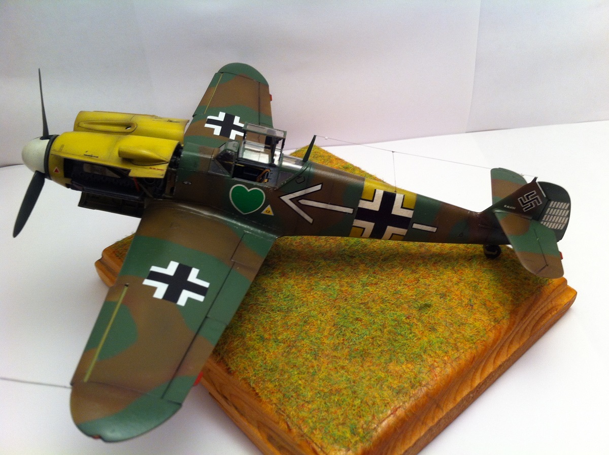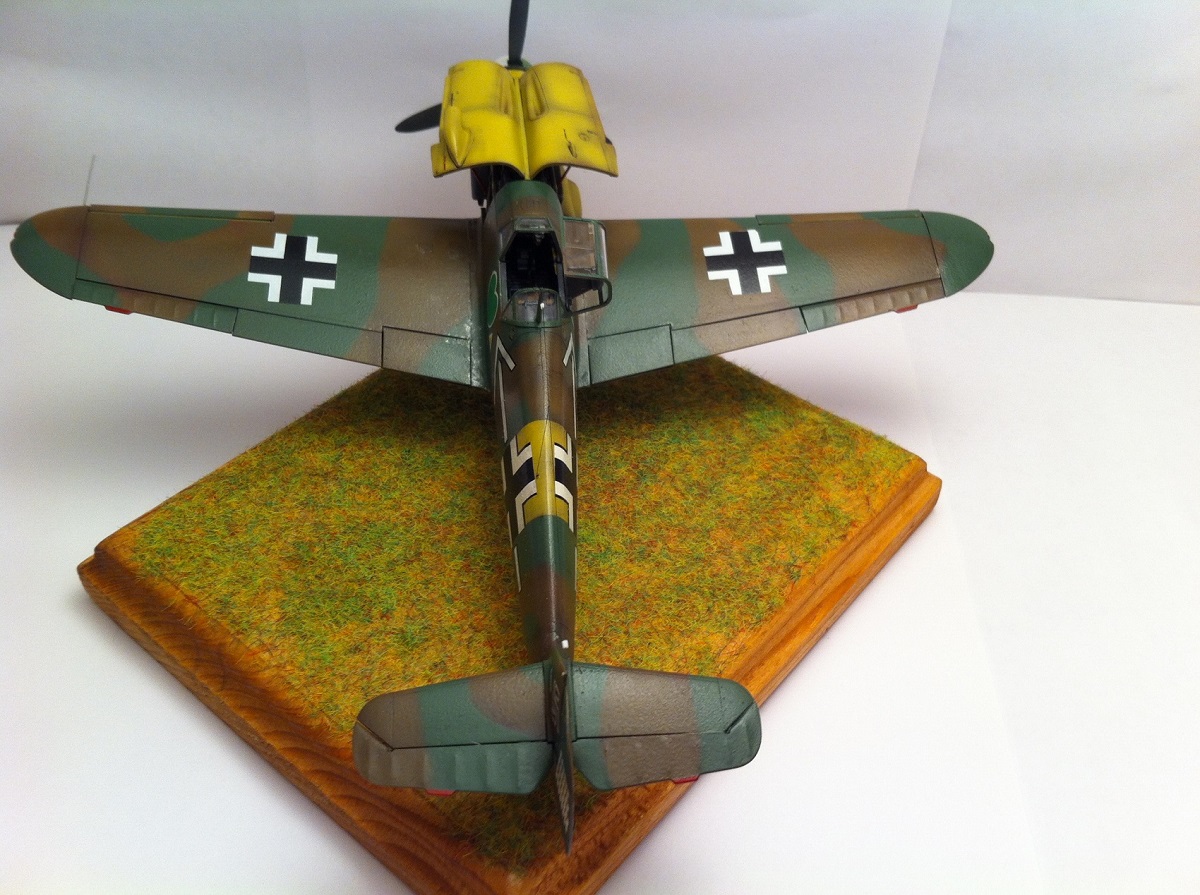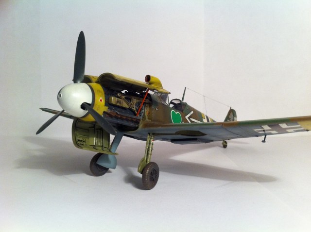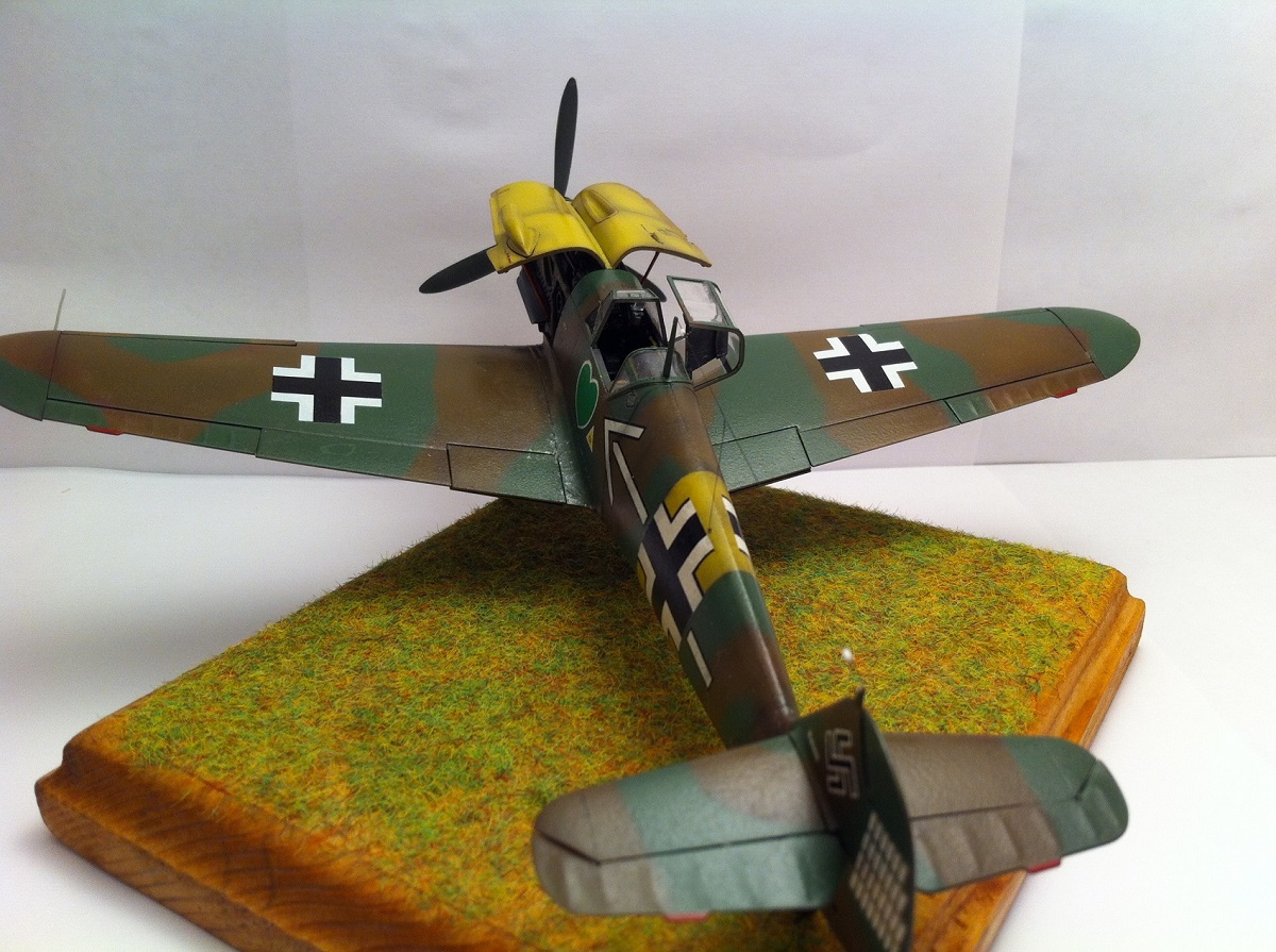 Всем известный кит от Звезды. Впечатлила деталировка и проработка поверхностей , сборка так же огорчений не принесла - всё встало на свои места замечательно , так что шпаклёвочно- зачистных работ на этой модели не производилось ,ну очень порадовала меня " Звезда". Прототип -самолёт командира 54 эскадры Ханнес Траутлофт , "Звезда" почему-то даёт схему камуфляжа не верную по цветам , причём на этот самолёт существует 2 схемы- до и после ремонта , в целом они похожи , разница лишь в деталях. Краска - "Звезда" , смешивалась по найденным в сети выкраскам RLM.