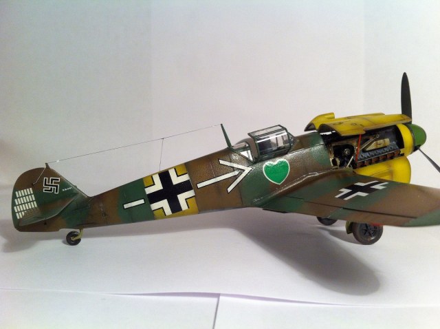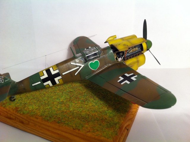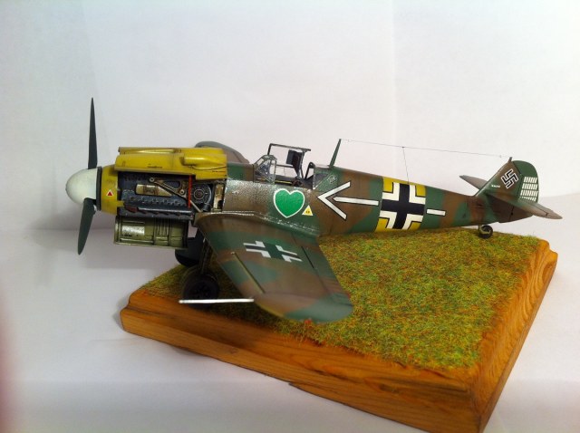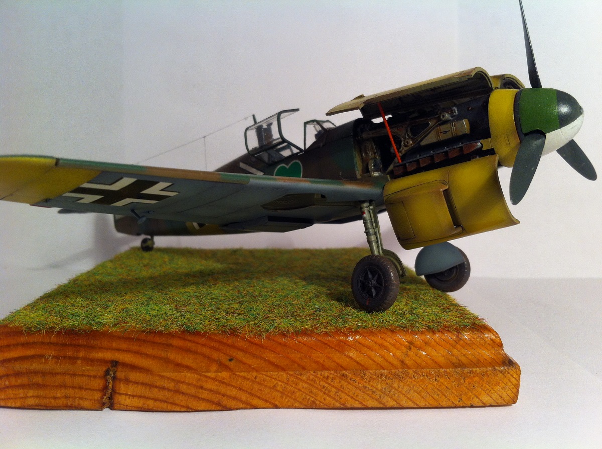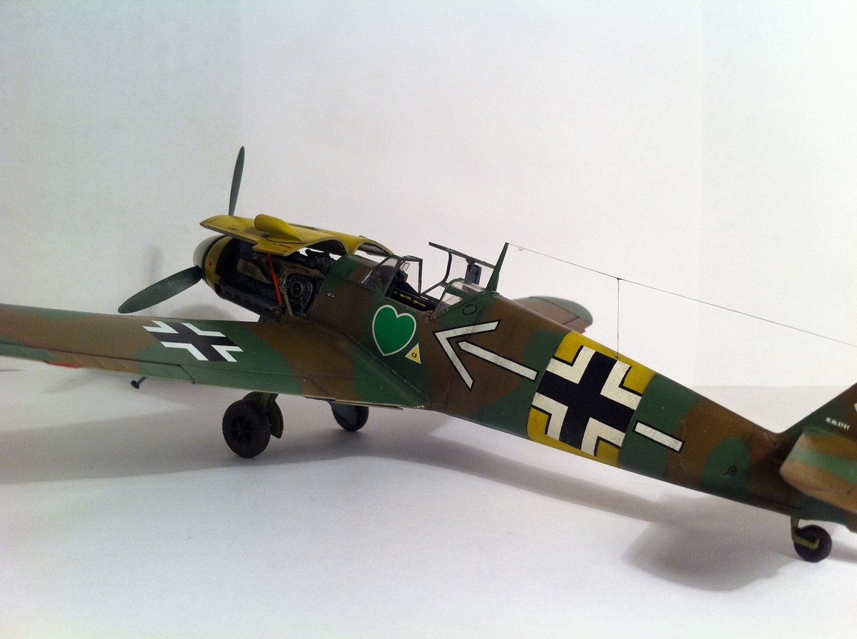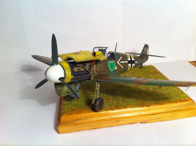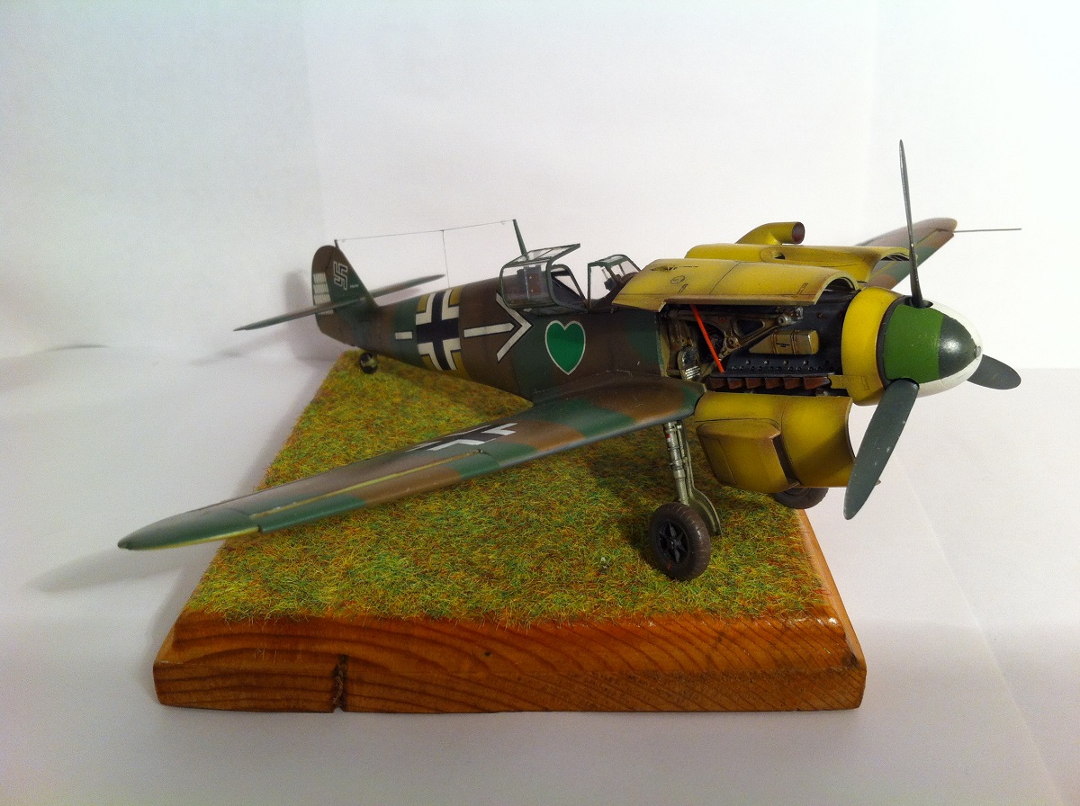 Всем известный кит от Звезды. Впечатлила деталировка и проработка поверхностей , сборка так же огорчений не принесла - всё встало на свои места замечательно , так что шпаклёвочно- зачистных работ на этой модели не производилось ,ну очень порадовала меня " Звезда". Прототип -самолёт командира 54 эскадры Ханнес Траутлофт , "Звезда" почему-то даёт схему камуфляжа не верную по цветам , причём на этот самолёт существует 2 схемы- до и после ремонта , в целом они похожи , разница лишь в деталях. Краска - "Звезда" , смешивалась по найденным в сети выкраскам RLM.