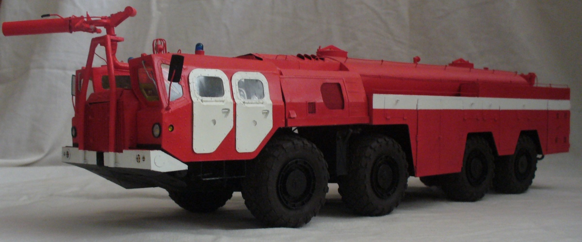 Прототип: Автомобиль АА-60, модель 160.01 предназначен для несения пожарно-спасательной службы на территории и в районе аэродромов, тушения пожаров на воздушных судах и проведения работ по эвакуации людей из воздушного судна, потерпевшего аварию.Автомобиль смонтирован на специальном колёсном шасси МАЗ-543 повышенной проходимости с колёсной формулой 8х8. Такое шасси даёт автомобилю АА-60 высокие характеристики проходимости и маневренности на бездорожье, что позволяет оперативно добираться к месту аварии воздушного судна, если она произошла в труднодоступном месте.