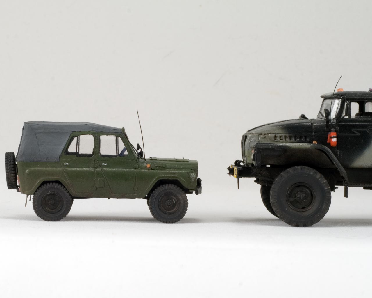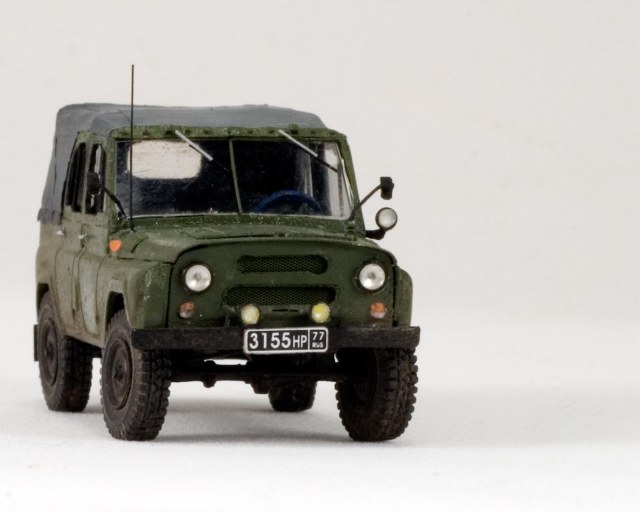 Максим, а что не смотрится? Про тонировку, вообще окраска кузова проводилась двумя оттенками, тент красил тремя оттенками, а лаком кузов покрывал четыре раза, пока не добился нужной степени металлического полуглянца. Помимо этого нарисованы сколы, отобразил помятости в некоторых местах, присутствует запылённость. Другое дело, что делаю я это не так явно, как это рекомендуют некоторые моделисты, выкрашивая высветлением любой попавшийся болтик или лючок, потому что считаю это художественно неверным.