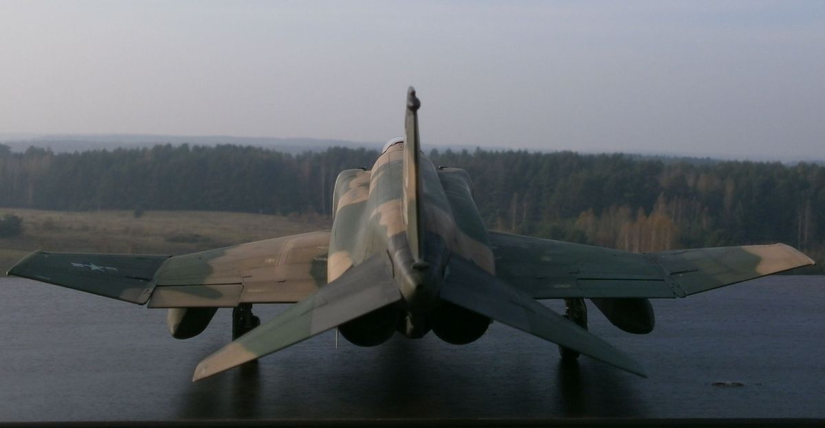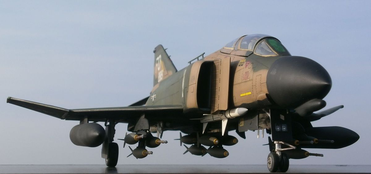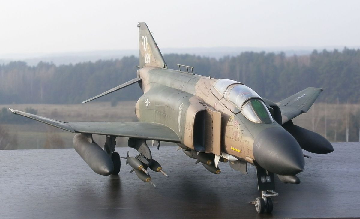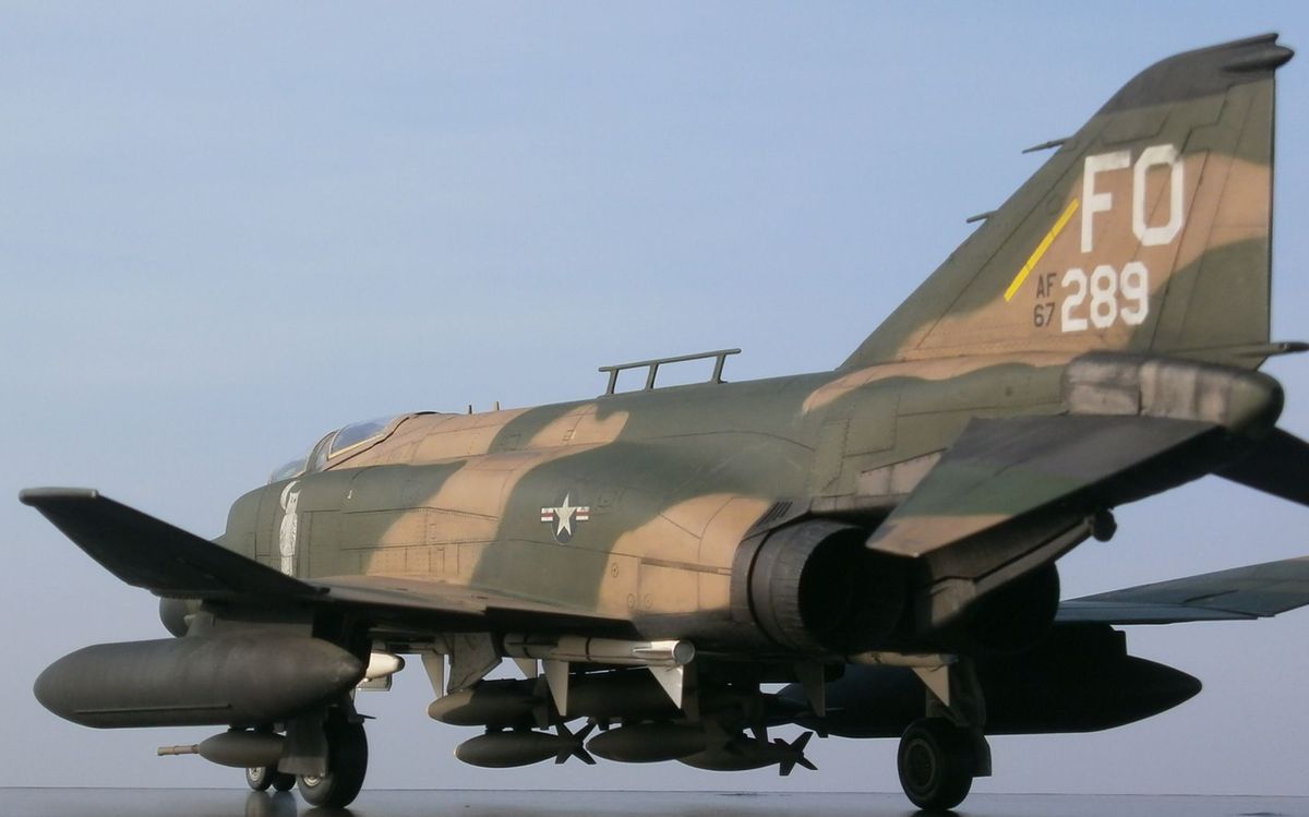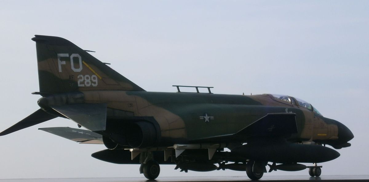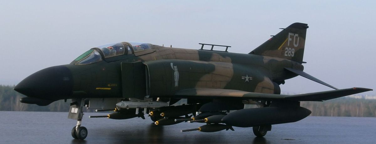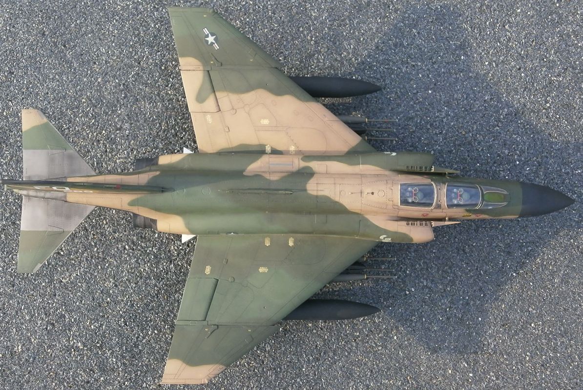 По машине информации на просторах интернета масса, напишу лишь несколько слов - модификация D это первая по-настоящему сухопутная модификация Фантома для USAF (морские для USN и USMC - B,G,J,N,S). Модификация С являлась переходным вариантом от морского Фантома к сухопутному. Модификация Е от С и D отличается более длинным носом в котором находится встроеная авиационная пушка (на др.модификаяциях в ВВС США ее нет, только в варианте в подвесных контейнерах). Основные отличия F-4D от своего предшественника - F-4C - это ПРНК, включавший новую РЛС AN/APQ-109 с дальностью обнаружения цели типа истребитель на дальности до 61км и цели типа бомбардировщик на дальности до 89км (показатели по F-4B с РЛС AN/APQ-72 56 и 76, а по F-4E с РЛС AN-APQ-120 40-56 и 70км соответственно), вычислитель AN/ASQ-91 и др. Новая РЛС F-4D могла не только сопровождать самолеты на фоне земли, но и обнаруживать такие радиолокационно-контрастные цели, как мосты, дороги, бронетехнику и т.п., что превращало данную модификацию самолета в полноценный всепогодный истребитель-бомбардировщик. Также в кабине пилота установили новый колиматорный прицел AN/ASG-22 с вычислителем упреждения при стрельбе из подвесных пушечных контейнеров. По оптическому прицелу F-4D выходил на уровень МиГ-21ПФМ с его АСП-ПФ. Все это и многое другое делало данный самолет весьма продвинутым на то время. На вооружении ВВС США F-4D состояли с 1965г., в 80-х гг. их стали постепенно выводить в резерв, с вооружения снят в 1990г. Всего было произведено 793 ЛА данного типа (в т.ч. 32 ед. для Ирана и 18 для Южной кореи). 72 F-4D были оборудованы радиотехнической системой дальней навигации LORAN-D с характерной антенной на фюзеляже - т.н. "вешалка для полотенец".