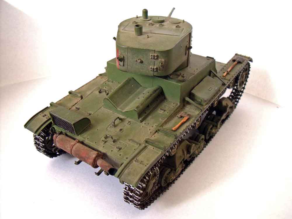 В свое время танк был окрашен обычной нитрокраской при помощи параллонового тампона. Эта окраска и осталась, как и старые декали. Были заменены родные (отвратительные, капроновые) гусеницы на траки от Хобби Босс (кстати отличные, рабочие траки), из зубочисток и жести сделан новый шанцевый инструмент, а так же вставлена нормальная решетка и доработан глушитель. Затем модель я "подпудрил" для придания ей живости и она заняла достойное место в моей кеоллекции. Надеюсь найдет она свое место и на Каропке.