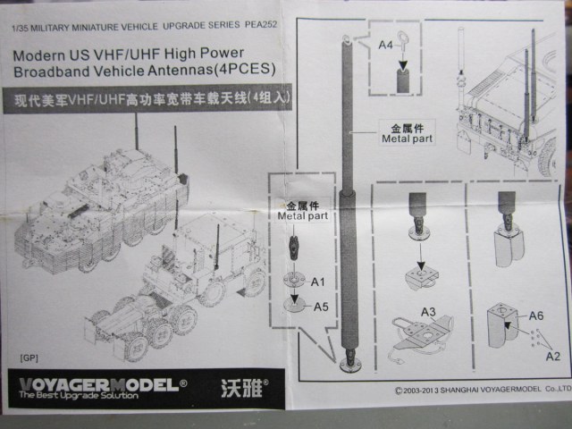 Небольшой наборчик широкополосных антенн на американскую технику. В наборе четыре антенны, четыре пружинных амортизатора веретёнообразной формы, четыре металлических основания антенн, плата фото травления, пластиковый пруток, инструкция на одном листе формата А4. Упаковано все добротно, в стиле VoyagerModel.