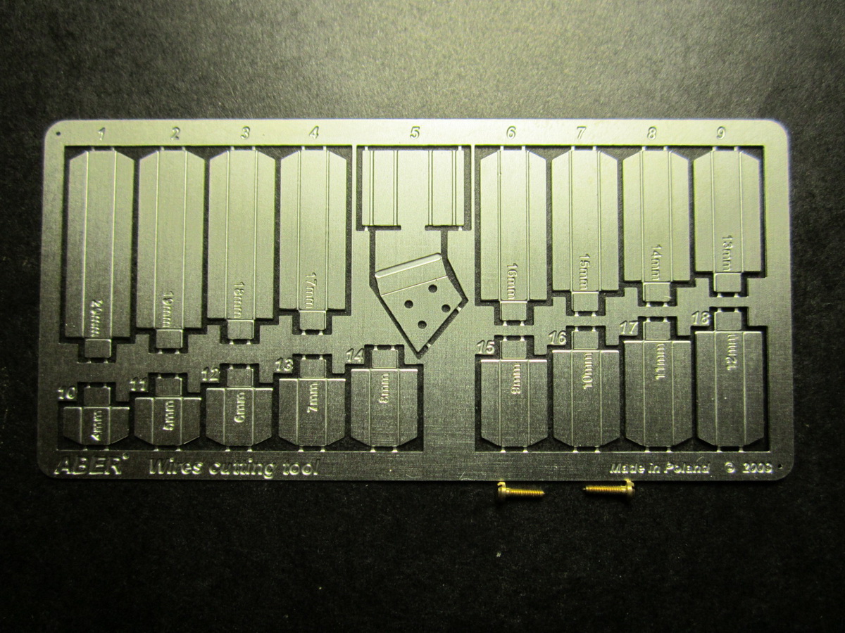 Приобрел себе такой инструмент для нарезки проволоки. Представляет из себя кондуктор с набором шаблонов для нарезки сегментов проволоки. Изготавливается за полчаса. Получаем 17 шаблонов от 4 до 20мм с шагом 1мм. Правда, тот метод, которым предлагает воспользоваться производитель меня не впечатлил... :-) Не нашлось у меня подходящих ножниц для закрепления полученной конструкции. Да хлипковато она, конструкция крепиться к тем самым ножницам. Сами шаблоны, считаю полезными. Особенно для нарезания проволоки для сборки металлических траков. Да мало ли чего в нашем деле приходится нарезать в "массовом порядке" заданной длины.
