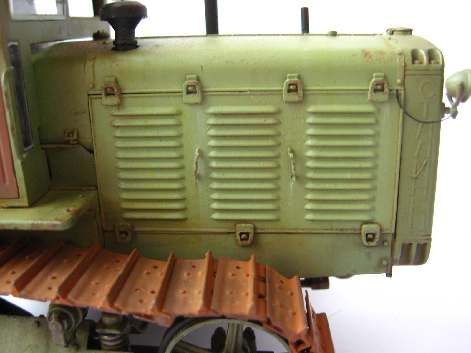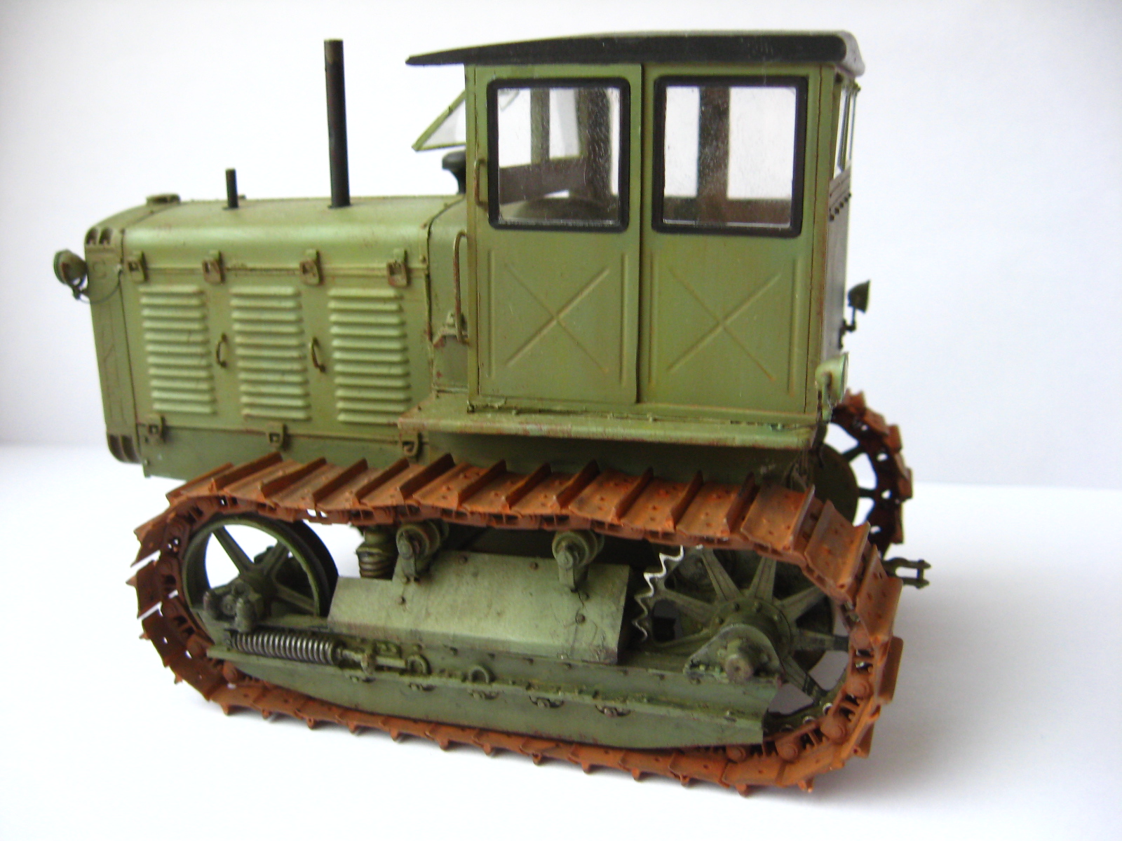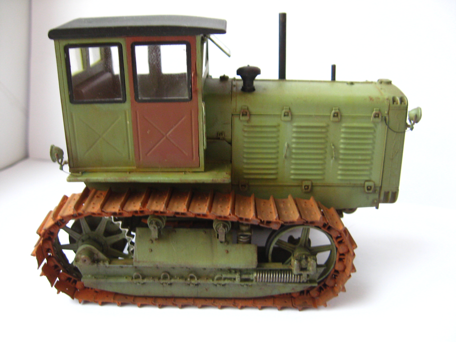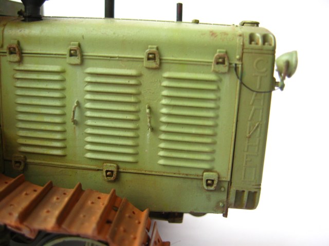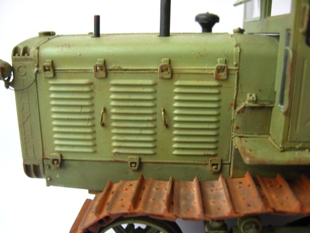 Одна капля дегтя в бочке меда, это гусеницы, очень яркая, очень монотонная ржа, такой не бывает особенно в контрасте с ведущим колесом которое только что ехало. Как Анонимус несколько связанный с тракторами в период СССР (Эх давно это было...) кузовных деталей в грунте не было, их вообще просто не было. Ежели что случалось с дверью или капотом то 1-й ремонт просто забить на все, 2-й ремонт пара ударов кувалдой и сварка без окраски, 3-й ремонт пойти на кладбище и снять необходимую железку с металлолома и поставить. Это все к тому что если хотите выделить какую либо деталь на сх технике она должна быть максимально уставшей от жизни и такого же цвета но другого оттенка. Не знаю точно как со Сталинцами но в мою пору все подобного рода техника выпускалась в одном, строго установленном для своего вида коллере. Вариации по моему были только у ДТ-75 в базе и спецтехники на других шасси.