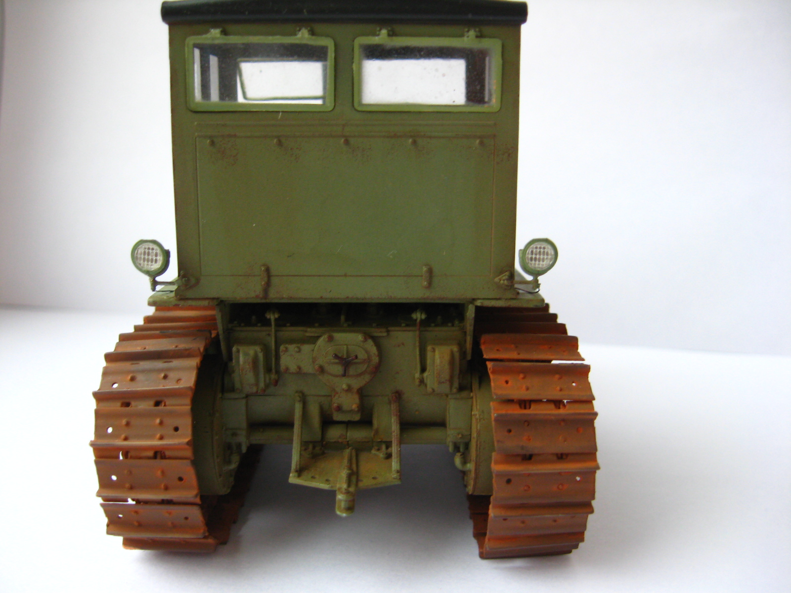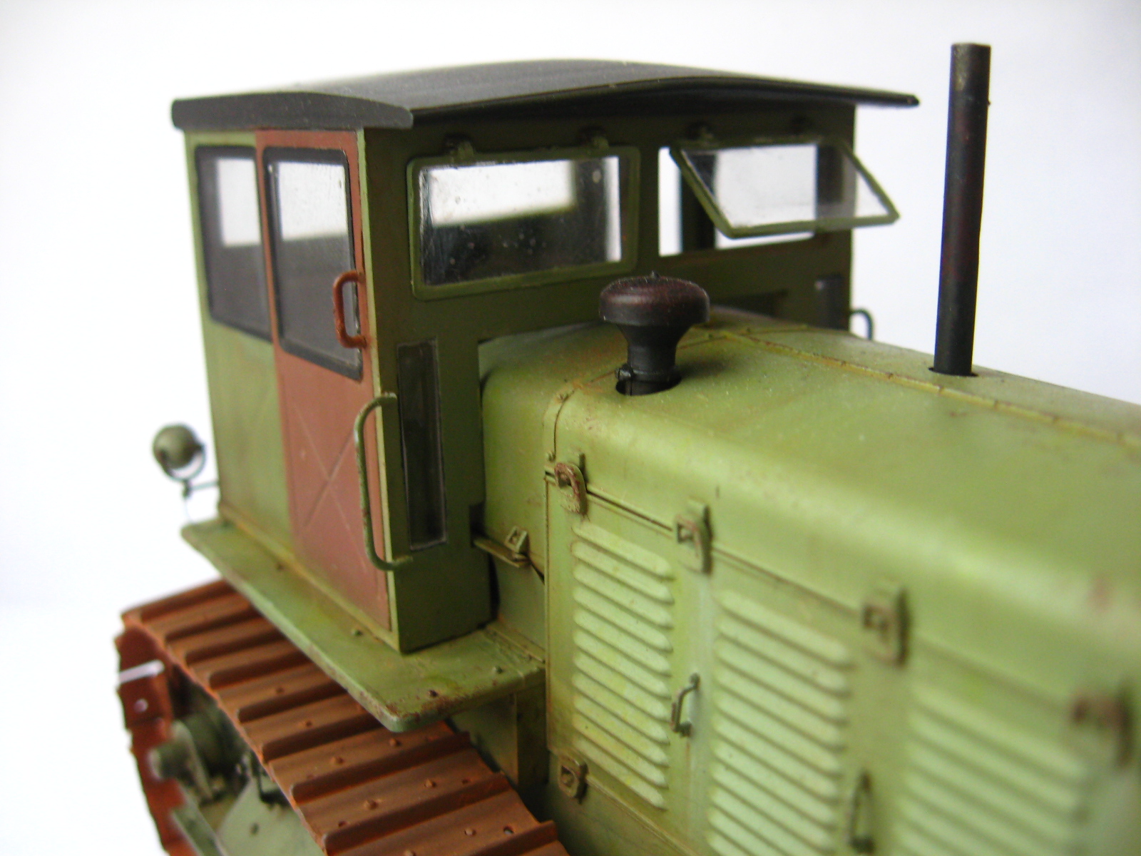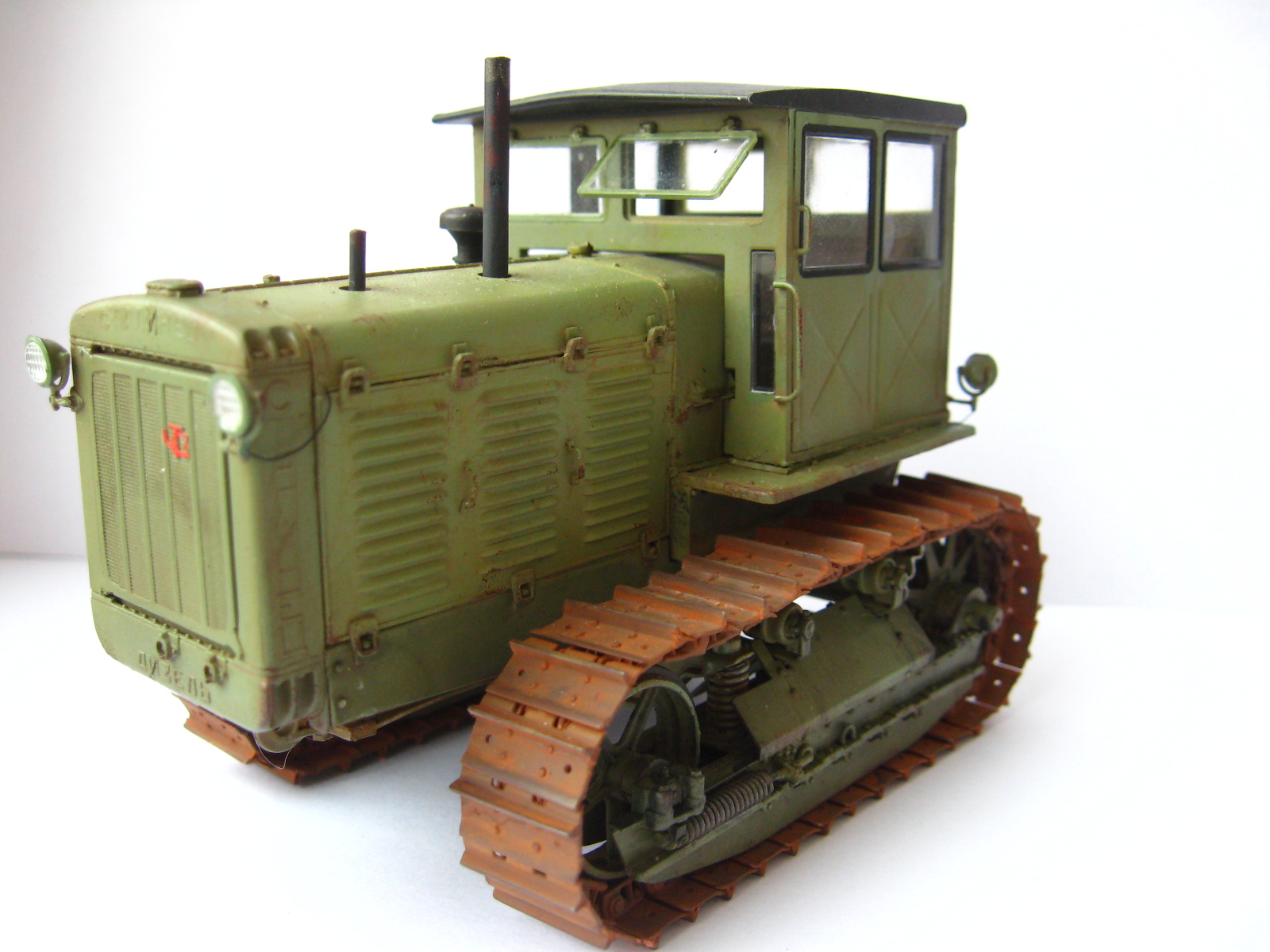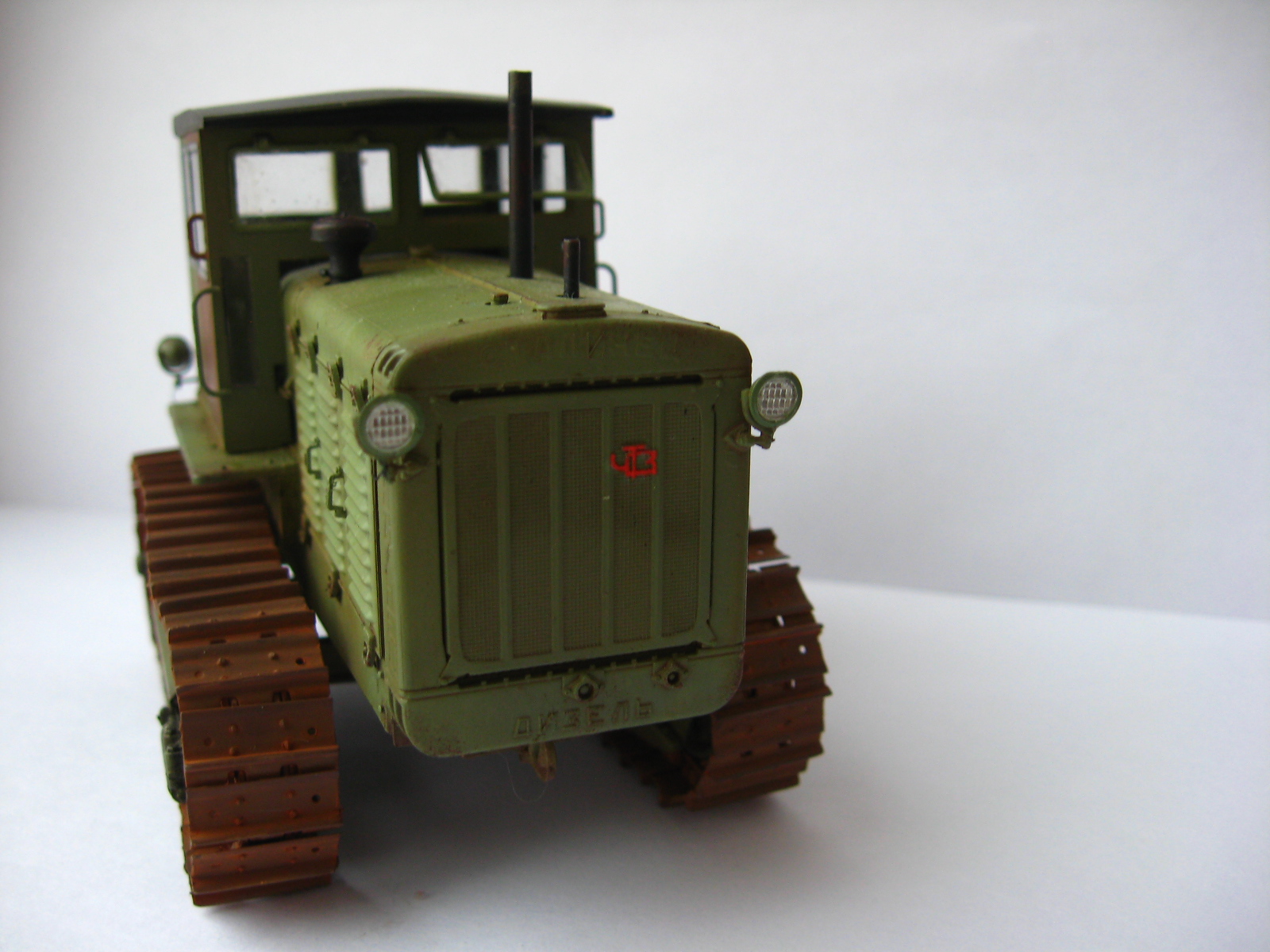 Одна капля дегтя в бочке меда, это гусеницы, очень яркая, очень монотонная ржа, такой не бывает особенно в контрасте с ведущим колесом которое только что ехало. Как Анонимус несколько связанный с тракторами в период СССР (Эх давно это было...) кузовных деталей в грунте не было, их вообще просто не было. Ежели что случалось с дверью или капотом то 1-й ремонт просто забить на все, 2-й ремонт пара ударов кувалдой и сварка без окраски, 3-й ремонт пойти на кладбище и снять необходимую железку с металлолома и поставить. Это все к тому что если хотите выделить какую либо деталь на сх технике она должна быть максимально уставшей от жизни и такого же цвета но другого оттенка. Не знаю точно как со Сталинцами но в мою пору все подобного рода техника выпускалась в одном, строго установленном для своего вида коллере. Вариации по моему были только у ДТ-75 в базе и спецтехники на других шасси.