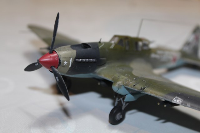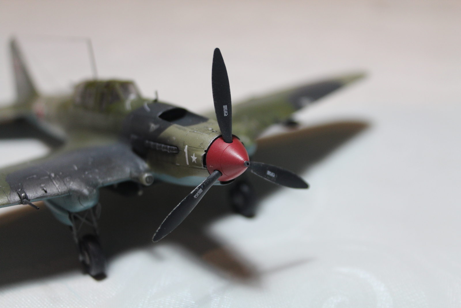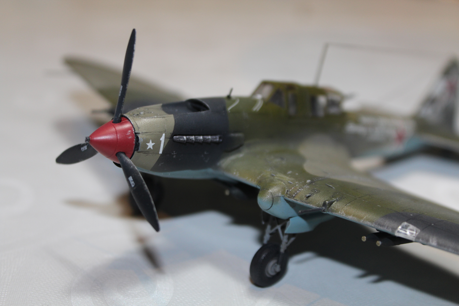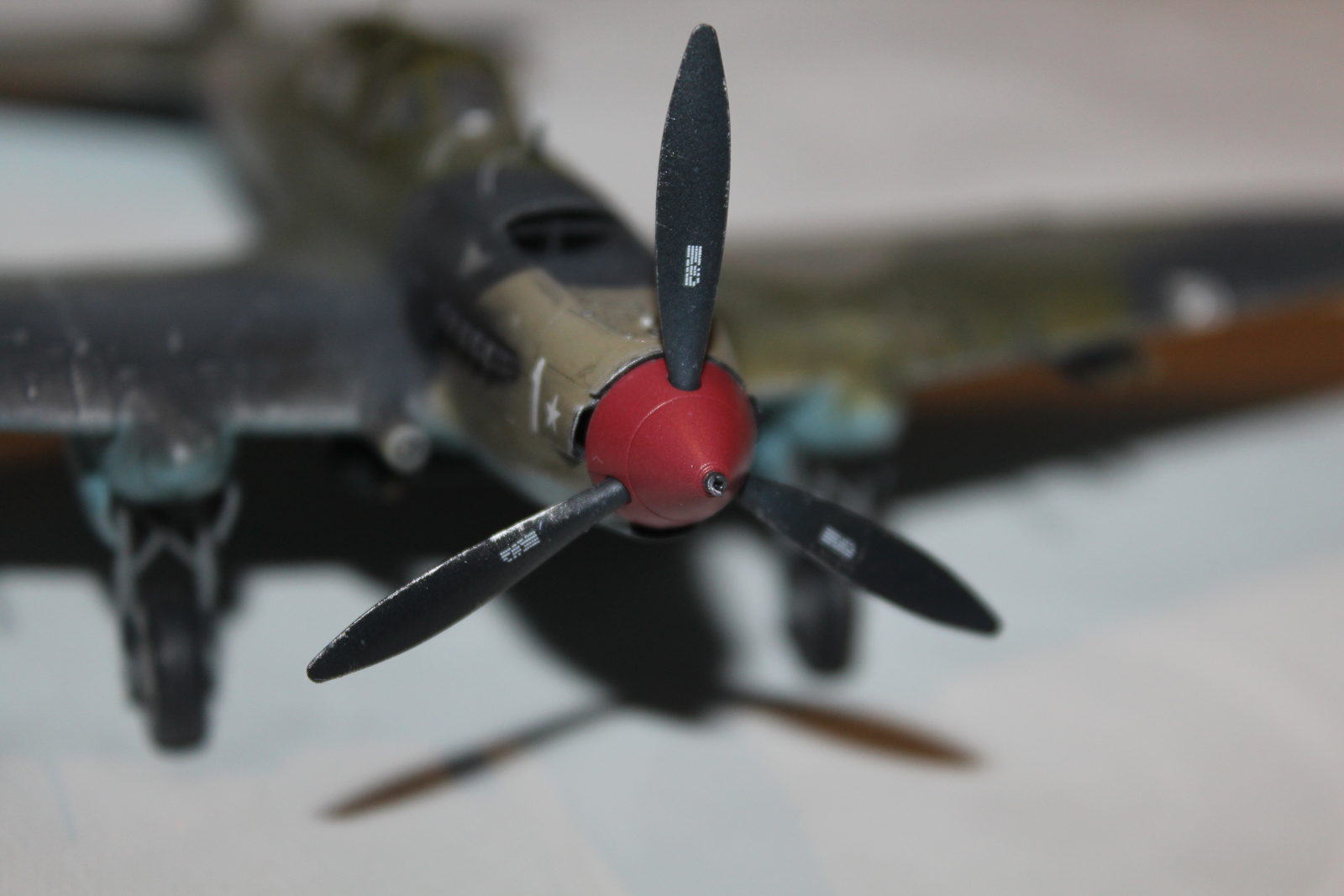 Лично я копоть за РСами делаю, только без фанатизма, самую малость... Чёрные выхлопные патрубки - не по "феншую". В следующий раз, сперва покрась в коричневый и сильно разведённым чёрным тонируй до нужного оттенка, ну или что-то в подобном духе. Так же за базовый цвет для патрубков можно взять и серебряный и на него наносить "ржавчину" и "копоть". Чёрная краска в воздухозаборниках за коком винта, сильно контрастирует, для предания глубины, чёрный нужно наносить перед покраской. Козырёк защищающий от масла, который над коком винта - сильно массивный, как будто из восьми миллиметровой сталюки. Колёса сильно чистые!