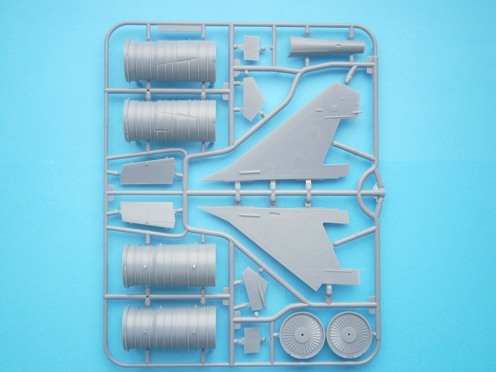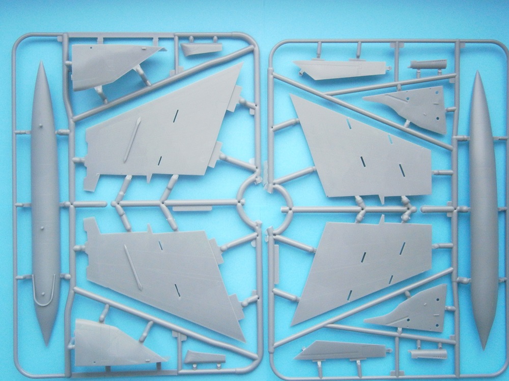 В красочной картонной каробке находится двенадцать литников с деталями серого цвета и один литник из прозрачного пластика это детали остекления фонаря кабины пилота и посадочной и рулежной фары. Теперь рассмотрим все поподробнее содержимого набора.