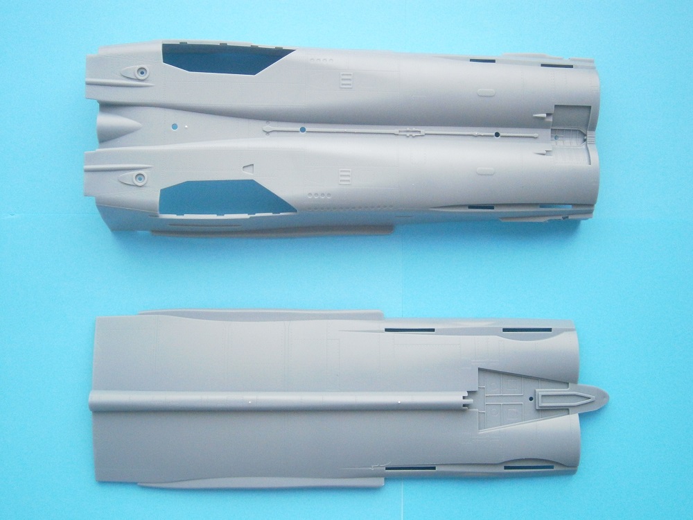 Фюзеляж модели выполнен из двух половинок, имеется довольно тоненький не глубокий крой ,думаю кое где придется пройтись скрайбером по расшивке. Также что порадовало, имеется на деталях наличие технологических и эксплуатационных лючков и заклепочных швов.