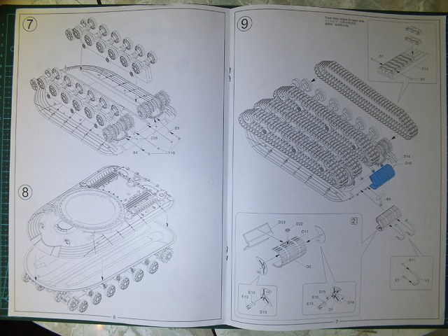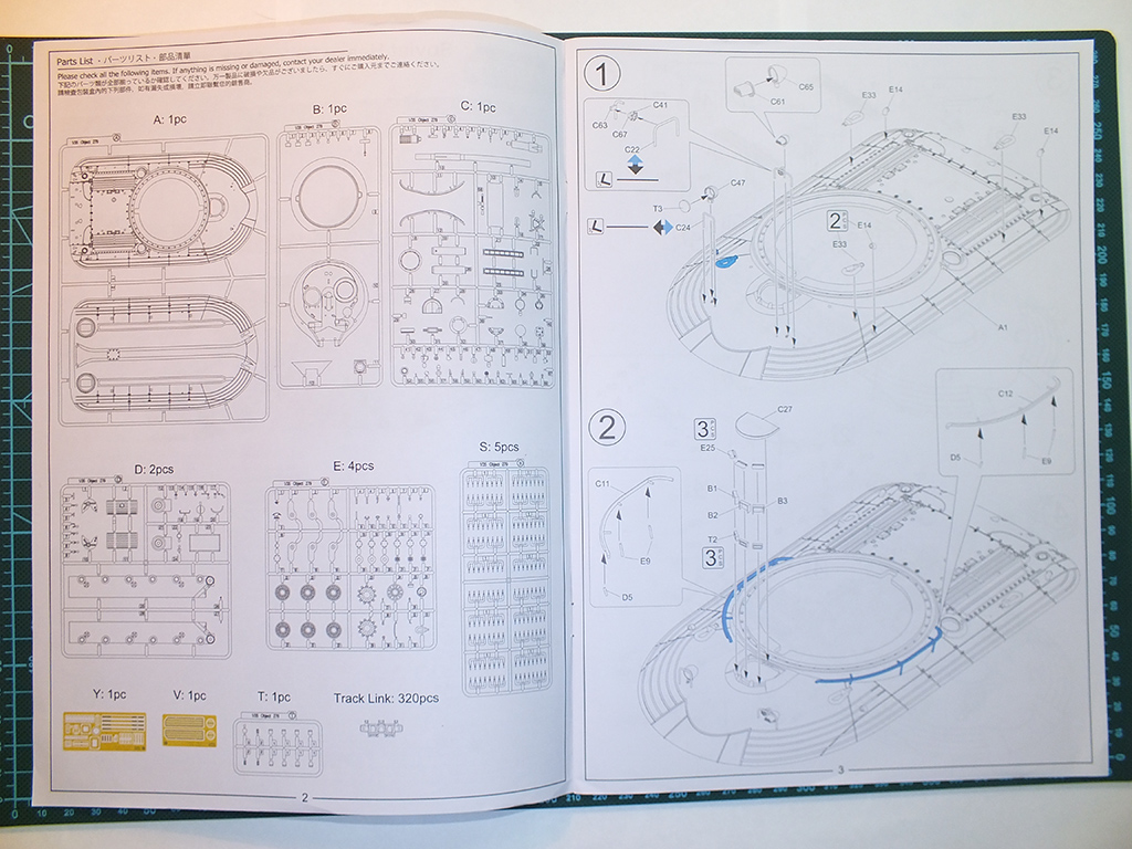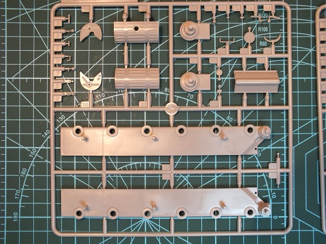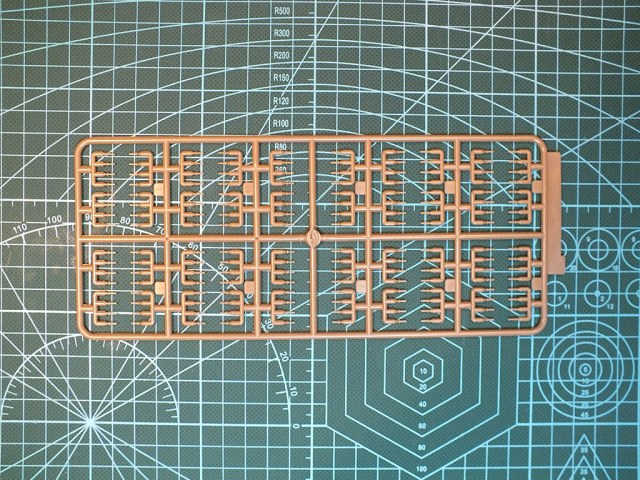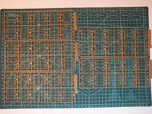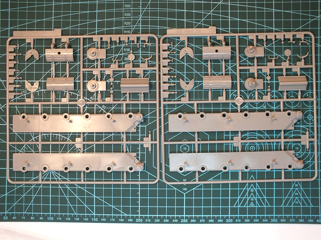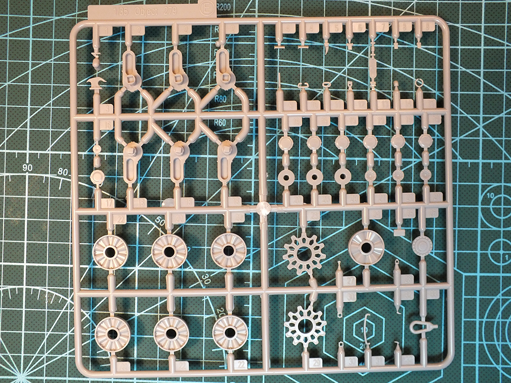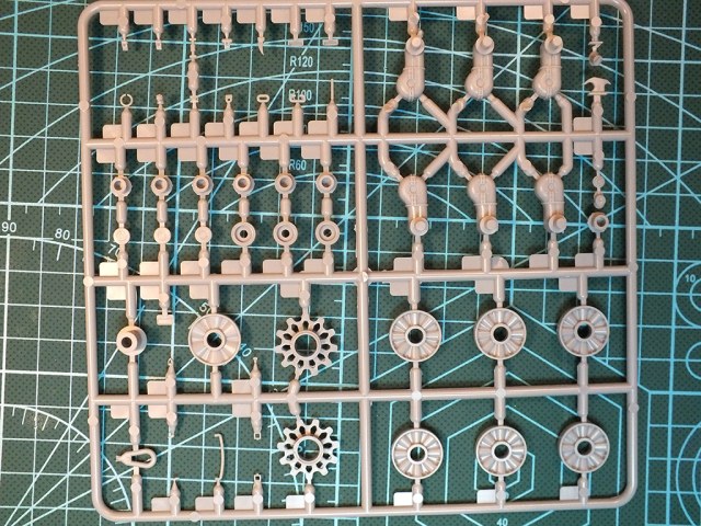 В коробке – 9 литников из серого пластика (довольно твердого, некоторые детали в результате тряски в посылке откололись от литников), 1 маленький прозрачный литник, 2 небольшие платы фототравления, пакетик с траками к наборным гуслям (320 штук), «пальцы» для их соединения на 5 литниках светло-коричневого цвета (800 штук) и небольшой кусочек проволоки. Литники (без облоя и утяжин) - упакованы в прозрачные пакеты. Декалей в наборе нет, видимо ввиду штучного производства оригинала. Инструкция на 12 страницах (почему-то в коробке их оказалось 2 штуки) – есть английский язык. В инструкции нет вариантов покрасок. Все это упаковано в плотную картонную коробку.