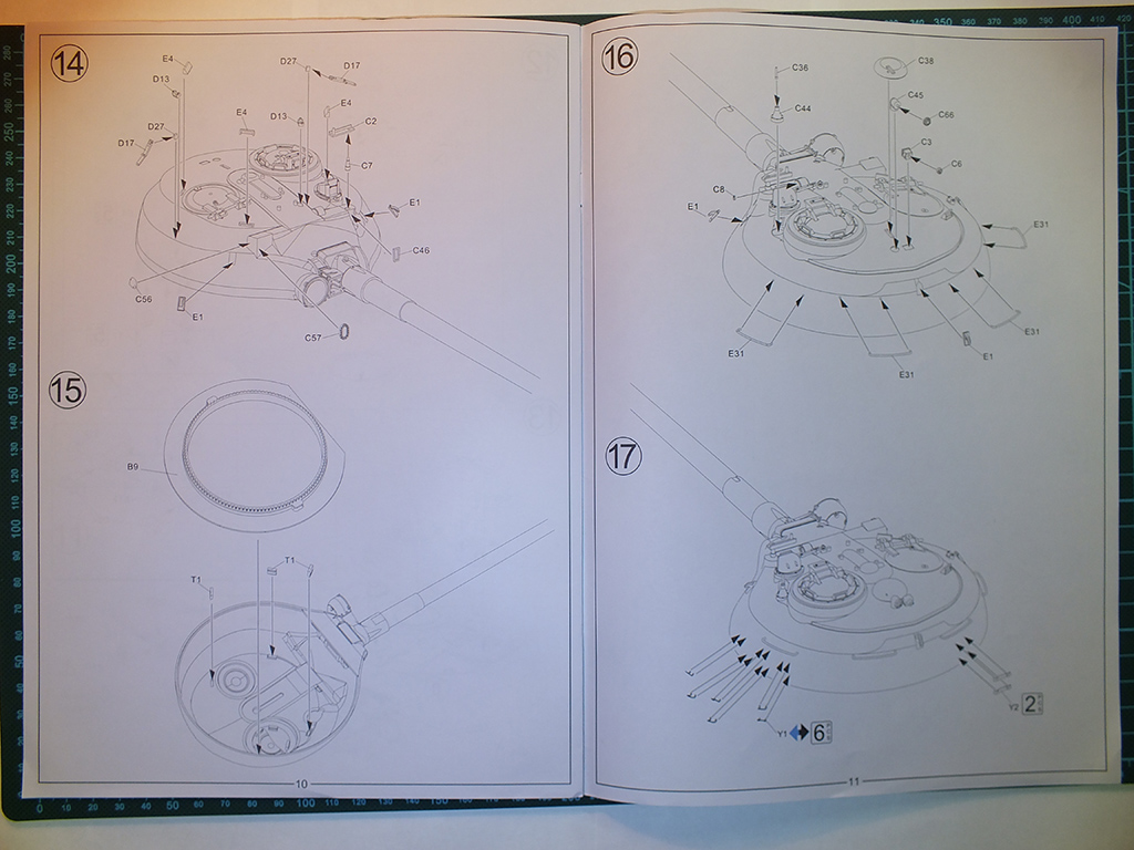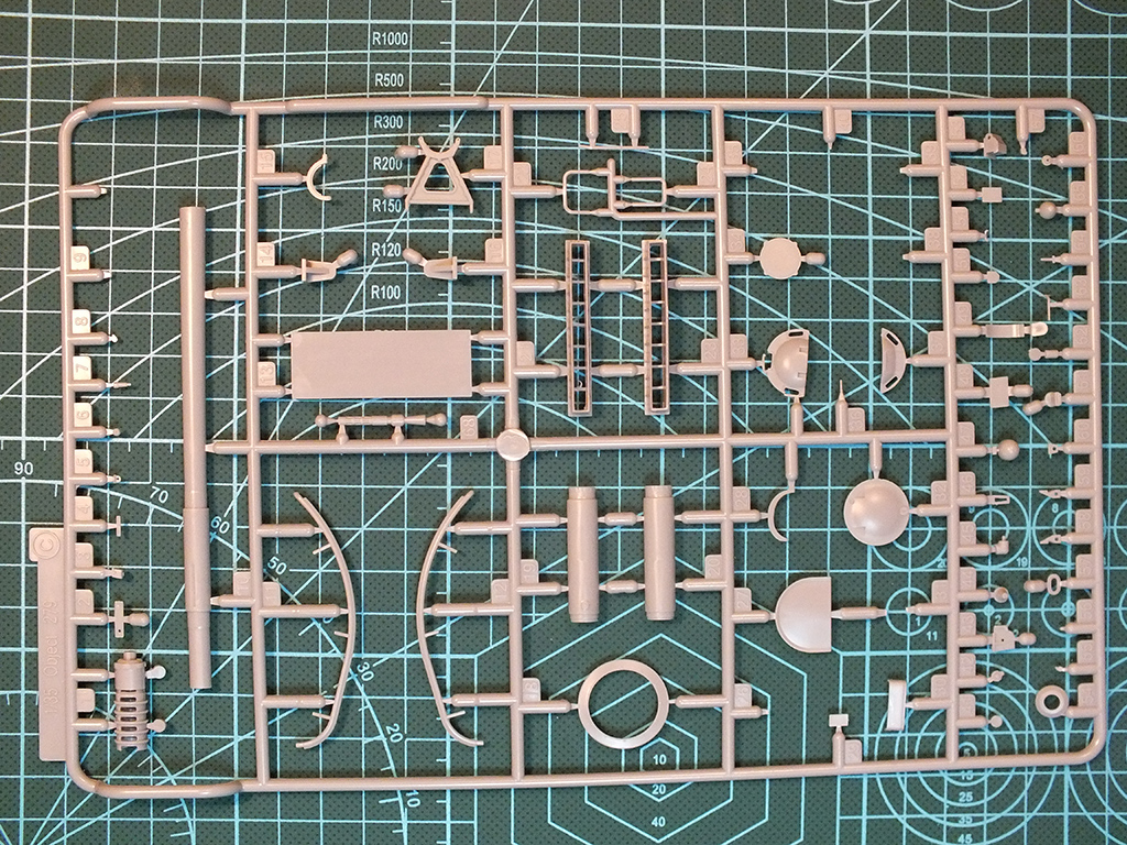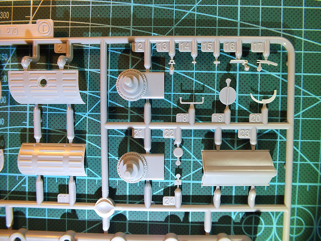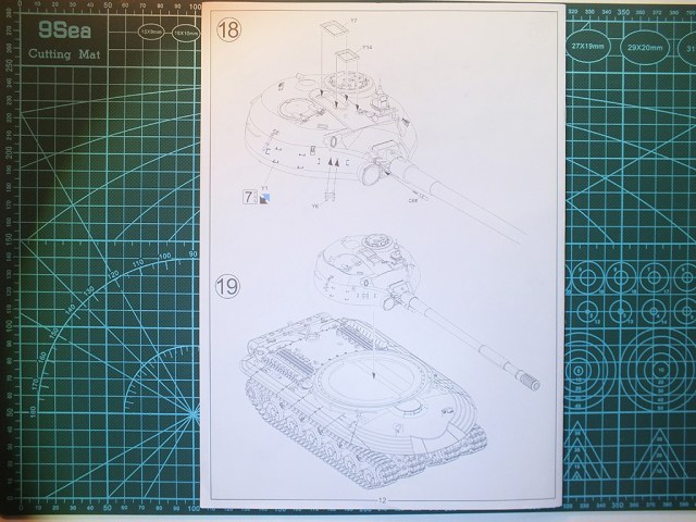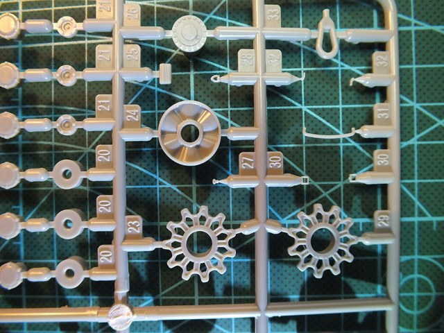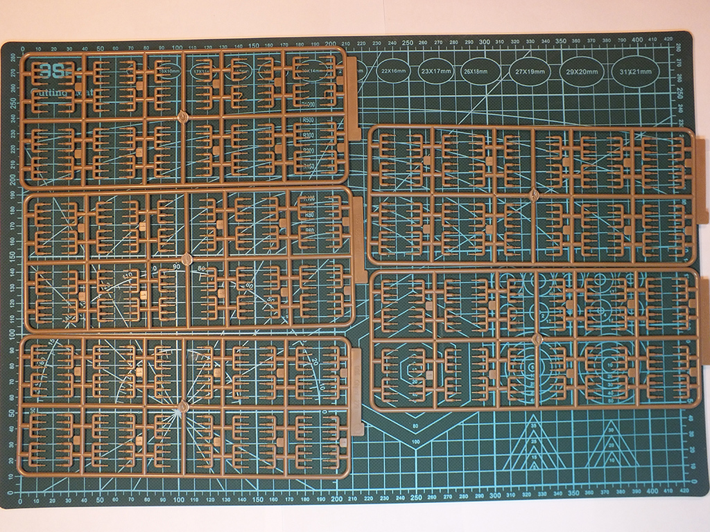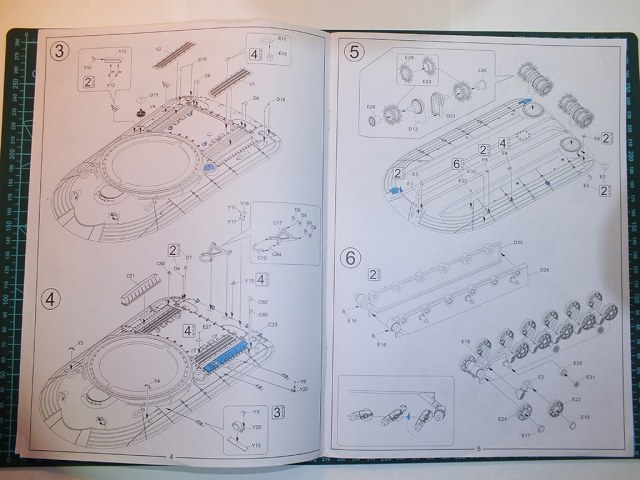 В коробке – 9 литников из серого пластика (довольно твердого, некоторые детали в результате тряски в посылке откололись от литников), 1 маленький прозрачный литник, 2 небольшие платы фототравления, пакетик с траками к наборным гуслям (320 штук), «пальцы» для их соединения на 5 литниках светло-коричневого цвета (800 штук) и небольшой кусочек проволоки. Литники (без облоя и утяжин) - упакованы в прозрачные пакеты. Декалей в наборе нет, видимо ввиду штучного производства оригинала. Инструкция на 12 страницах (почему-то в коробке их оказалось 2 штуки) – есть английский язык. В инструкции нет вариантов покрасок. Все это упаковано в плотную картонную коробку.