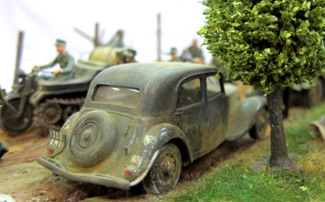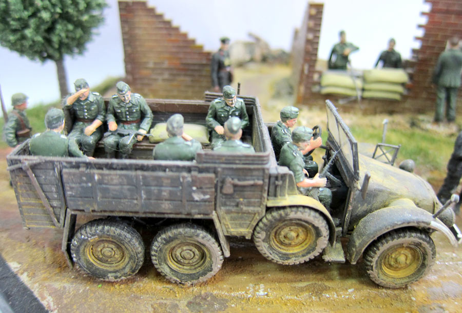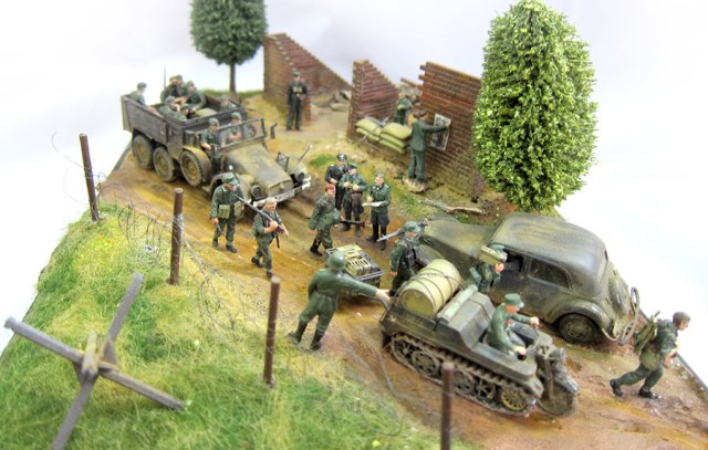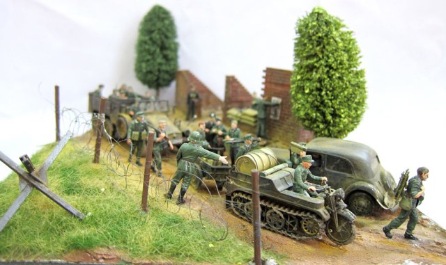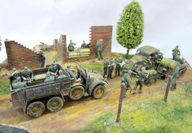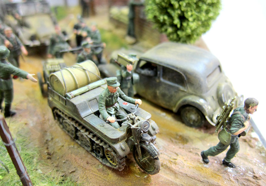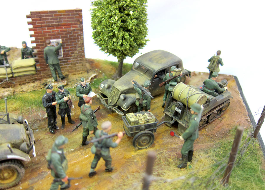 Вся техника - Tamiya (полугусенечный мотоцикл Kettenkraftrad с тележкой, машина Citroen Traction 11CV, машина 6х4 Krupp Protze (Kfz.70). Фигурки Tamiya: Немецкие солдаты: 7 пулеметчиков на марше, 2 пехотинца, 3 танкиста, 2 офицера и полицейский. Аксесуары Tamiya: Набор противотанковых ежей, мешков с песком и кирпичных стен. Покрашено все эмалевыми красками Tamiya. Основа сделана из гипса, залитого в заранее подготовленную деревянную основу, покрашена, нанесен грунт (трава), доработал позже грязью и пылью.