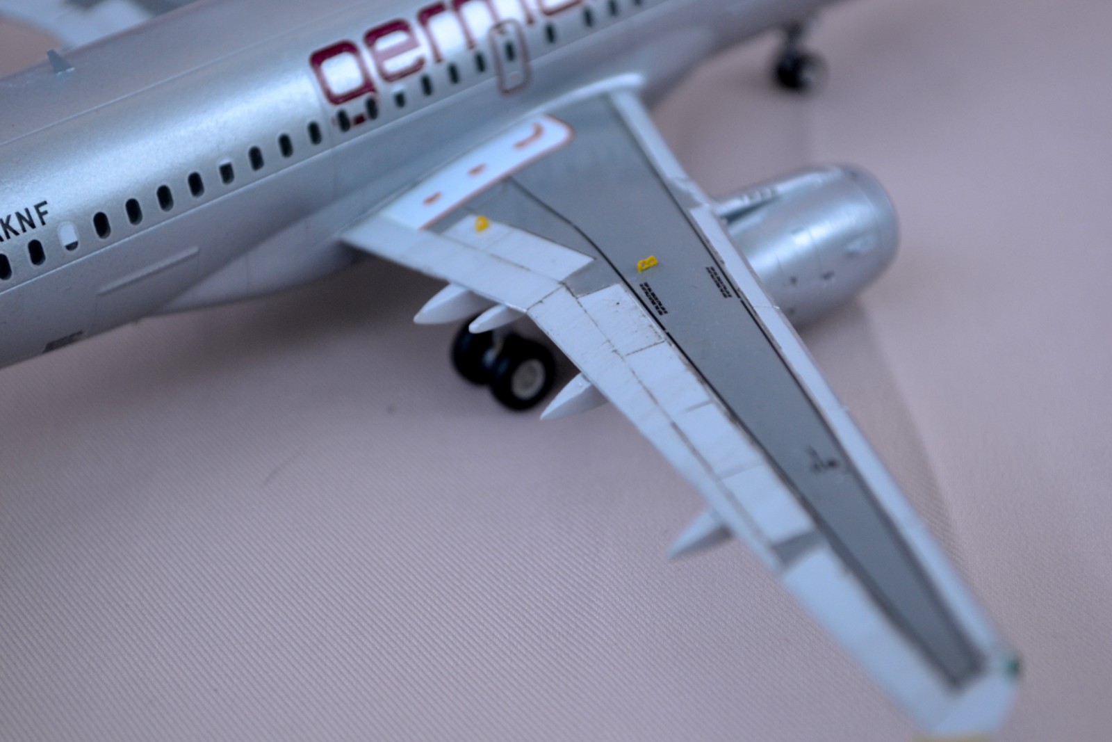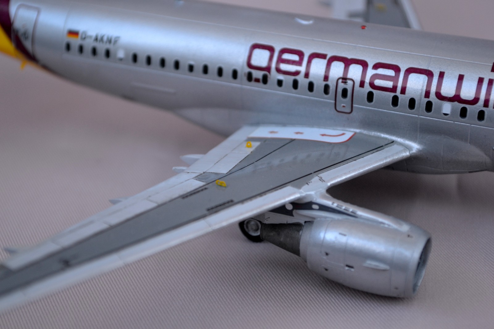 Окраска: у Germanwings фюзеляж окрашен перламутром - поступил следующим образом: на базовый серый нанёс смесь глянцевого лака и серебрянки. Результат в общем удовлетворил, хотя есть ещё к чему стремиться). С лобовым стеклом у меня снова не вышло на семействе А320 - после шпаклевки и снятия масок получилось нечто, похожее на амбразуру. В итоге залепил декалью.