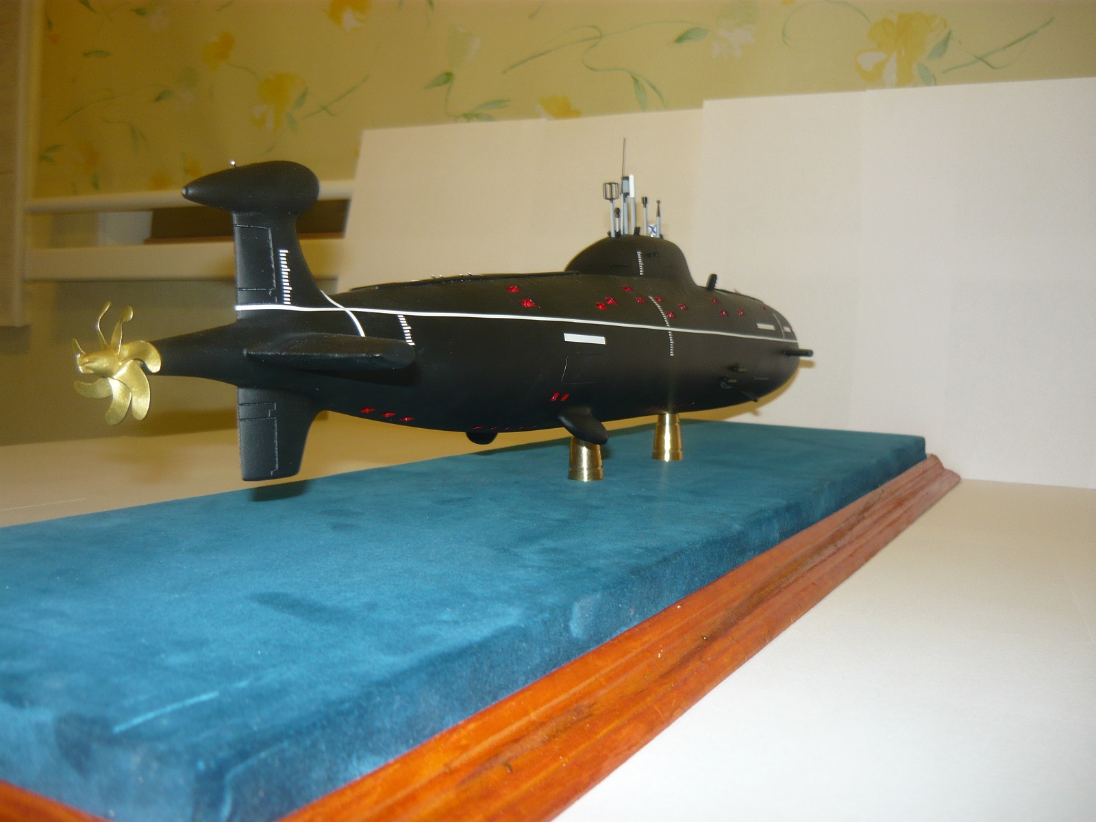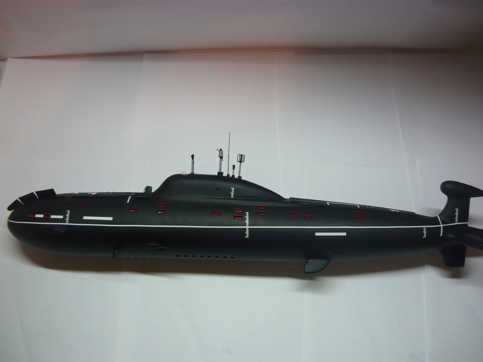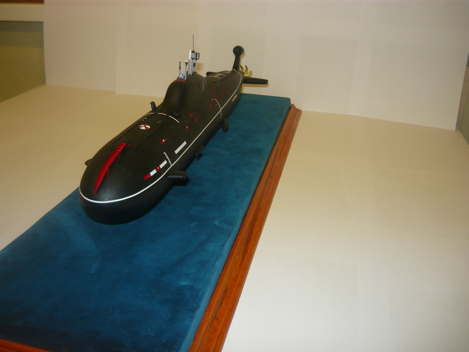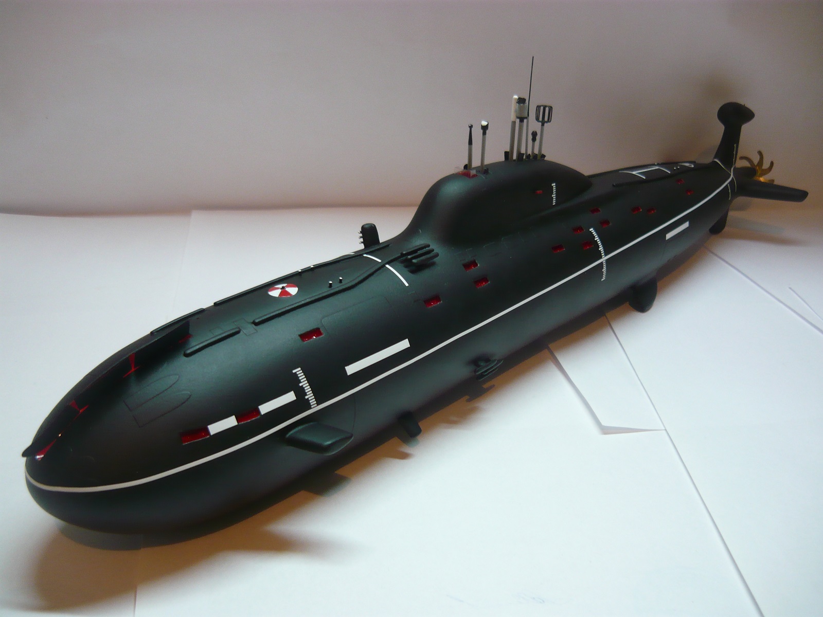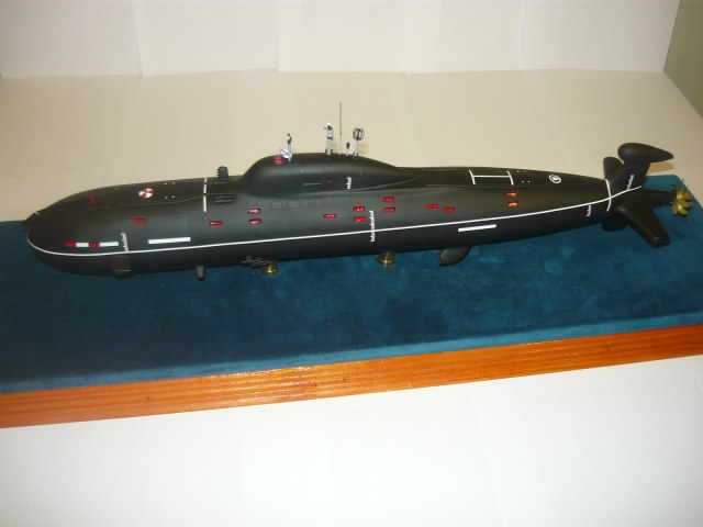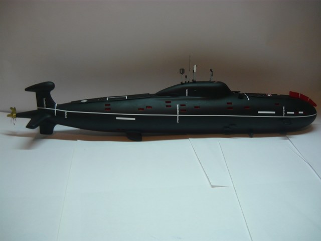 - обычно лодки 971 проекта красили низ до середины красный (необрастайка), верх черный (резиновое покрытие), поэтому полностью черная лодка вызывает сомнения, но опять же я не уверен на 100%, если у Вас есть информация по этому вопросу, буду признателен;
