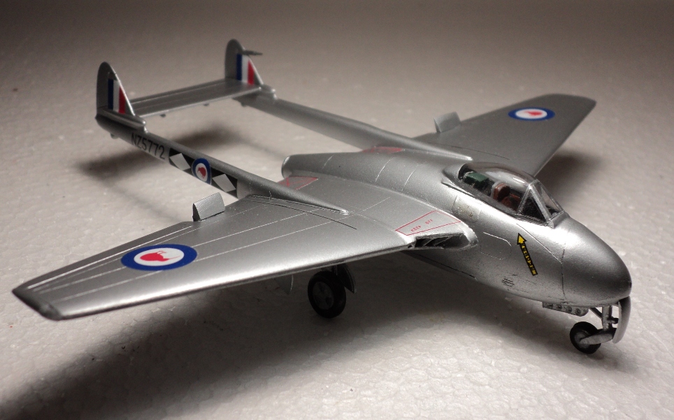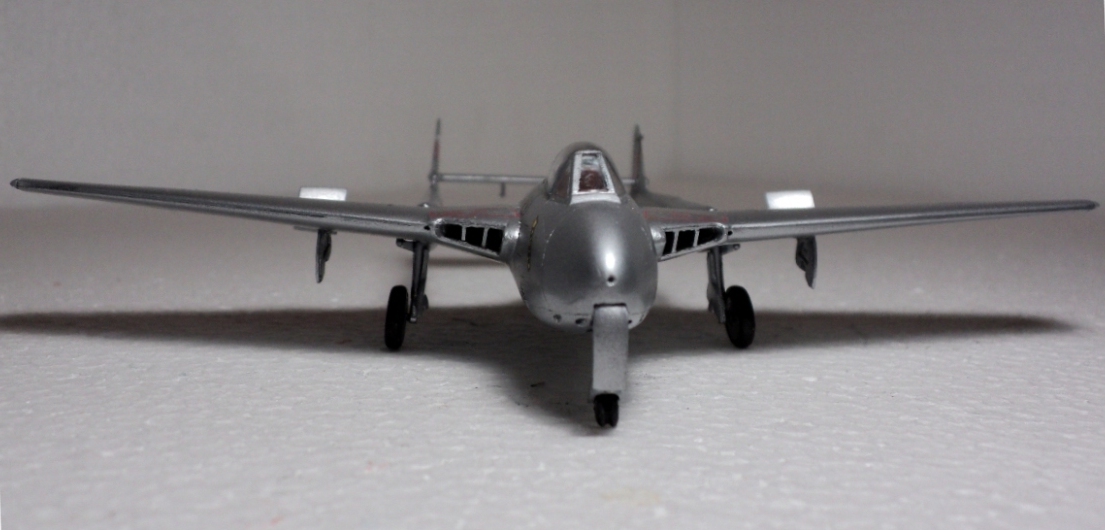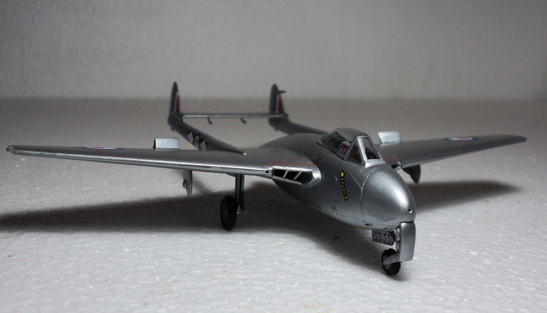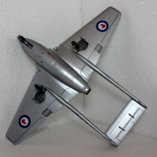 Модель я уже критиковал: несмотря на хорошее качество модели, собиралась у меня она с большими проблемами - щели и ступеньки в лучших традициях раннего Амодела образовывались везде, и в процессе сборки я бесконечно долго слой за слоем шпаклевал и шлифовал, так как Вампир покрашенный в «металлик» обязательно выдал все мои недоработки. Нос и вовсе оказался слишком узким, но фюзеляж всё-ж был недостаточно широк, чтобы туда влез интерьер. Нишам шасси не хватало детализации, а механизм их уборки отсутствовал. Впрочем, отлить его на качественном уровне при ЛНД всё равно невозможно.