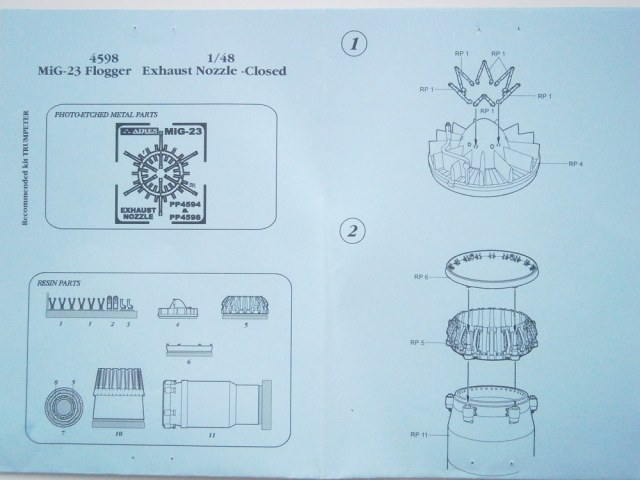 В наборе находится семь деталей из смолы светло-серого цвета, отличного качества, все детали очень хорошо детализированы и имеют очень достойную проработку мелочевки и мелких агрегатов форсажной камеры и сопла . Также в наборе есть одна плата фототравления с одной деталью,которая представлена ниже на фото . Инструкция очень понятная и читается легко ,выполнена на одном складном листе. Данный набор отлично дополнит модель самолета,а в частности двигательный отсек самолета МИГ-23 от TRUMPETER . Приобретением данного набора я очень доволен, благодаря моему другу и коллеге с сайта СКАЛЕМОДЕЛС, Алексею Андриянову !!!