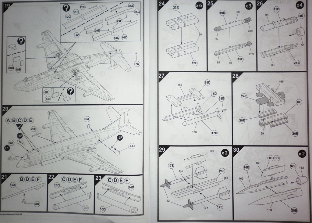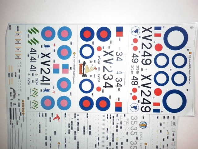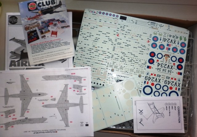 Эта немаленькая коробка забита доверху Тремя рамками с большими деталями планера , тремя рамками поменьше ( из них две одинаковые) с мелочёвкой и вооружением, рамкой с прозрачными деталями , огромным листом декалей , двумя брошюрами (инструкция и схемы окраски), дополнительными корректирующими декалями и буклетом "клуба любителей Аирфикса".