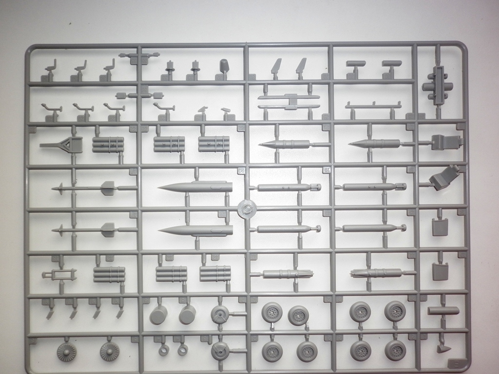 Пластиковых деталей ОЧЕНЬ МНОГО. Модель имеет внутренний крой , скромную , но деталировку шасси и кабины экипажа , огромное количество вооружения для внутренней и внешней подвески.